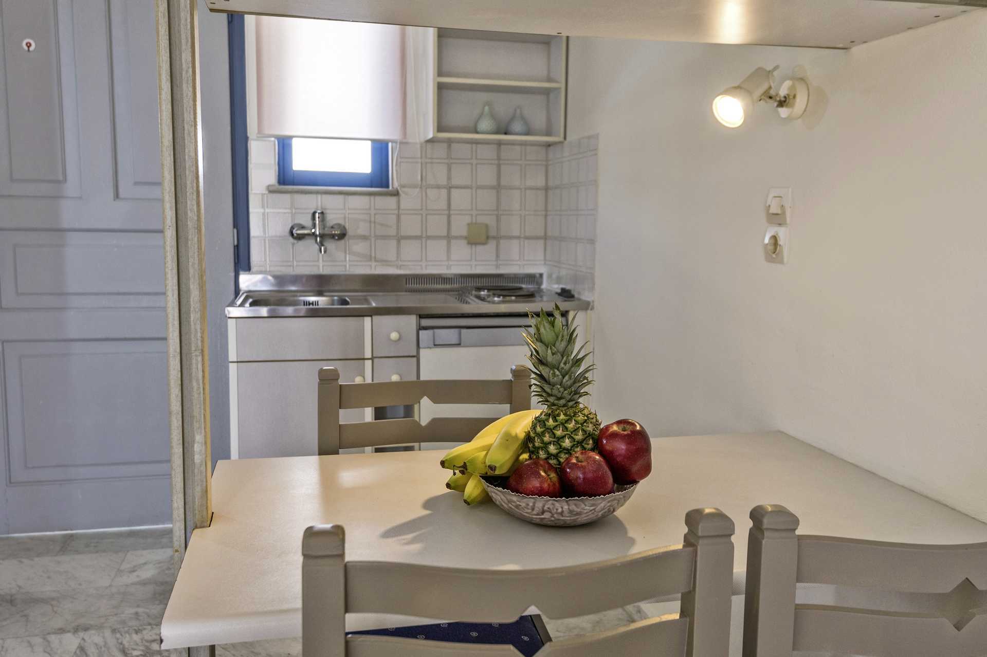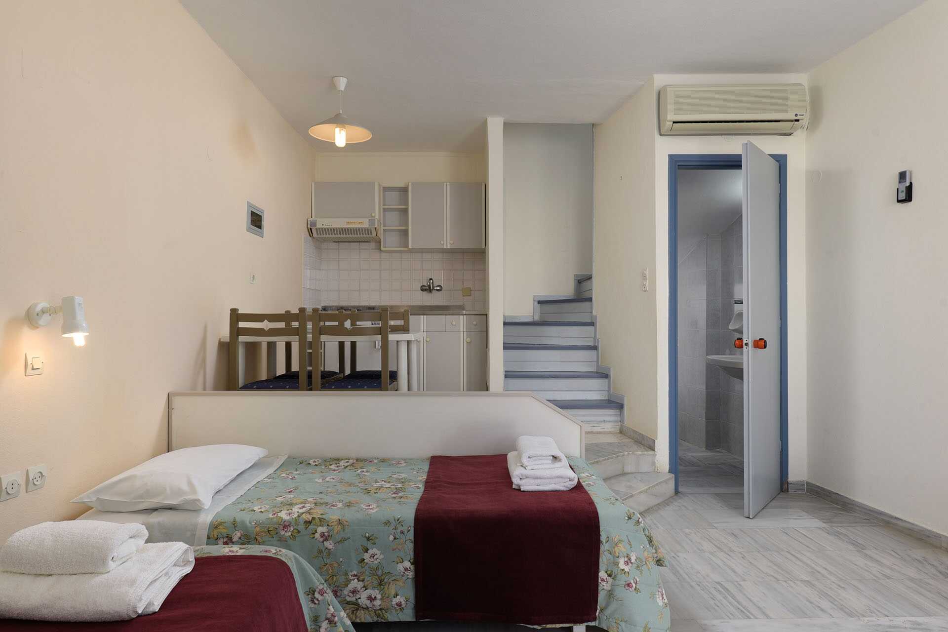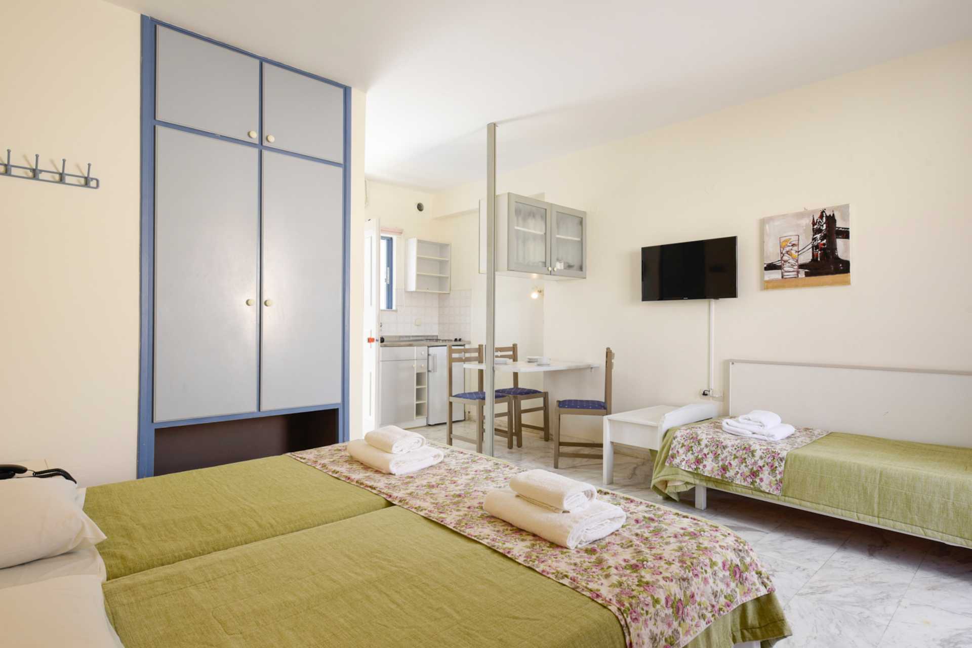 Enrumslägenhet med balkong eller terrass. Kombinerat sovrum med minikök. Två enkelsängar. Möjlighet till extrabädd i bäddsoffa. Minikök med kokplattor, kylskåp, vattenkokare och enkel köksutrustning. Wifi och luftkonditionering ingår. Deponering mot avgift. Tv med internationella kanaler. Hårtork. Badrum med dusch och wc. Städning 6 ggr/vecka.