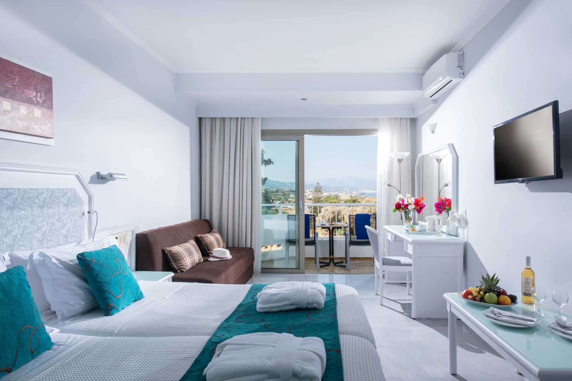 Familjerummen med fyra ordinarie bäddar och balkong eller terrass, vissa med havsutsikt. Rummen ligger i bungalowbyggnaden och vissa av rummen är nyligen renoverade. Rummen består av två sovrum med en dubbelsäng respektive två enkelsängar eller en våningssäng. Wifi och luftkonditionering ingår. Deponering mot avgift. Kylskåp. Vattenkokare samt kaffe och te. Tv med internationella kanaler. Badrockar och tofflor. Hårtork. Badrum med badkar eller dusch samt wc. De renoverade rummen har jacuzzi i badrummet. Städning 7 ggr/vecka.