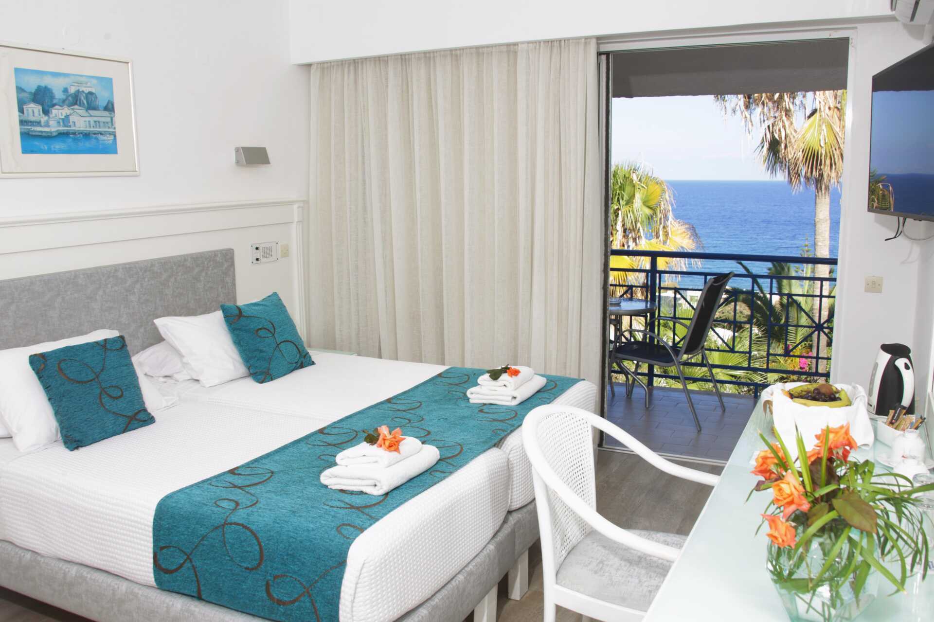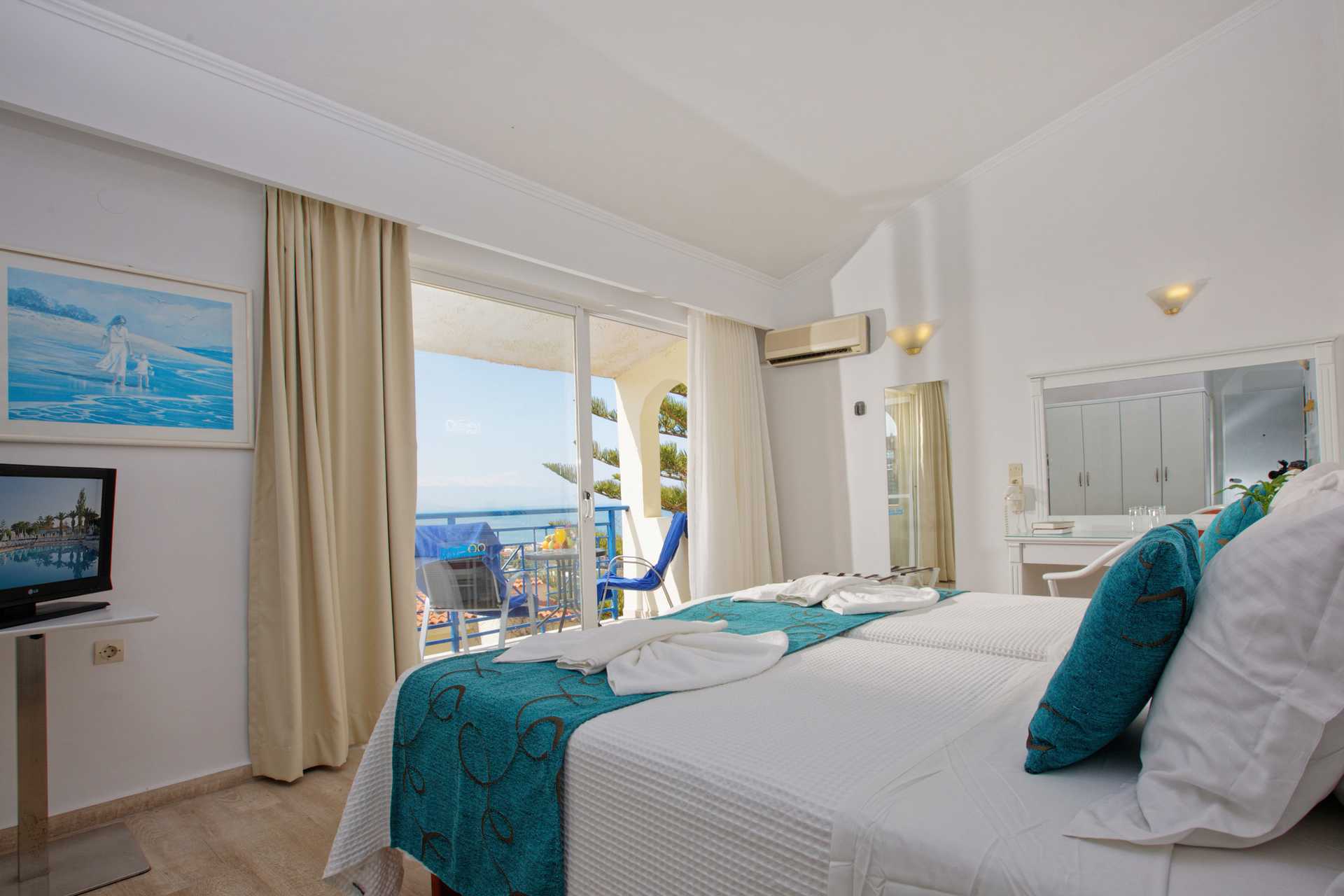 Dubbelrum med balkong eller terrass, vissa med havsutsikt. Rummen ligger antingen i huvudbyggnaden eller i bungalowerna. En dubbelsäng eller två enkelsängar. Möjlighet till extrabäddar i bäddsoffa. Wifi och luftkonditionering ingår. Deponering mot avgift. Kylskåp. Vattenkokare samt kaffe och te. Tv med internationella kanaler. Badrockar och tofflor. Hårtork. Badrum med badkar eller dusch samt wc. Städning 7 ggr/vecka.