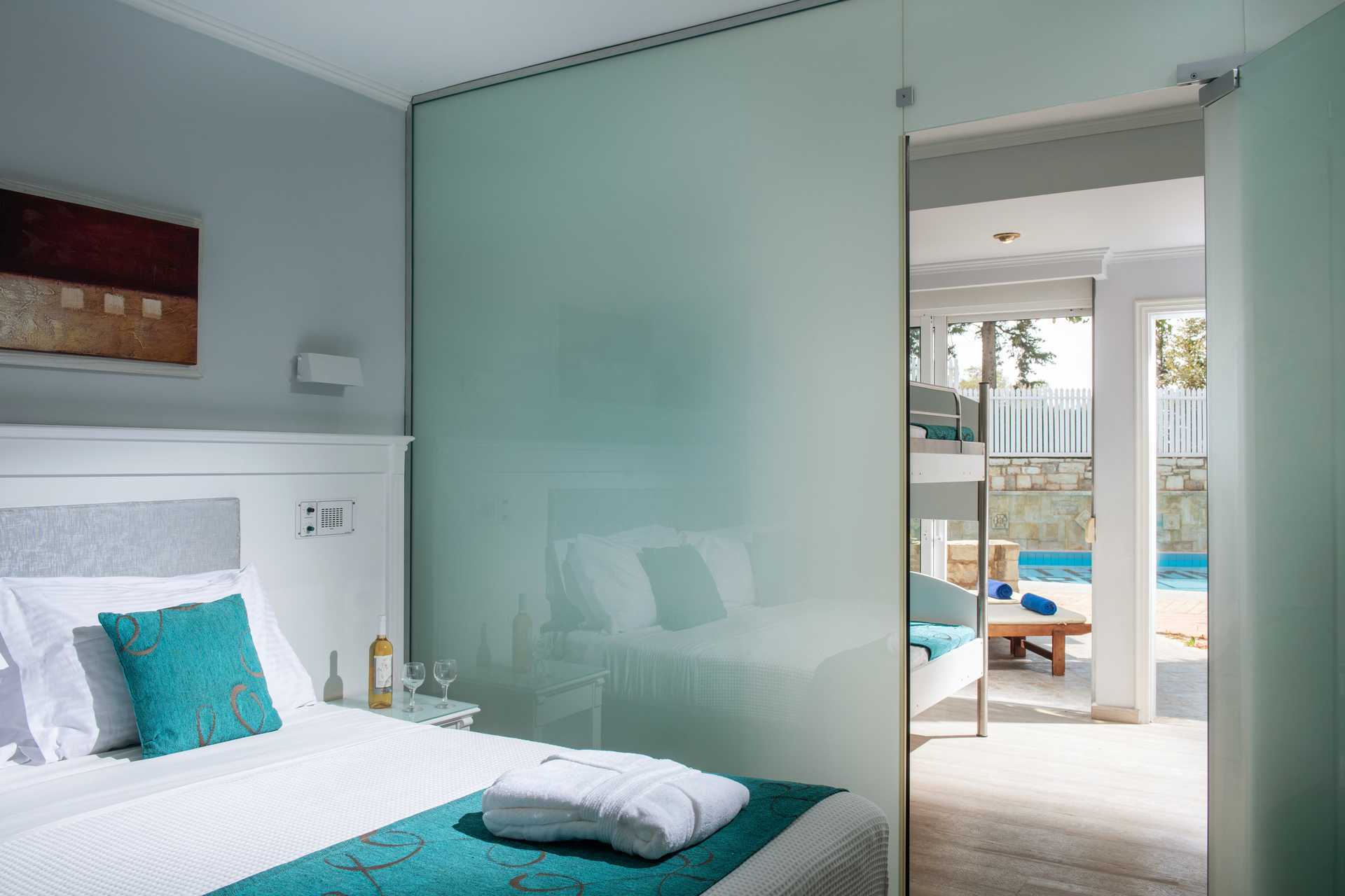 Familjerum med en privat pool på markterrassen. Rummen består av ett sovrum med en dubbelsäng och ett rum med två enkelsängar eller en våningssäng. Wifi och luftkonditionering ingår. Deponering mot avgift. Kylskåp. Vattenkokare samt kaffe och te. Tv med internationella kanaler. Hårtork. Badrum med badkar eller dusch samt wc. Städning 7 ggr/vecka.