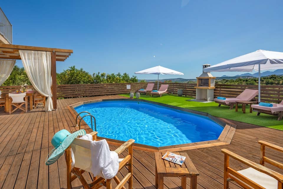 Den inbjudande privata poolen står i centrum med utsikt över det kuperade gröna landskapet. På de omgivande solstolarna kan du baka och rotera tills den gyllene solen börjar gå ner. För att undkomma mitt på dagens värme erbjuder parasoller och en skuggig pergola den perfekta vilan. Från balkongen kan du njuta av panoramautsikten över Grekland från höjden och ta en stund för att insupa omgivningarna.