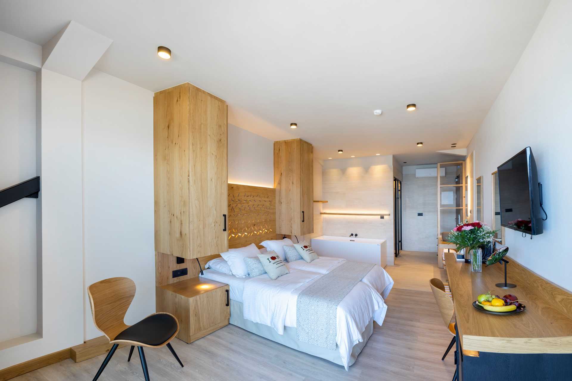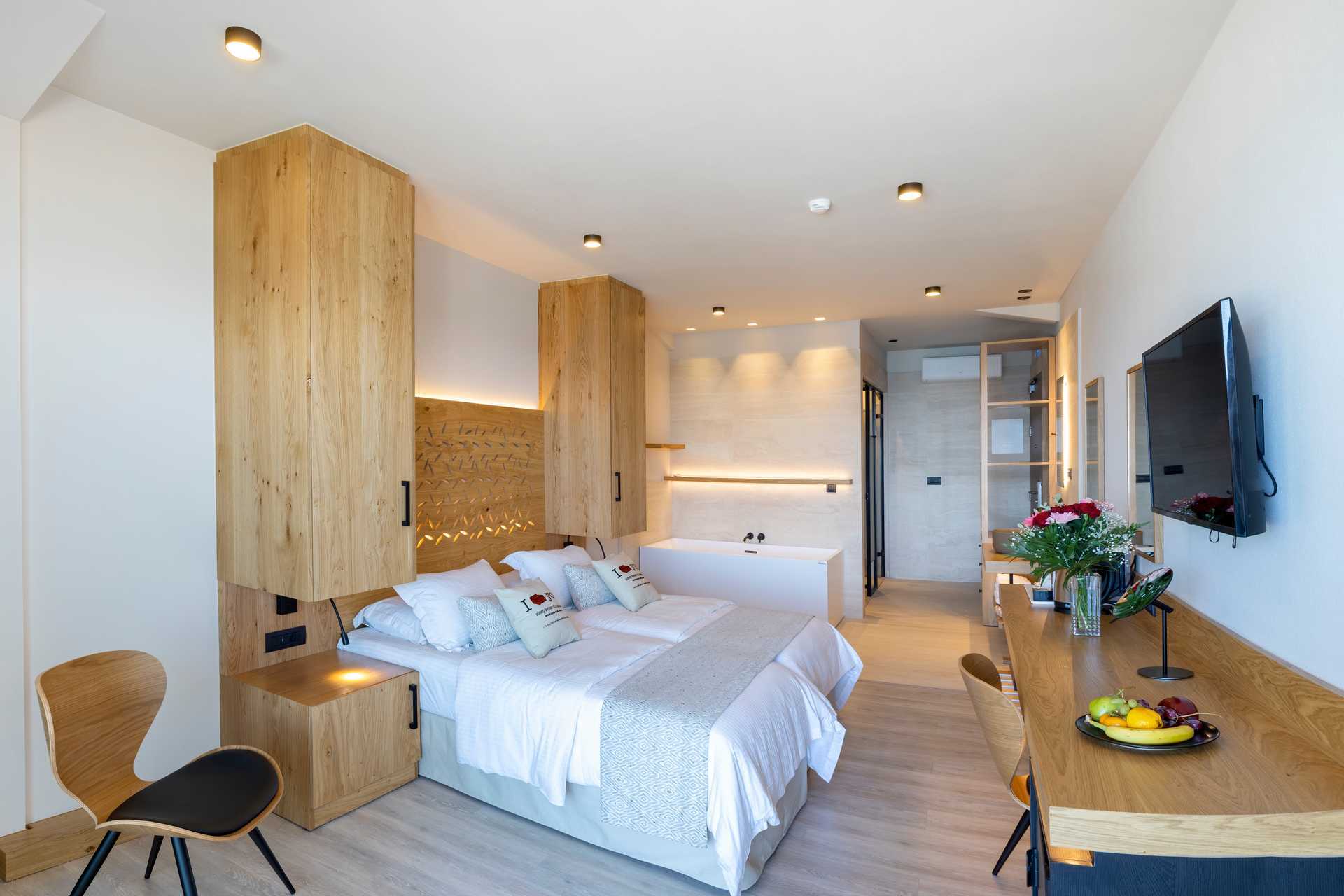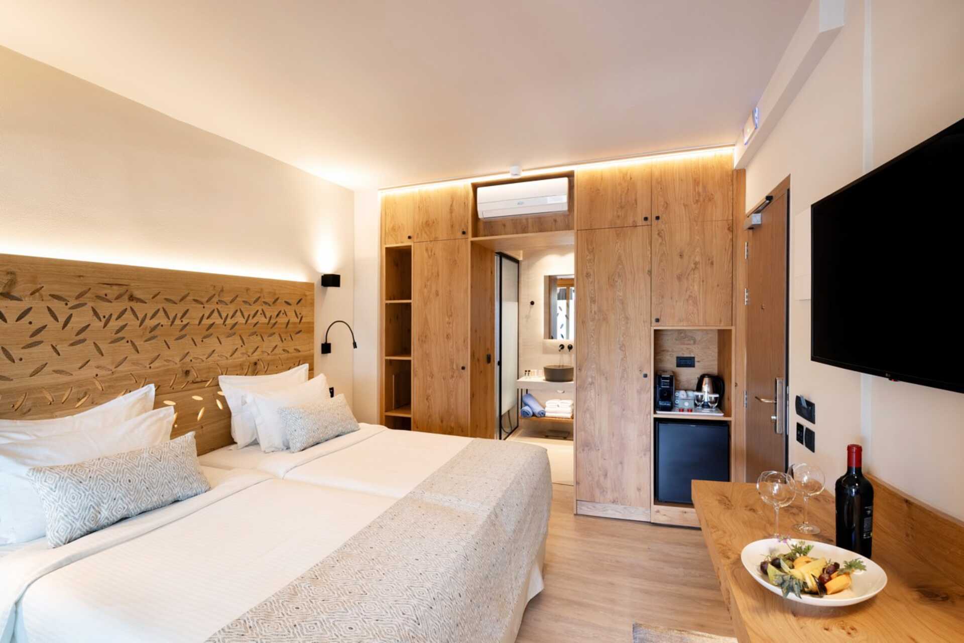 Superiorrum med balkong eller terrass eller med balkong och havsutsikt. Två enkelsängar. Möjlighet med extrabäddar i bäddsoffa. Wifi, deponering och luftkonditionering ingår. Kylskåp. Kaffemaskin. Vattenkokare samt kaffe och te. Tv med internationella kanaler. Treglasfönster. Strykjärn och strykbräda. Hårtork. Badrum med dusch och wc. Städning 7 ggr/vecka.