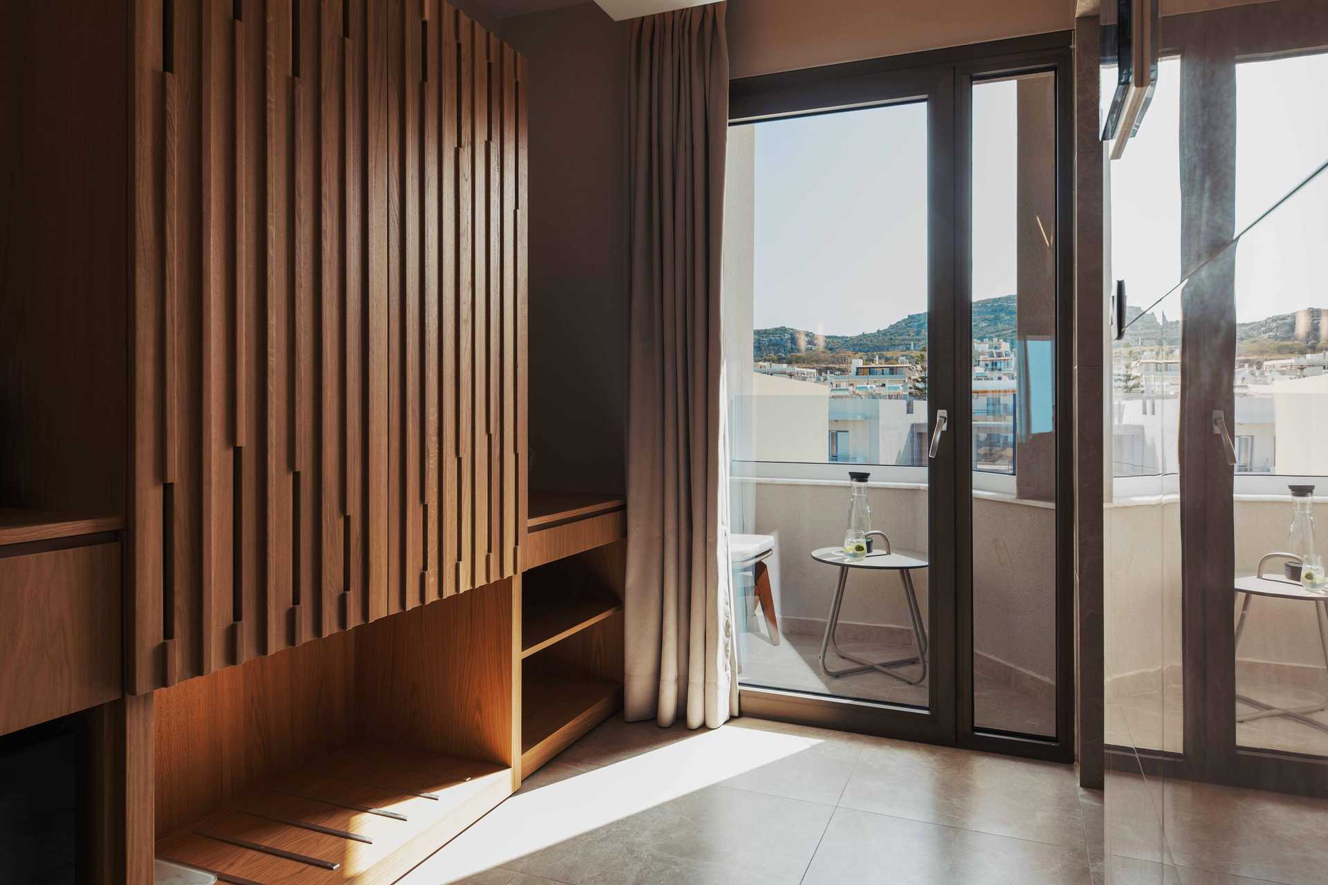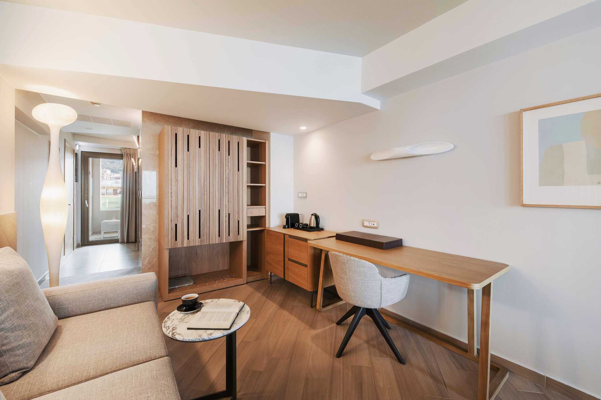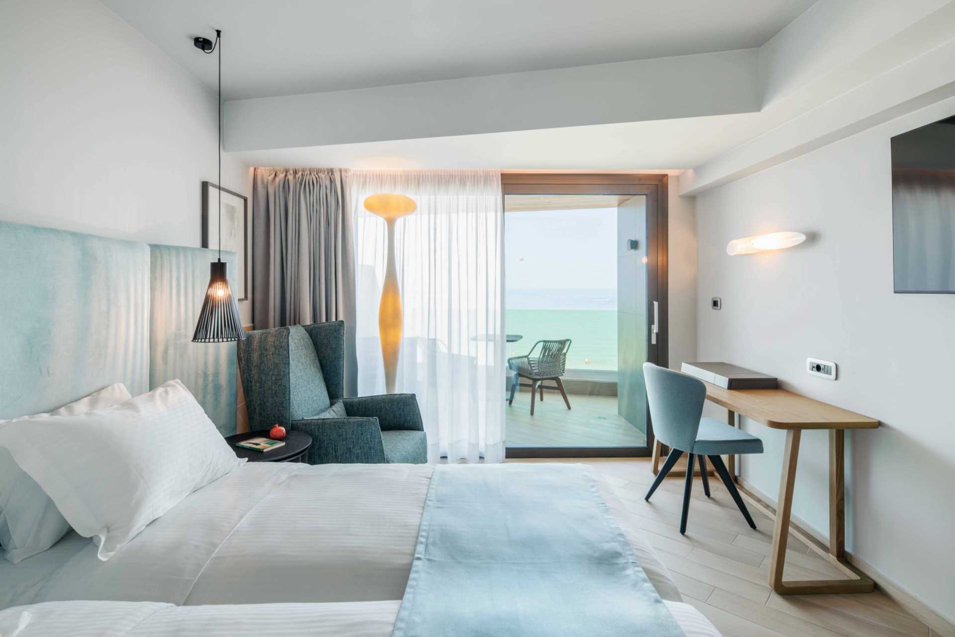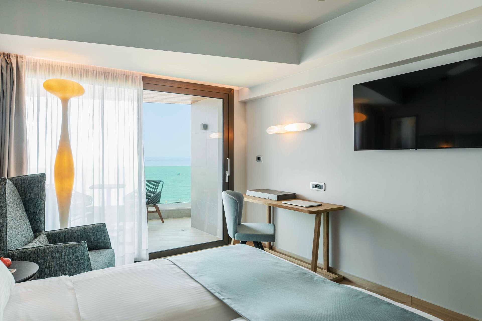 Juniorsvit Premium med havsutsikt och en rymlig balkong om ca 15 kvadratmeter. En dubbelsäng eller två enkelsängar. Wifi, luftkonditionering och wifi ingår. Espressomaskin med kapslar ingår. Vattenkokare samt kaffe och te. Kylskåp. En flaska vin, en flaska vatten och färsk frukt väntar vid ankomst. Tv med internationella kanaler. Strykjärn och strykbräda. Badrockar och tofflor. Hårtork. Badrum med dusch och wc. Städning 7 ggr/vecka.