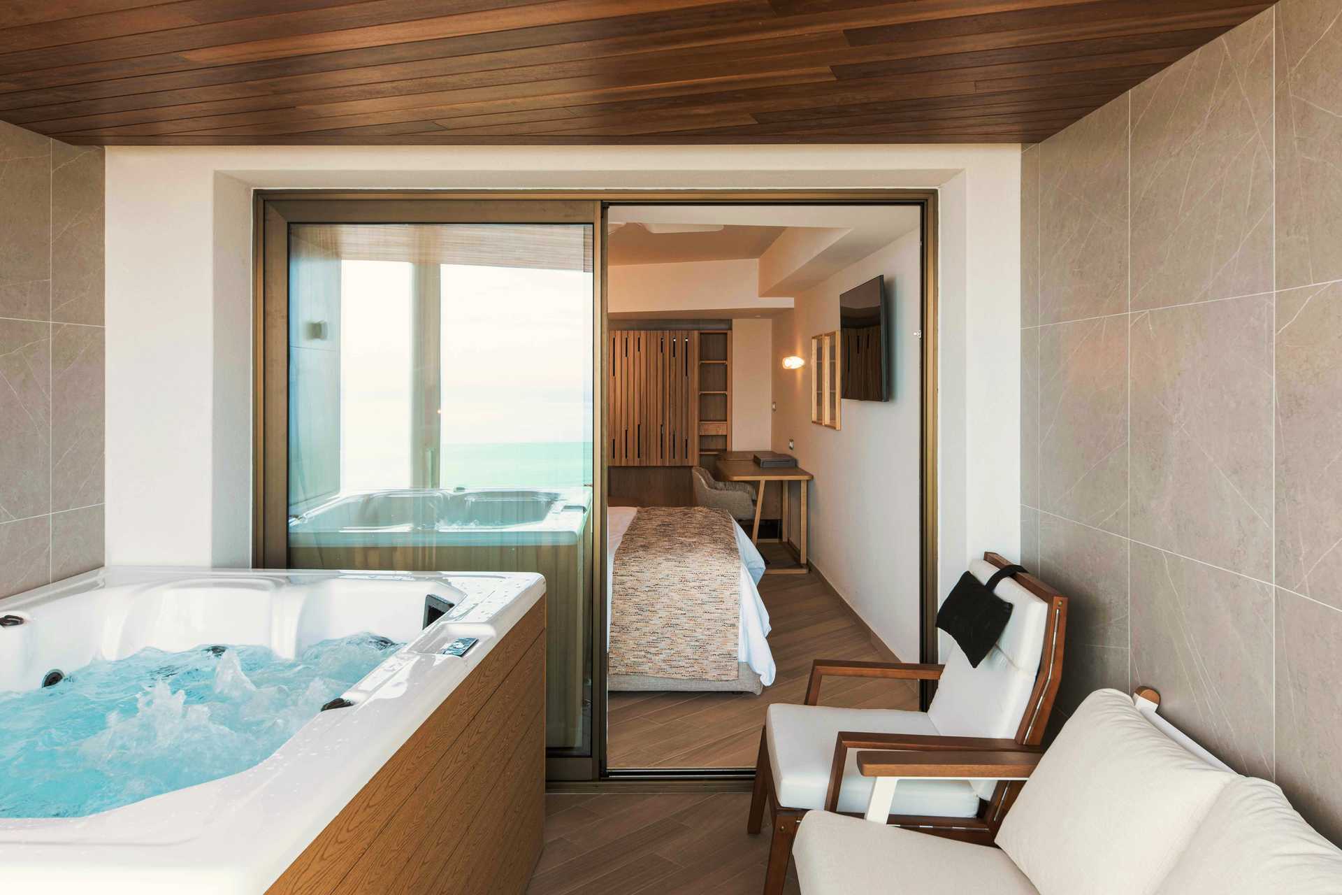 Executivesviter med havsutsikt och rymlig balkong om ca 15 kvadratmeter med jacuzzi. En dubbelsäng. Soffgrupp. Wifi, luftkonditionering och deponering ingår. Espressomaskin med kapslar ingår. Vattenkokare samt te och kaffe. Kylskåp. Vid ankomst väntar en flaska vin och färsk frukt i sviten. Tv med internationella kanaler. Strykjärn och strykbräda. Badrockar och tofflor. Hårtork. Badrum med dusch och wc. Städning 7 ggr/vecka.