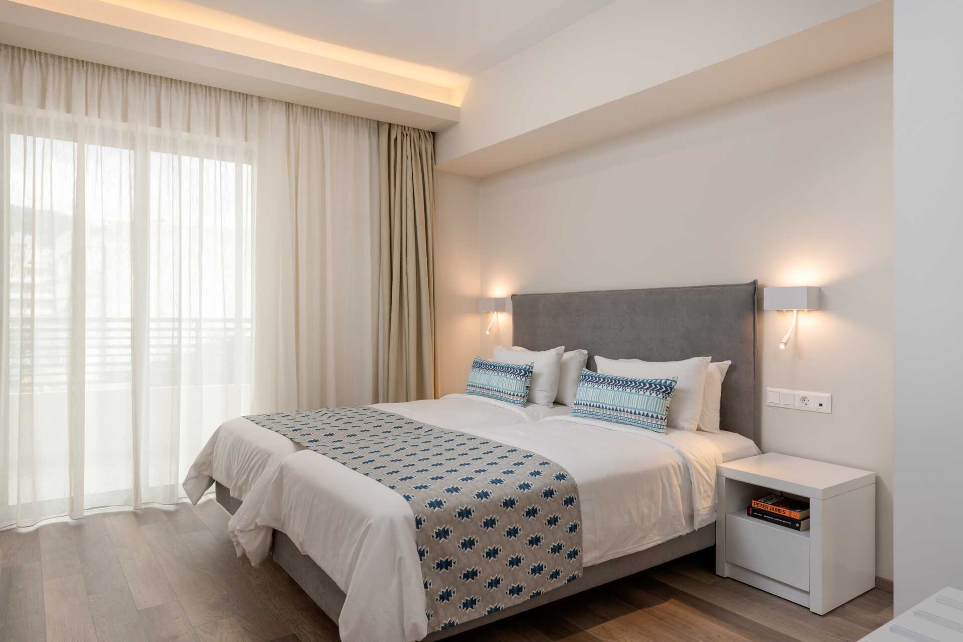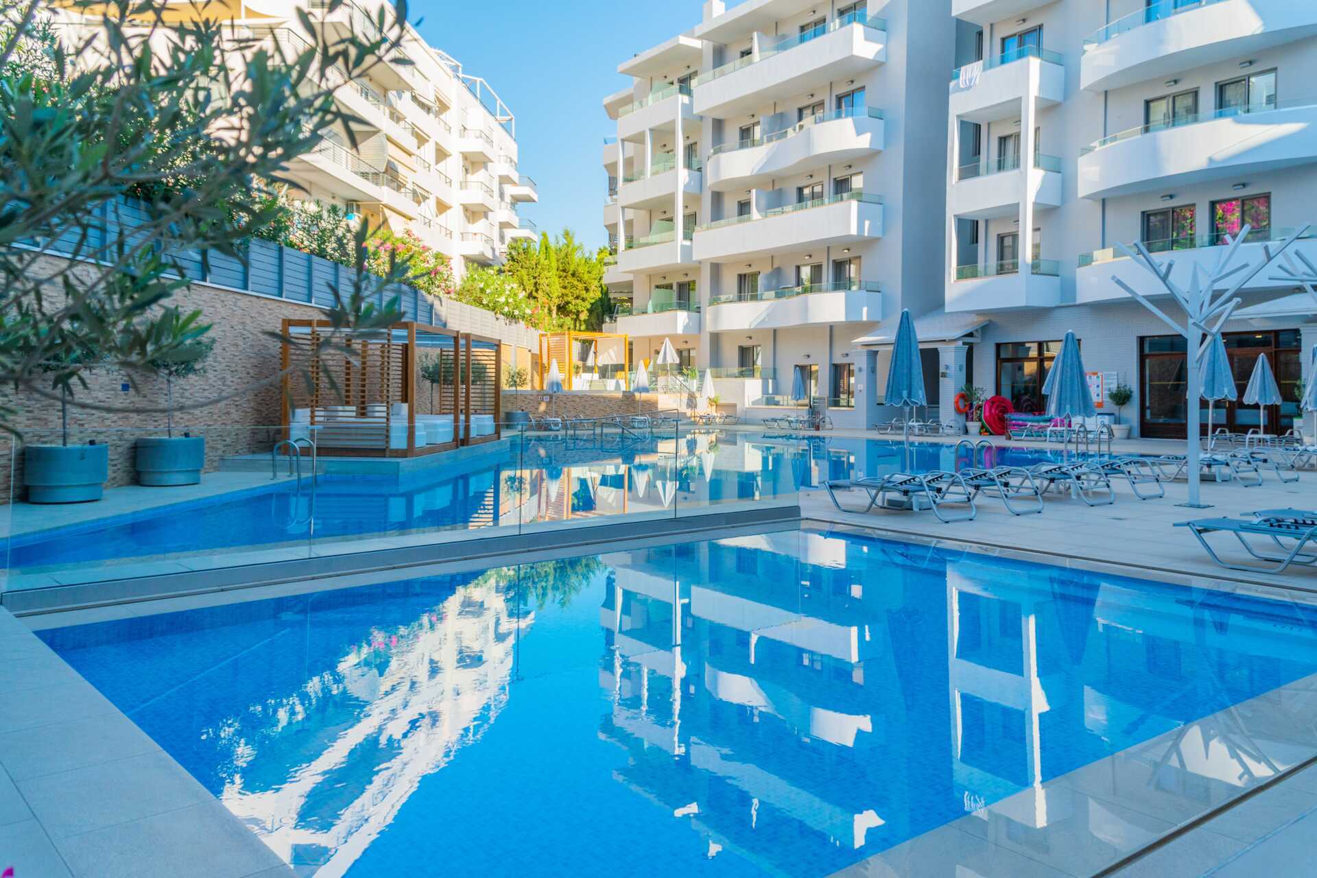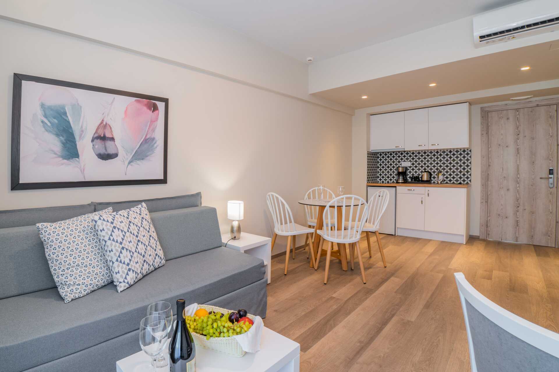 Tvårumslägenhet superior med balkong eller med balkong eller terrass med utsikt mot poolen. Ett sovrum och ett kombinerat vardagsrum med minikök. Två enkelsängar. Möjliga extrabäddar i bäddsoffa. Minikök med kokplattor, kylskåp, mikrovågsugn, vattenkokare, brödrost, kaffebryggare och enkel köksutrustning. Daglig påfyllning av kaffe och te. Vid ankomst finns en flaska vin, en flaska vatten och frukt i lägenheten. Luftkonditionering och wifi ingår. Deponering mot avgift. Tv med internationella kanaler. Badrockar och tofflor. Hårtork. Badrum med dusch och wc. Städning 7 gånger/vecka.