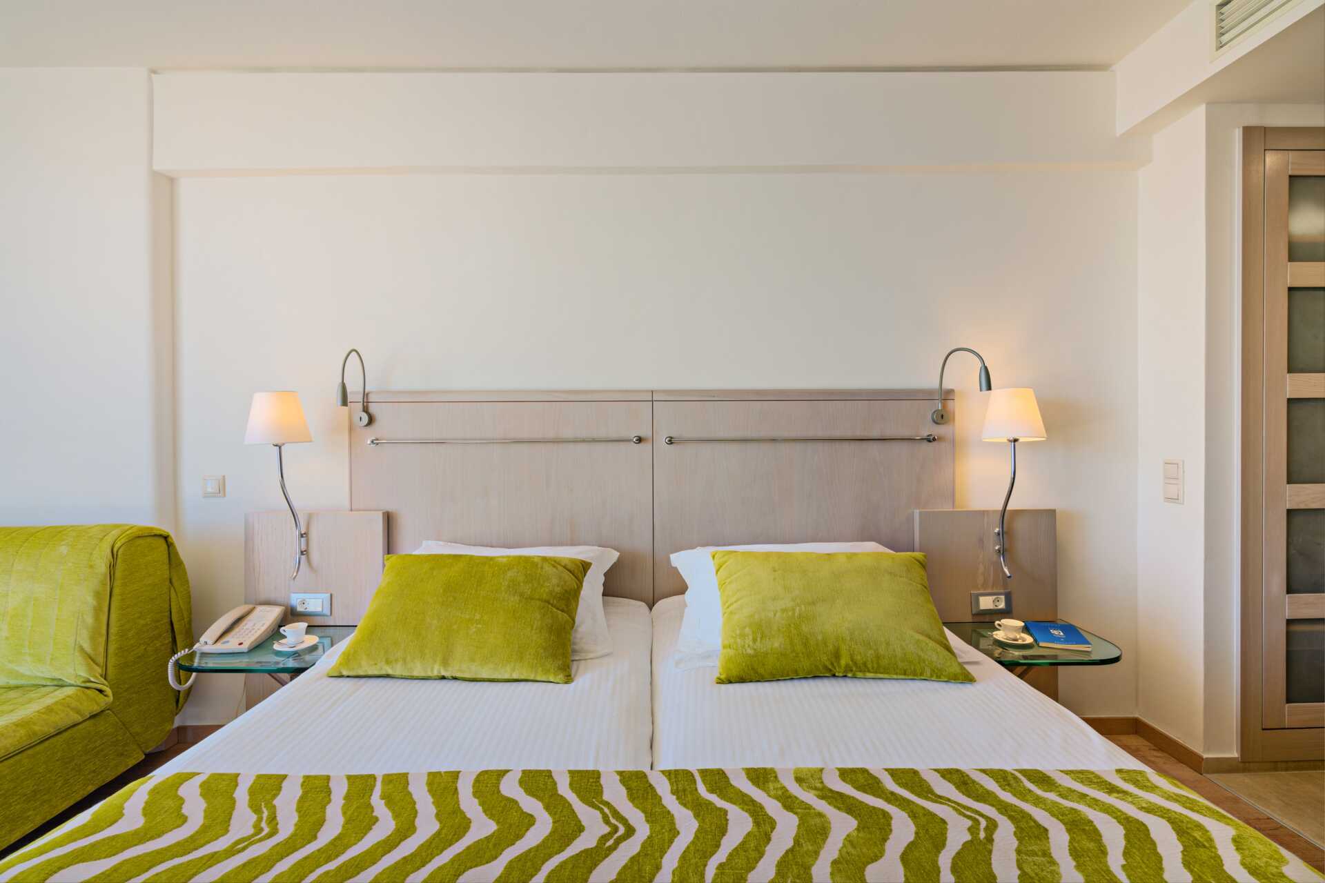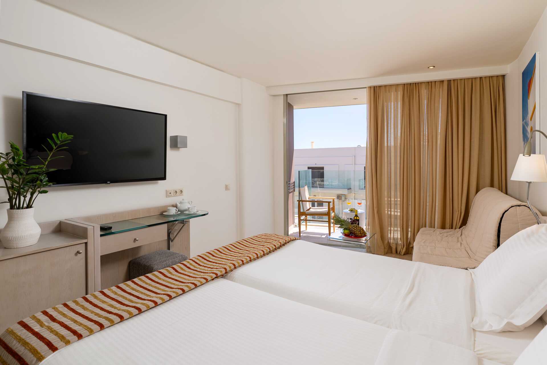 Juniorsvit med balkong och begränsad havsutsikt eller havsutsikt. En dubbelsäng eller två enkelsängar. Möjlighet till extrabädd i enkelsäng, i hopfällbar säng eller i bäddbar fåtölj. Vid ankomst väntar en flaska vin, frukt och en flaska vatten i rummet. Kylskåp. Vattenkokare med kaffe och te. Wifi, luftkonditionering och deponering ingår. Tv med internationella kanaler. Badrockar och tofflor. Hårtork. Badrum med badkar eller dusch samt wc. Städning 7 ggr/vecka. Några rum som vetter mot havet och omgivningarna störs av trafiken.