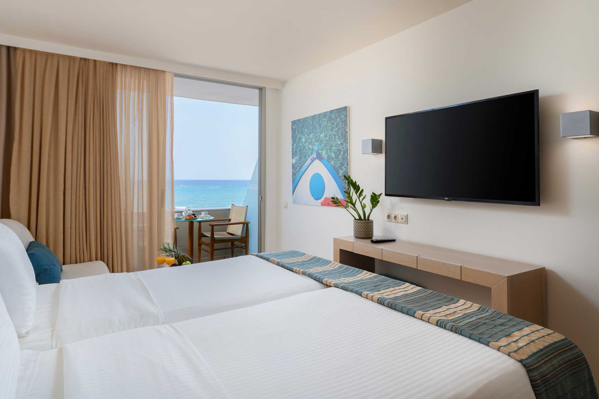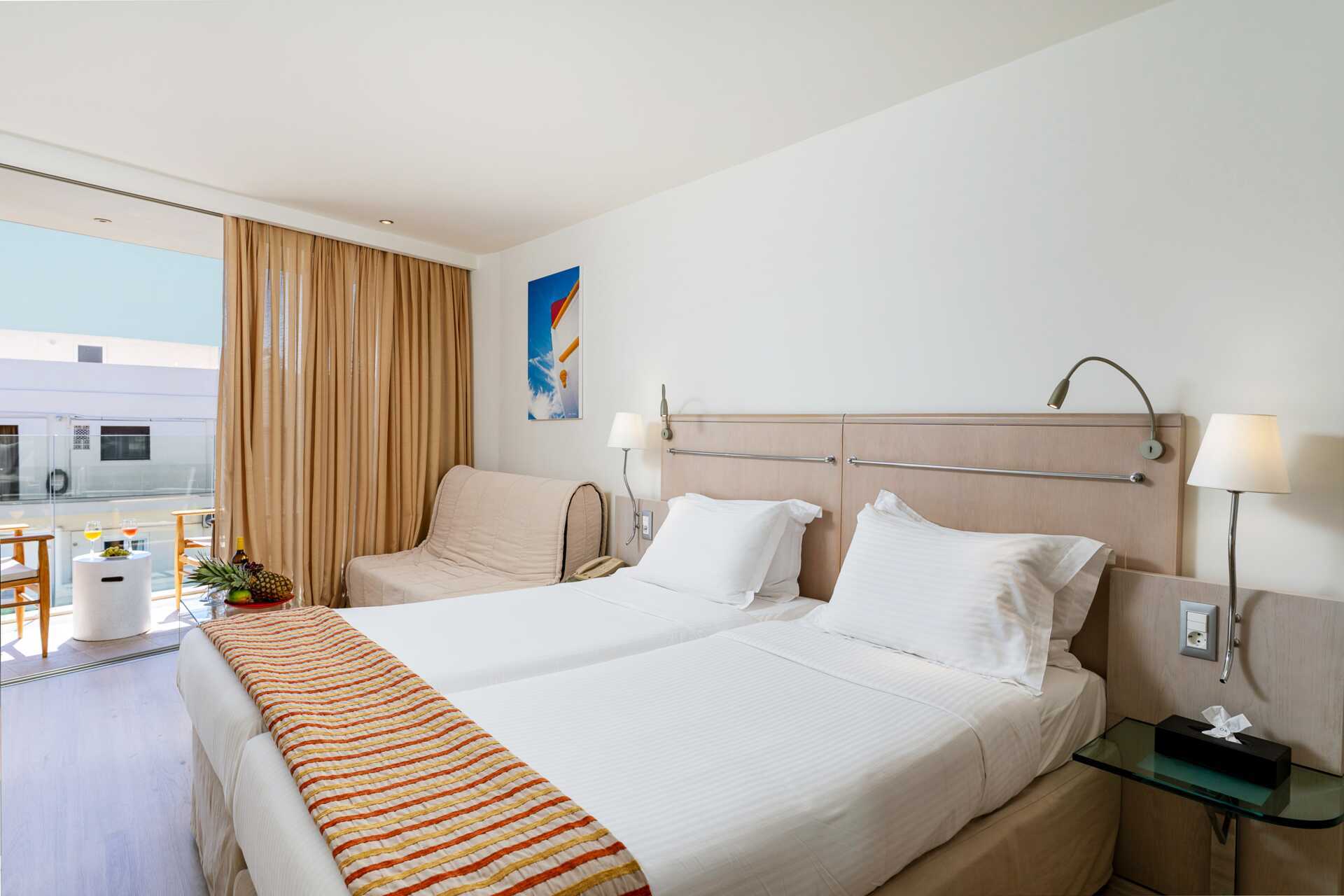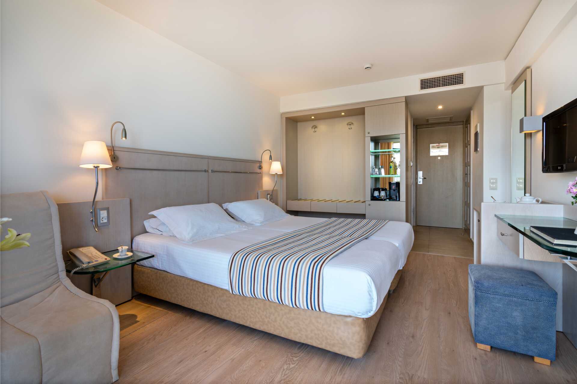 Dubbelrum med balkong, vissa med havsutsikt eller begränsad havsutsikt. En dubbelsäng eller två enkelsängar. Möjlighet till extrabädd i enkelsäng, i hopvikbar säng eller bäddbar fåtölj i vissa rum. Wifi, luftkonditionering och deponering ingår. Kylskåp. Vattenkokare samt kaffe och te. Tv med internationella kanaler. Badrockar och tofflor. Hårtork. Badrum med badkar eller dusch samt wc. Städning 7 ggr/vecka. Några rum som vetter mot havet och omgivningarna störs av trafiken.