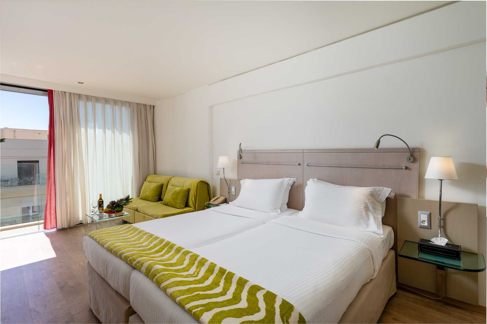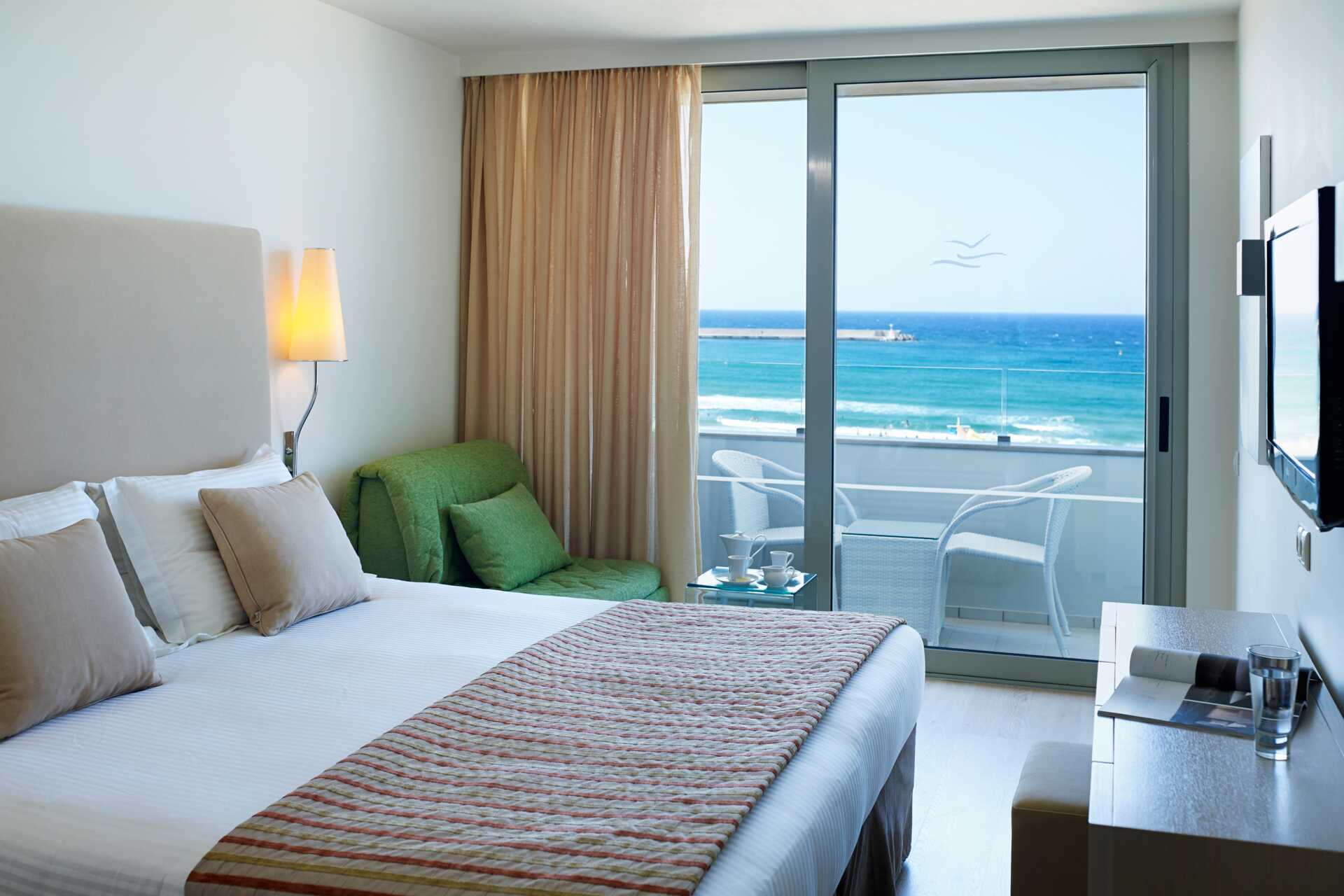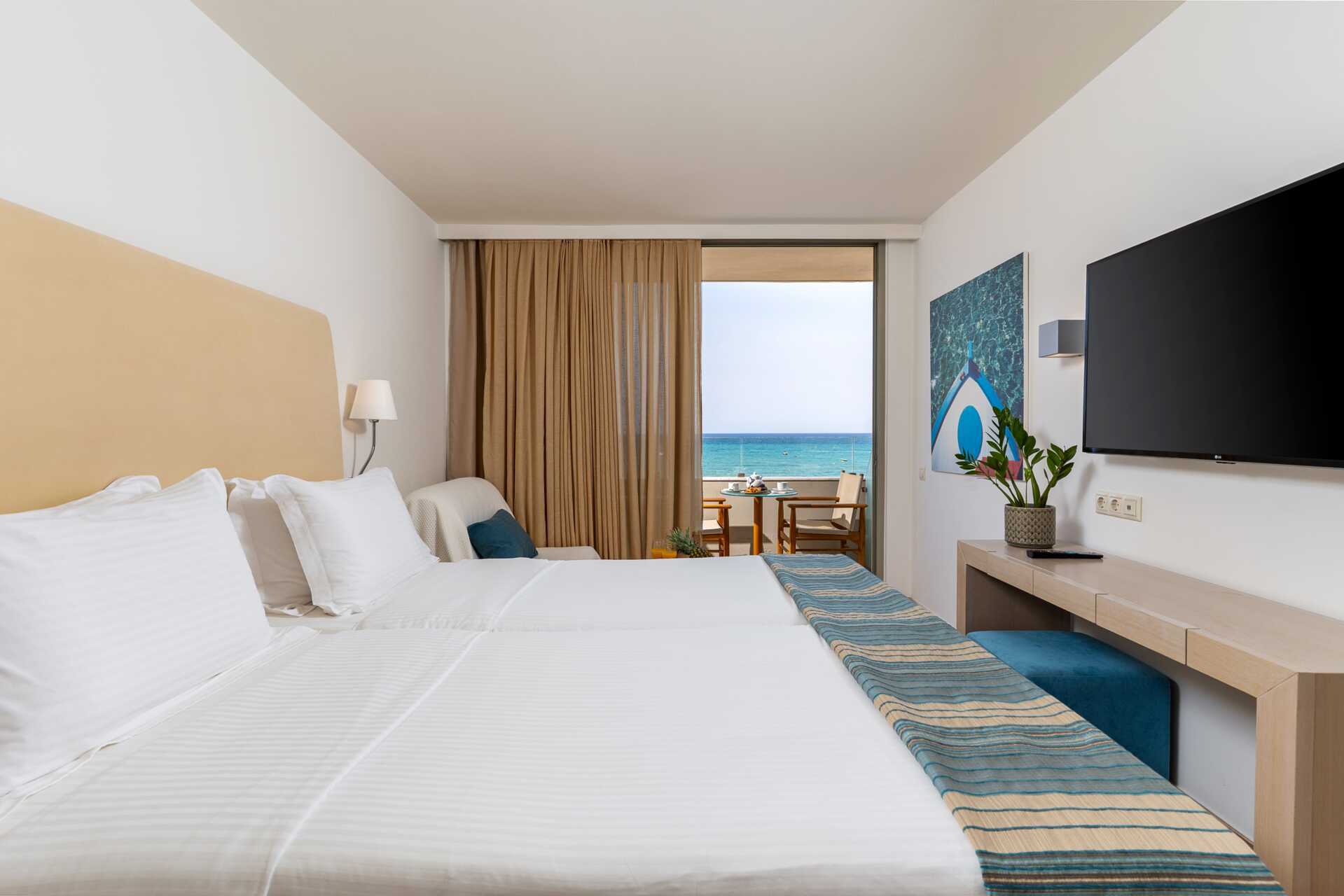 Dubbelrum med balkong, vissa med havsutsikt eller begränsad havsutsikt. En dubbelsäng eller två enkelsängar. Möjlighet till extrabädd i enkelsäng, i hopvikbar säng eller bäddbar fåtölj i vissa rum. Wifi, luftkonditionering och deponering ingår. Kylskåp. Vattenkokare samt kaffe och te. Tv med internationella kanaler. Badrockar och tofflor. Hårtork. Badrum med badkar eller dusch samt wc. Städning 7 ggr/vecka. Några rum som vetter mot havet och omgivningarna störs av trafiken.