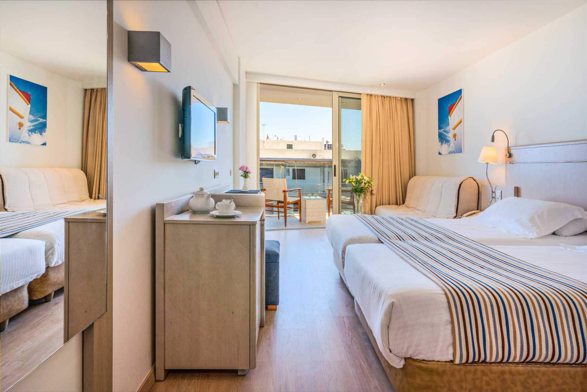 Familjerummen med balkong. Två sovrum med en förbindelsedörr. I varje sovrum finns en dubbelsäng eller två enkelsängar. Wifi, luftkonditionering och deponering ingår. Kylskåp. Vattenkokare samt kaffe och te. Tv med internationella kanaler. Badrockar och tofflor. Hårtork. Badrum med badkar eller dusch samt wc. Städning 7 ggr/vecka. Några rum som vetter mot havet och omgivningarna störs av trafiken.