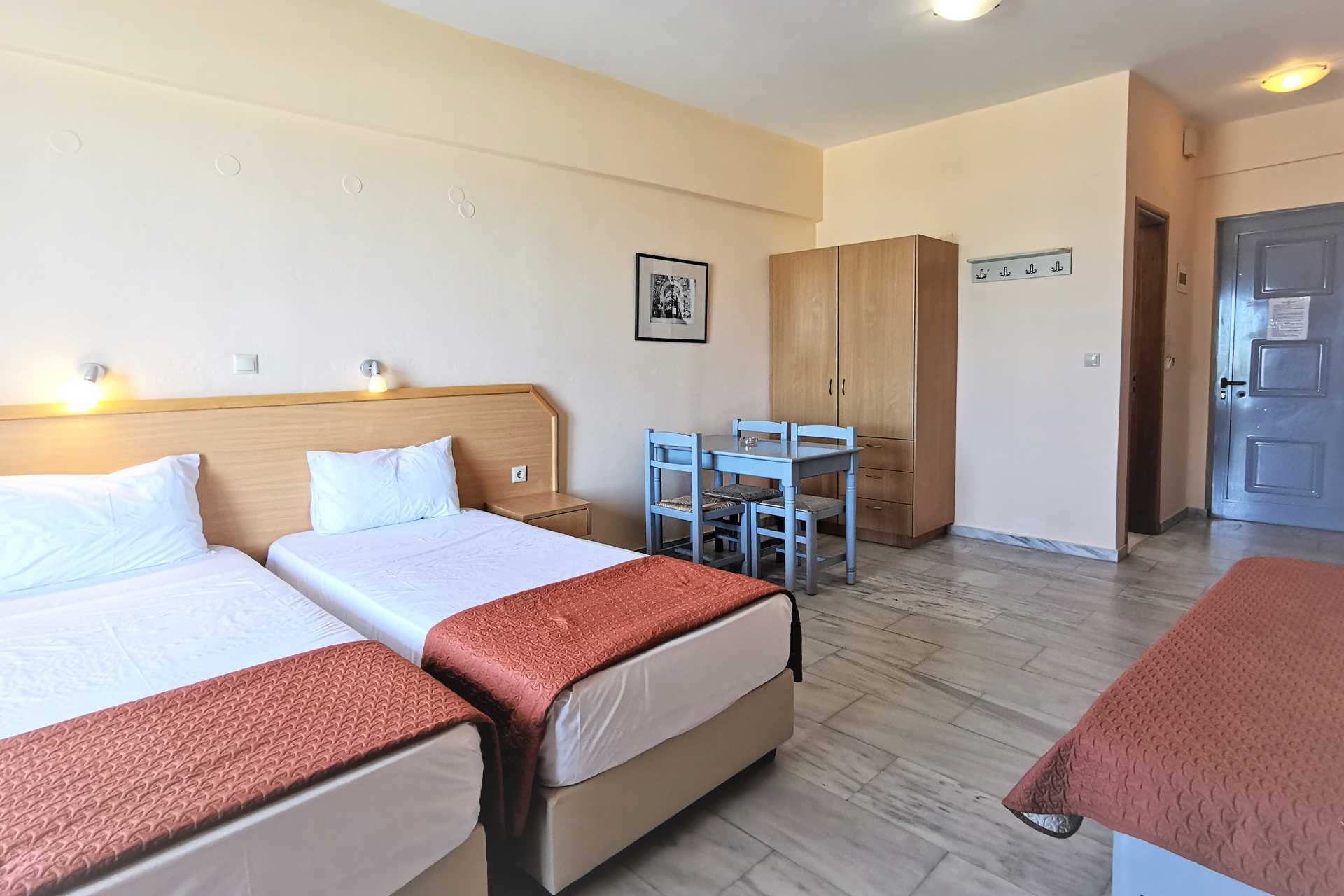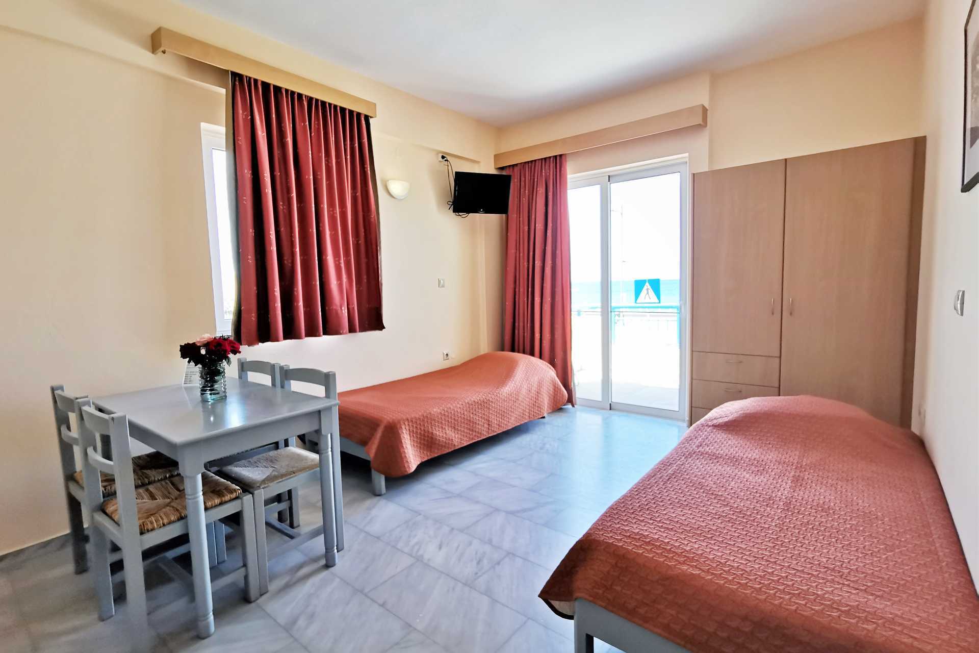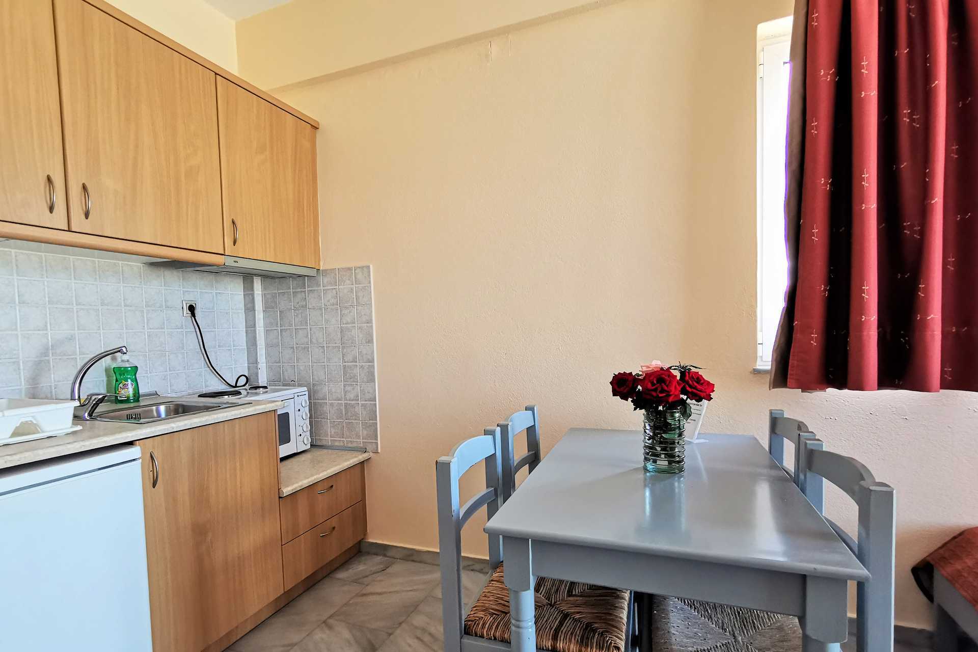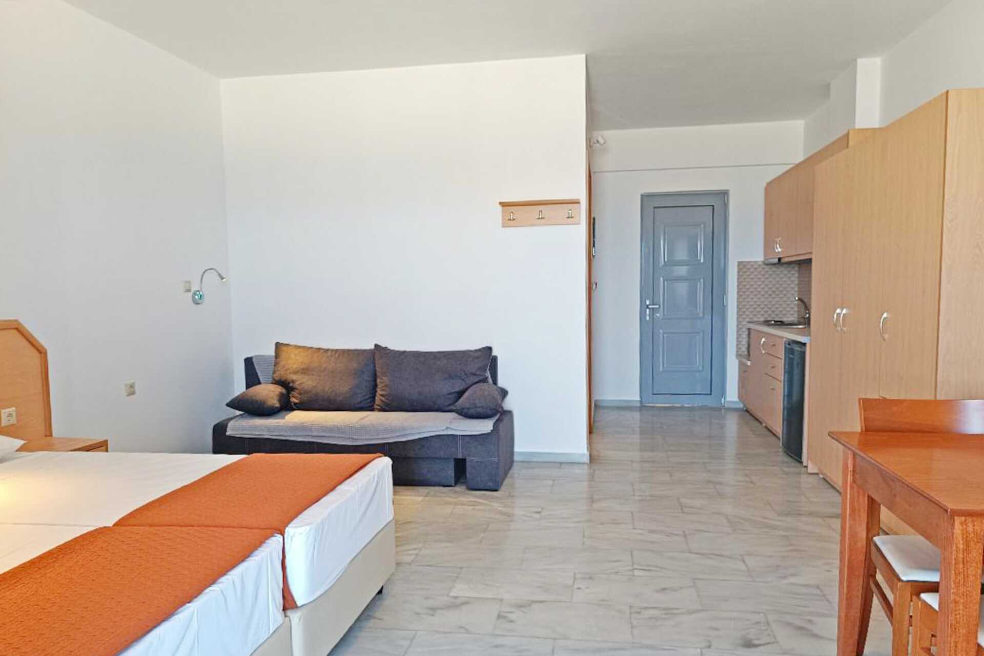 Enrumslägenhet i ny/renoverad del med balkong och havsutsikt. Sovrum kombinerat med minikök. Två enkelsängar. Möjlighet till extrabädd i bäddsoffa. Minikök med kokplattor, kylskåp, kaffebryggare, liten ugn samt enkel köksutrustning. Wifi och luftkonditionering ingår. Deponering mot avgift. Tv med internationella kanaler. Litet badrum med dusch och wc. Städning 6 ggr/vecka.