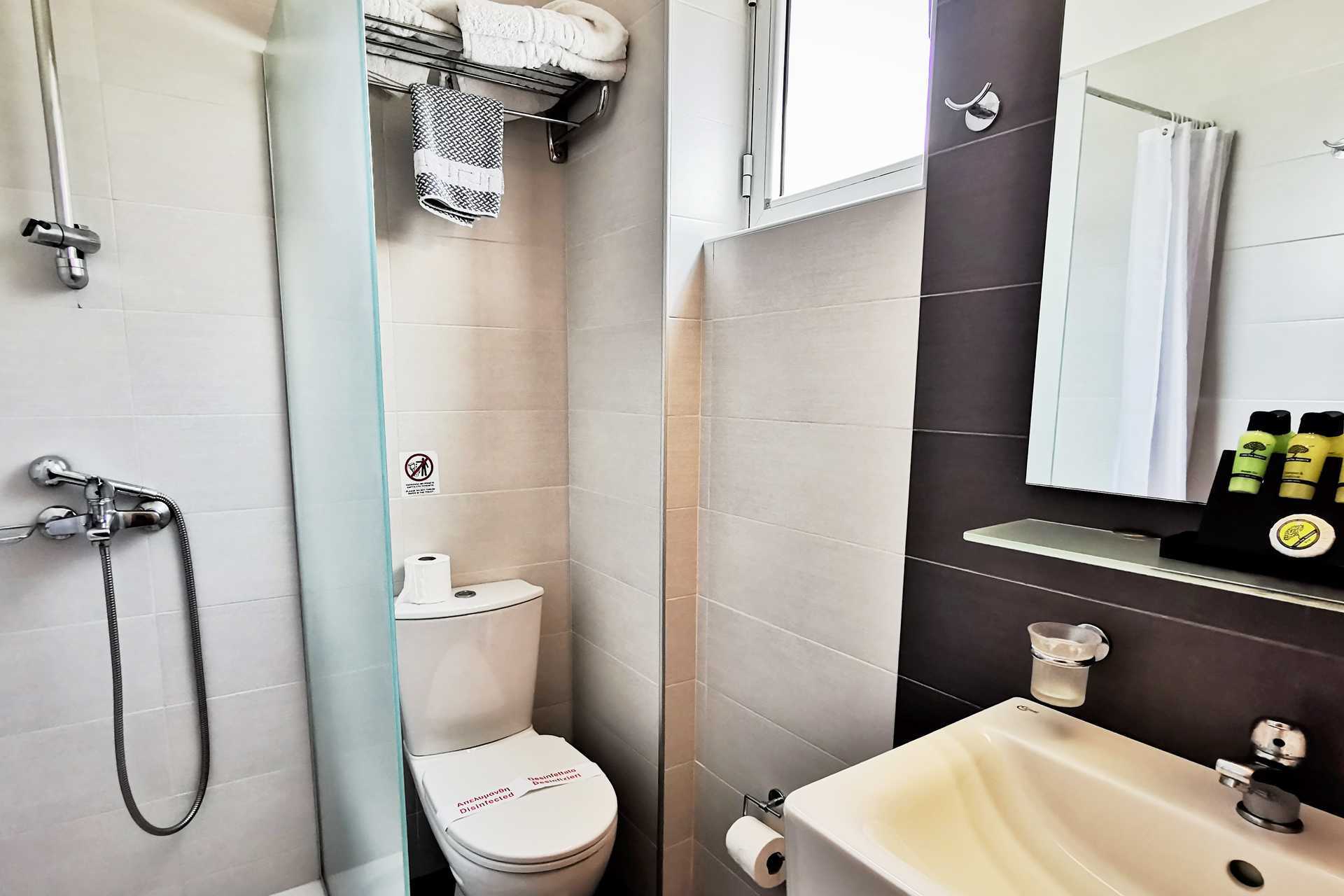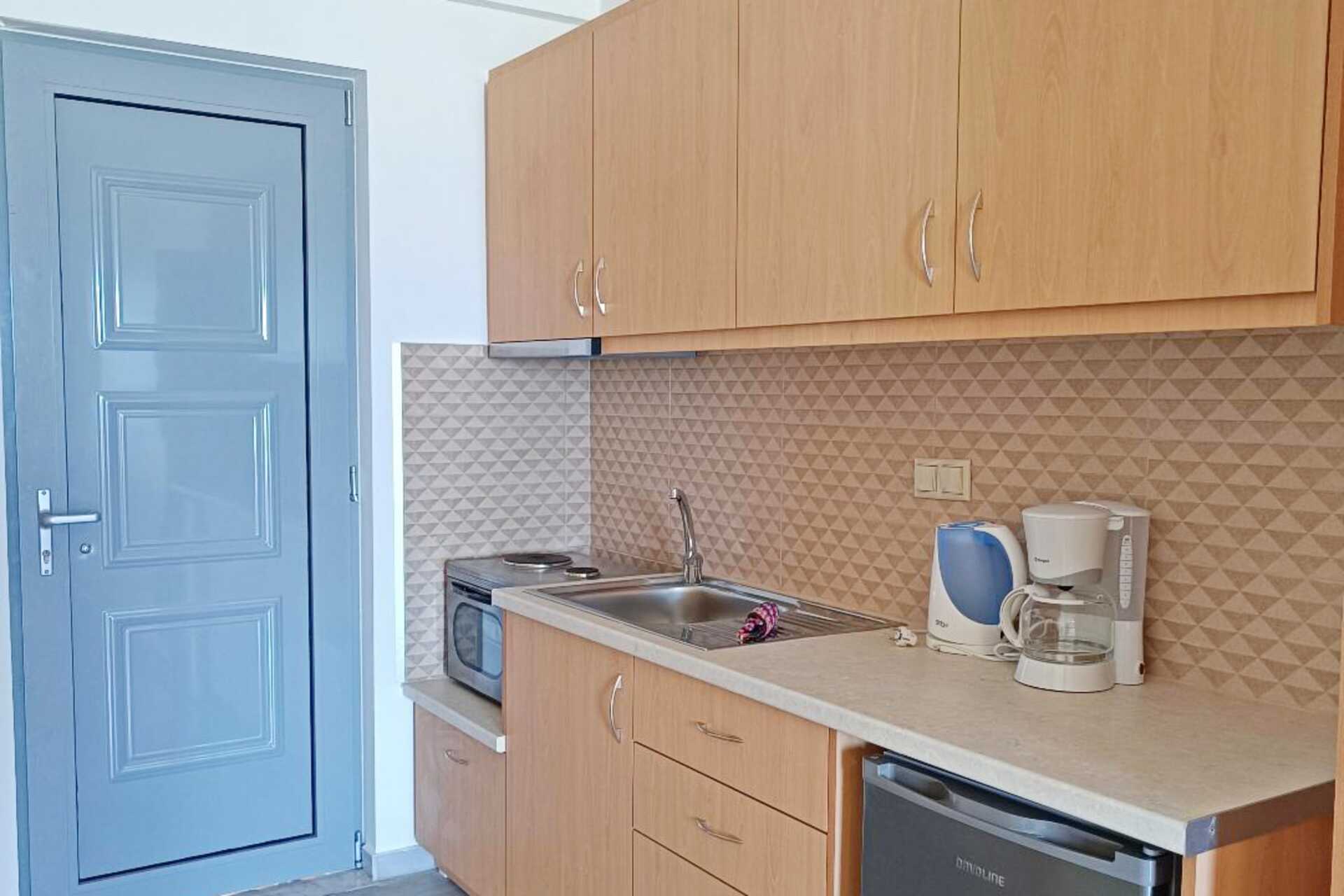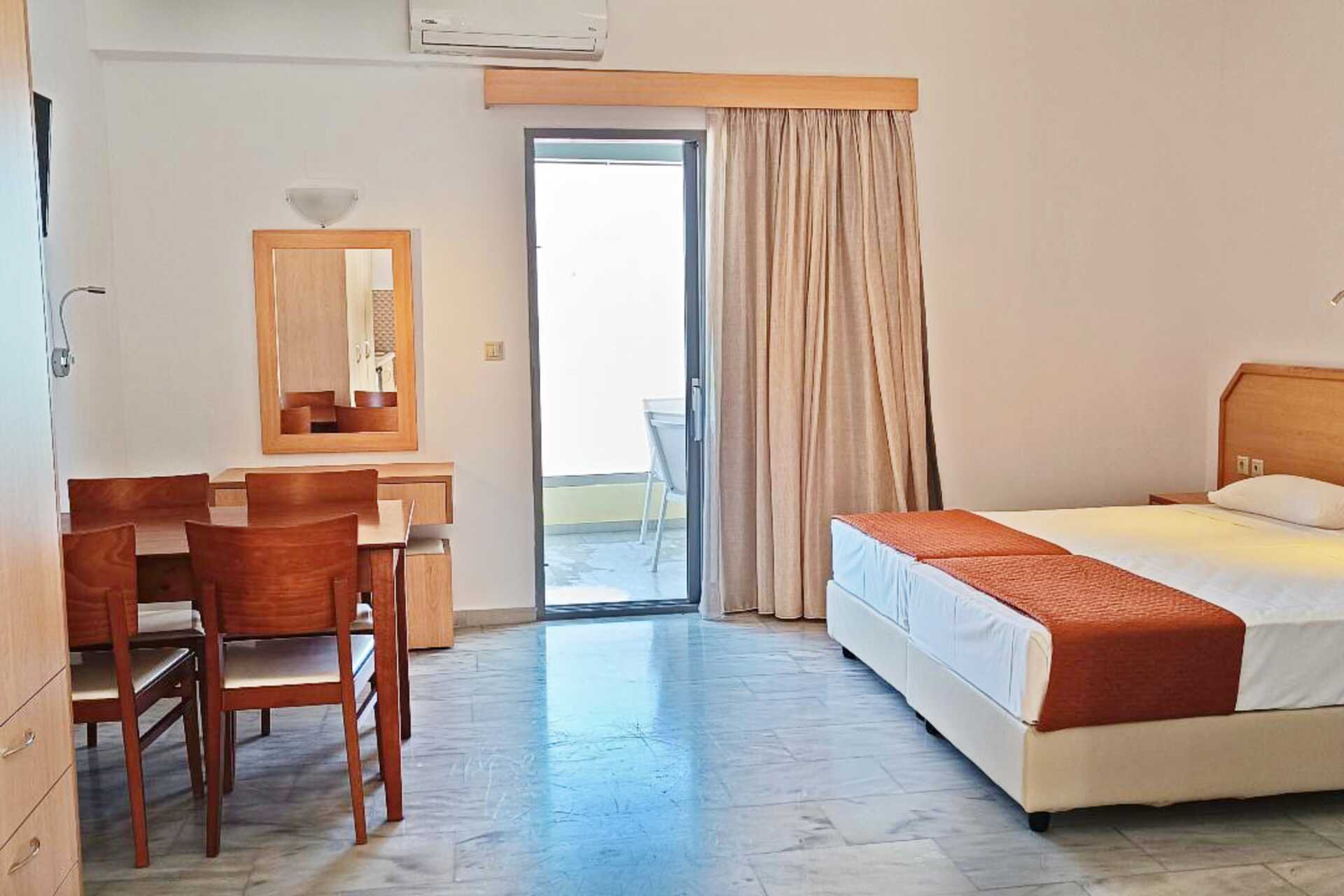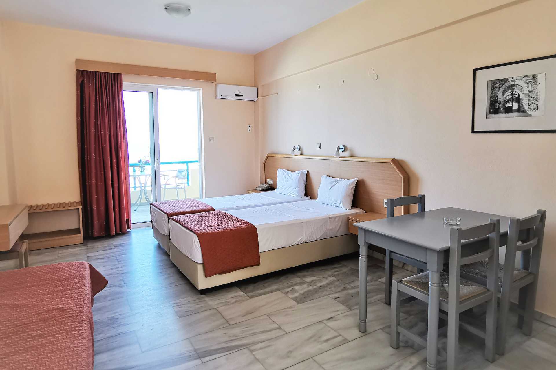 Enrumslägenhet i ny/renoverad del med balkong och havsutsikt. Sovrum kombinerat med minikök. Två enkelsängar. Möjlighet till extrabädd i bäddsoffa. Minikök med kokplattor, kylskåp, kaffebryggare, liten ugn samt enkel köksutrustning. Wifi och luftkonditionering ingår. Deponering mot avgift. Tv med internationella kanaler. Litet badrum med dusch och wc. Städning 6 ggr/vecka.