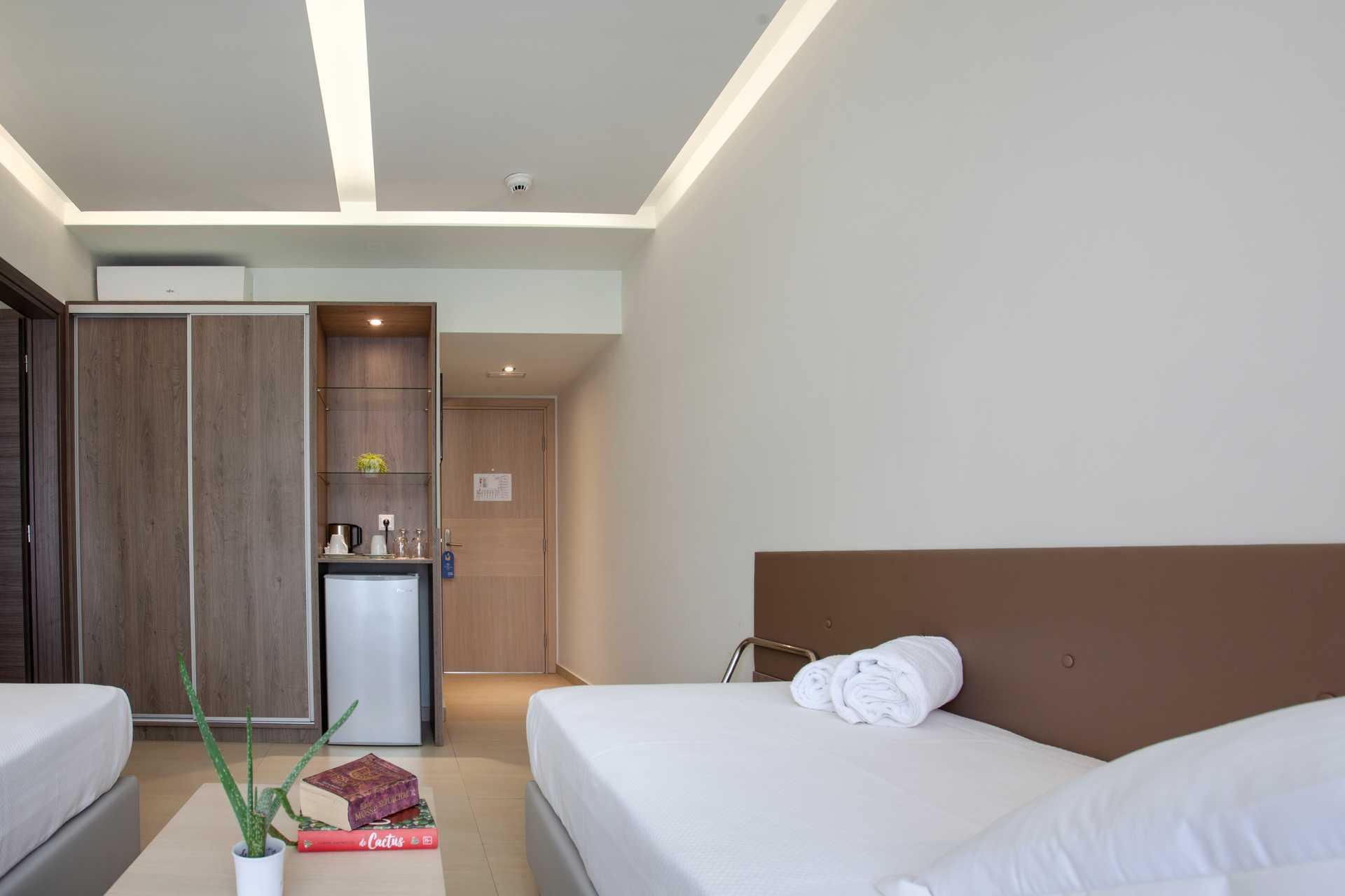 Dubbelrum med balkong. Två enkelsängar. Möjlighet till extrabädd. Wifi, luftkonditionering och deponering. Kylskåp. Vattenkokare samt kaffe och te. Tv med internationella kanaler. Hårtork. Tofflor. Badrum med dusch och wc. Städning 7 ggr/vecka. Barn under två år räknas in i maxantalet personer i rummet.