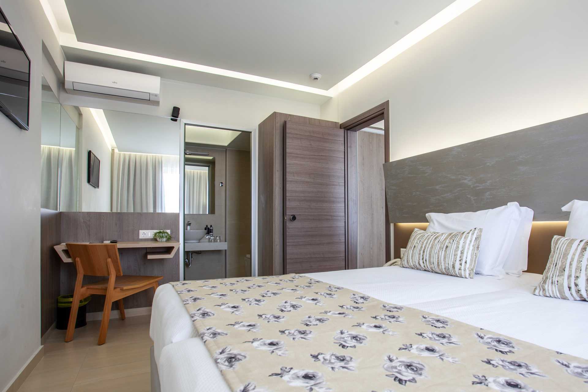 Familjerum med balkong. Två sovrum, ett med en dubbelsäng eller två enkelsängar och ett med en enkelsäng och en bäddsoffa. Wifi, luftkonditionering och deponering ingår. Kylskåp. Vattenkokare med kaffe och te. Tv med internationella kanaler i varje sovrum. Hårtork. Tofflor. Två badrum med dusch och wc. Städning 7 ggr/vecka. Barn under två år räknas in i maxantalet personer i rummet.