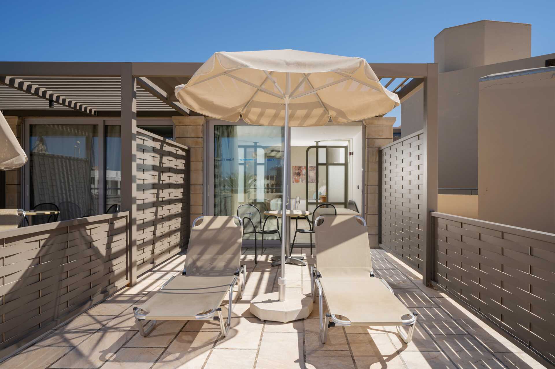 Många solsängar. Bra med en vuxen pool