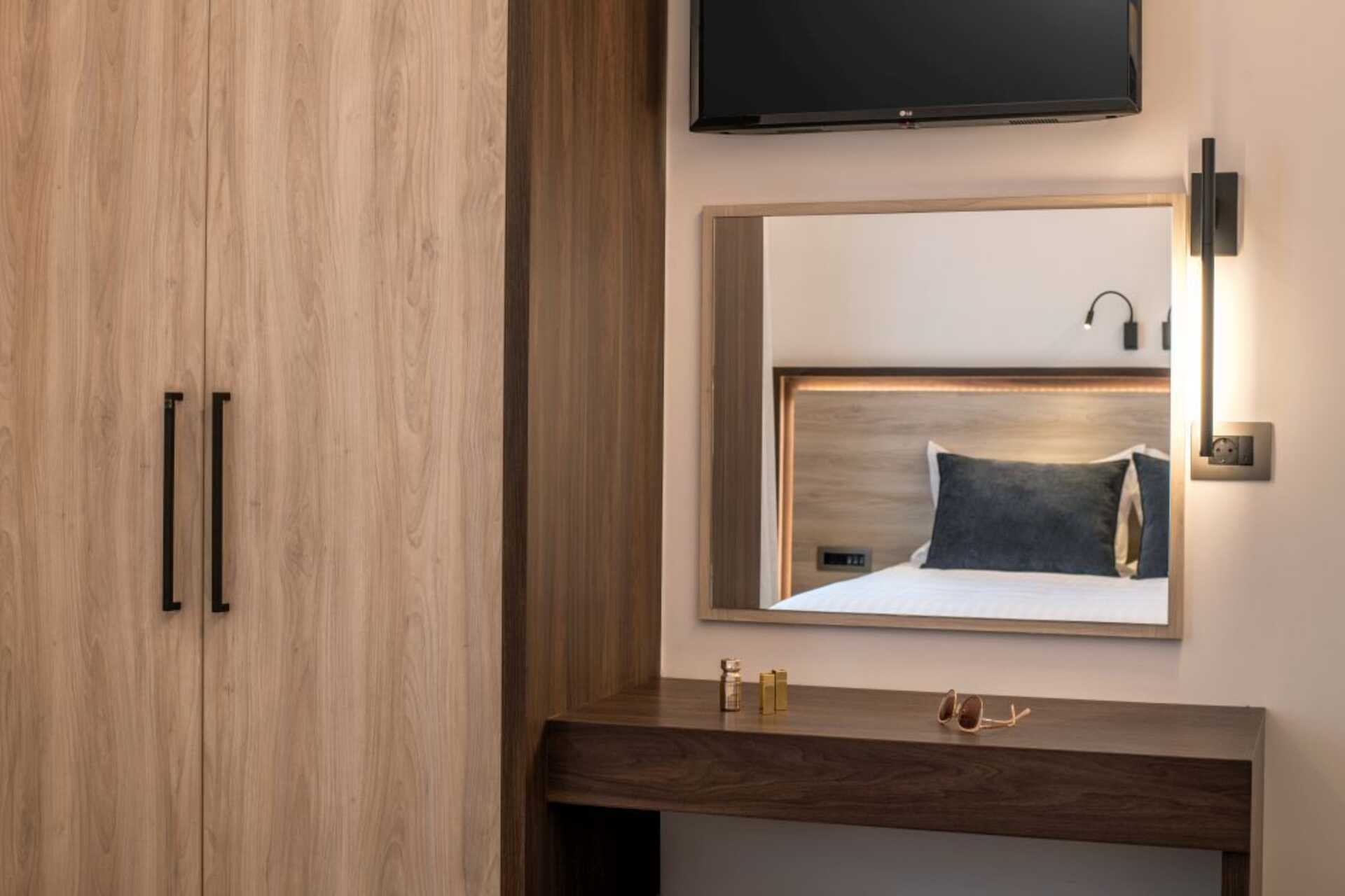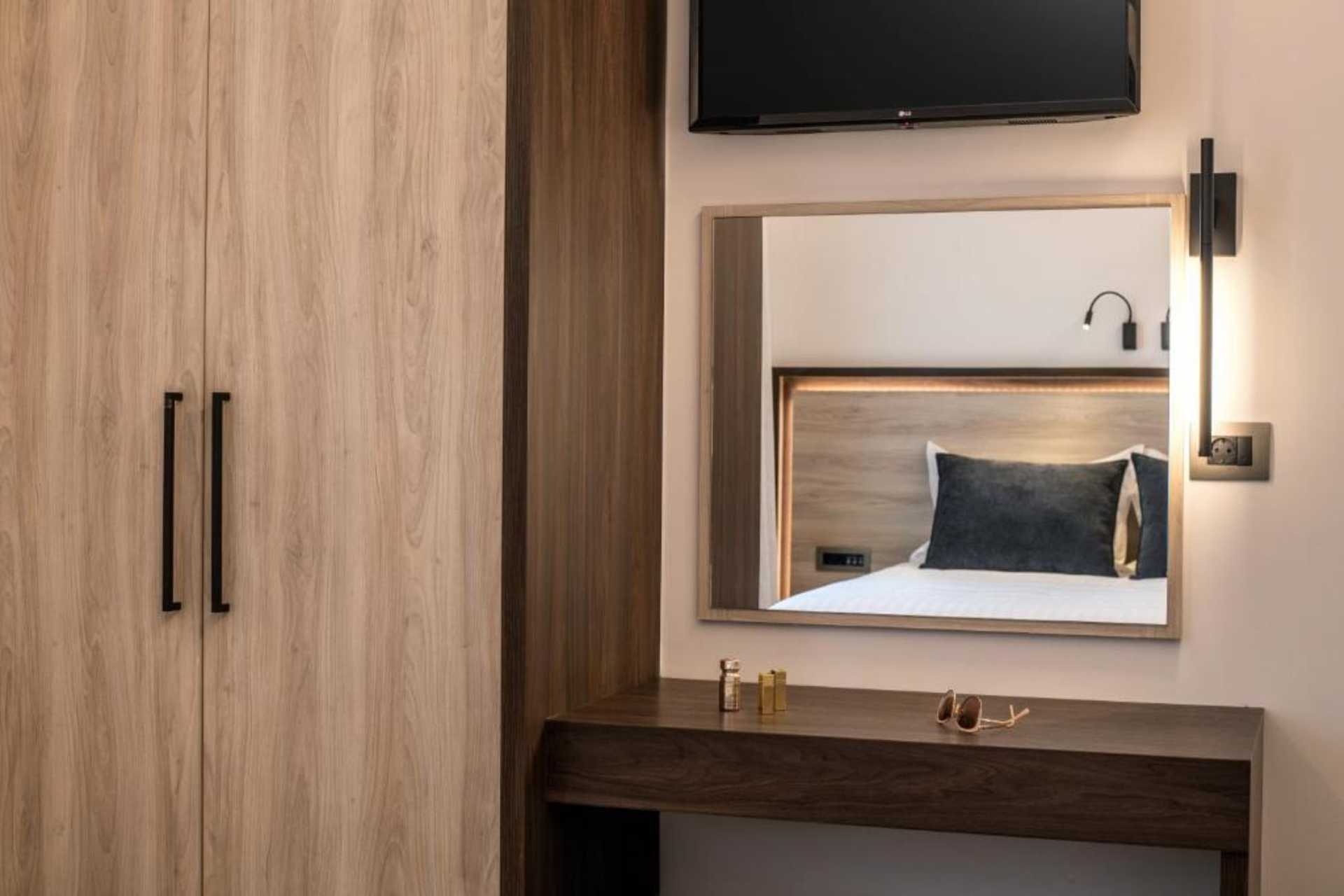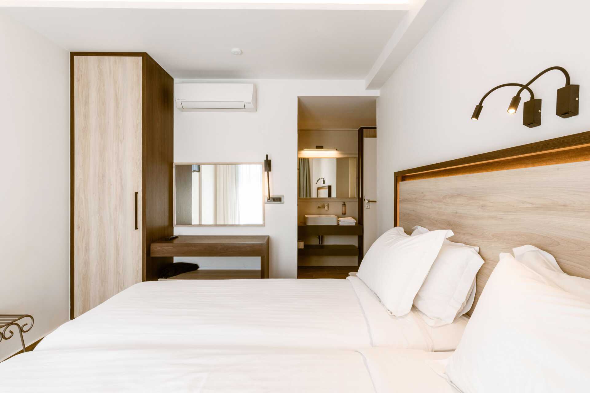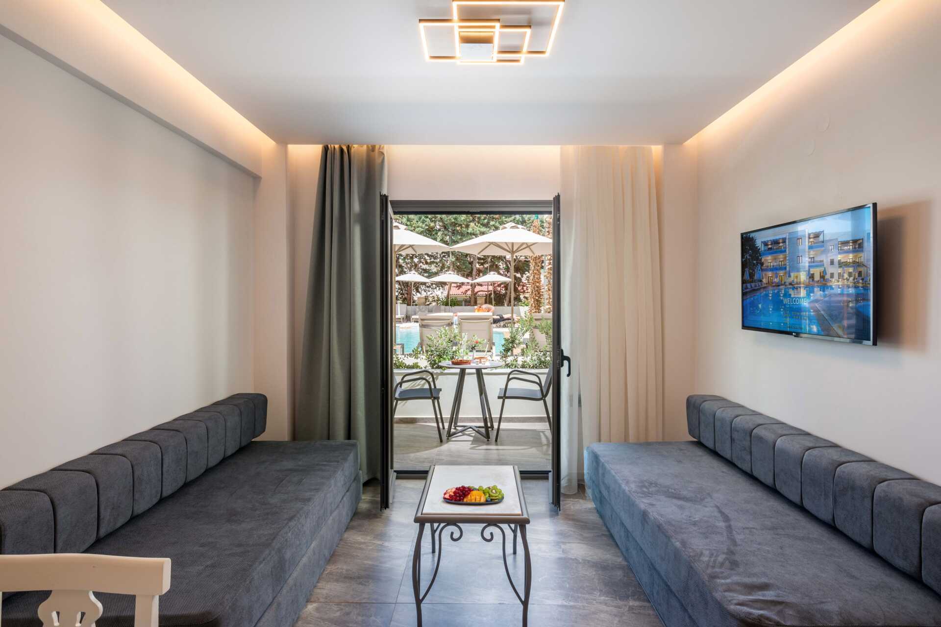 Superiorrum med markbalkong och poolutsikt. En dubbelsäng. Wifi, luftkonditionering och deponering ingår. Kylskåp. Vattenkokare samt kaffe och te. Strykjärn och strykbräda. Tv med internationella kanaler. Hårtork. Badrum med dusch och wc. Hårtork. Städning 6 ggr/vecka.