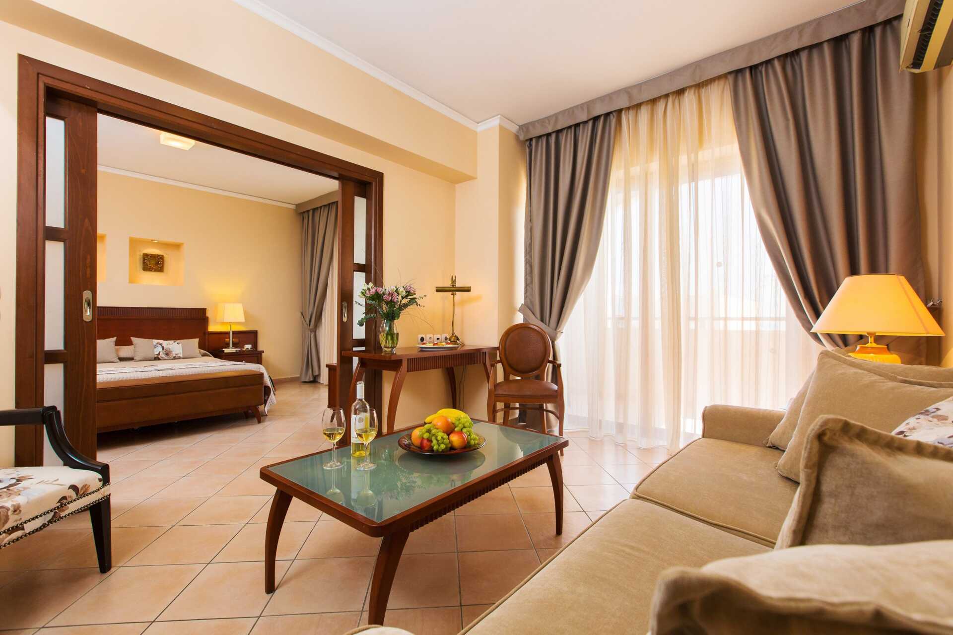 Juniorsvit med balkong, vissa med begränsad havsutsikt. Juniorsviten består av ett sovrum och ett vardagsrum som skiljs åt av en skjutdörr eller med öppen planlösning mellan rummen. Juniorsviterna finns i både huvudbyggnaden och i sidobyggnaden. En dubbelsäng. Möjlighet till extrabädd i bäddsoffa. Wifi, luftkonditionering och deponering ingår. Kylskåp. Vattenkokare samt kaffe och te. Tv med internationella kanaler. Badrockar och tofflor. Hårtork. Badrum med badkar eller dusch samt wc. Städning 7 ggr/vecka.