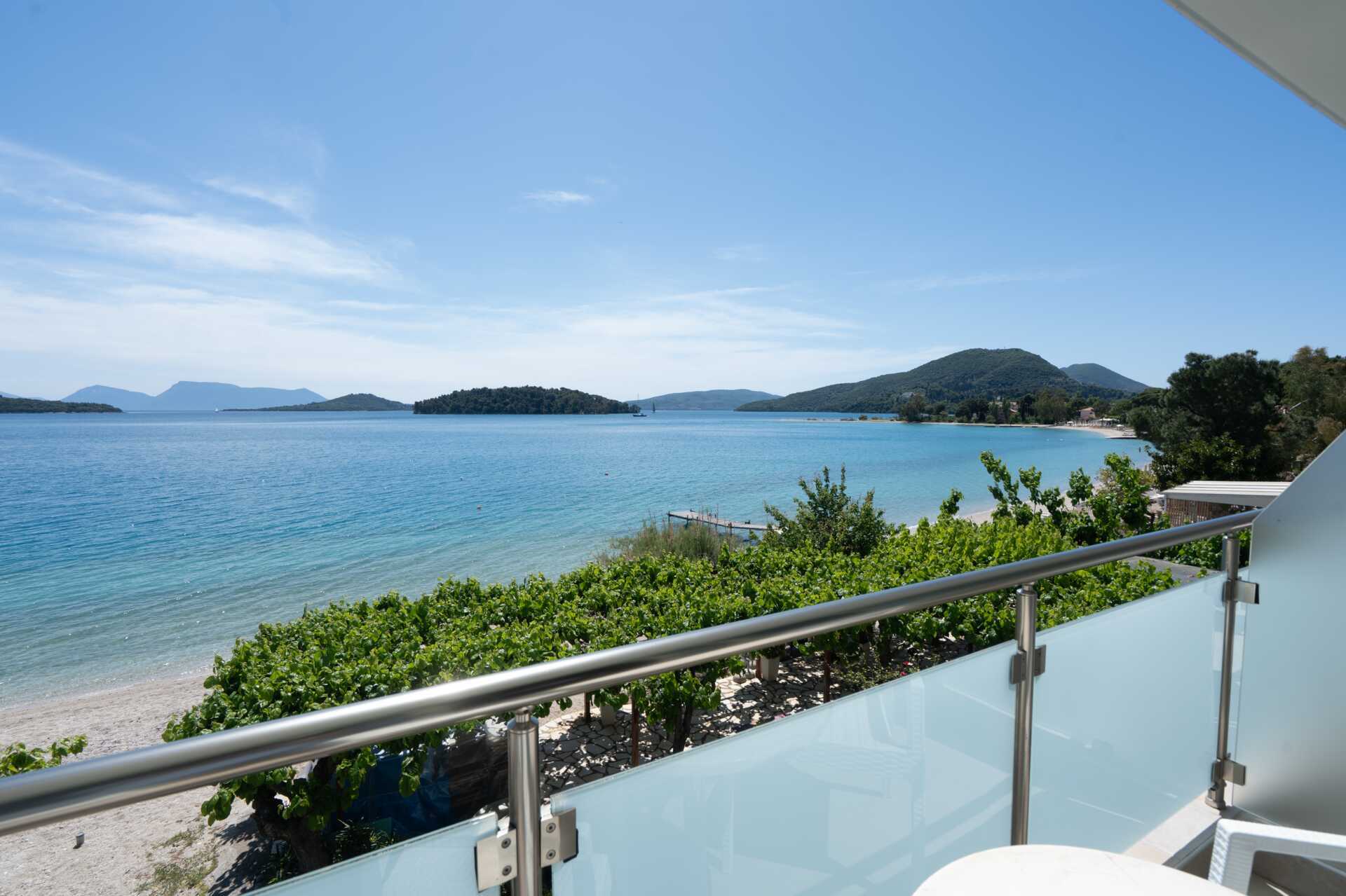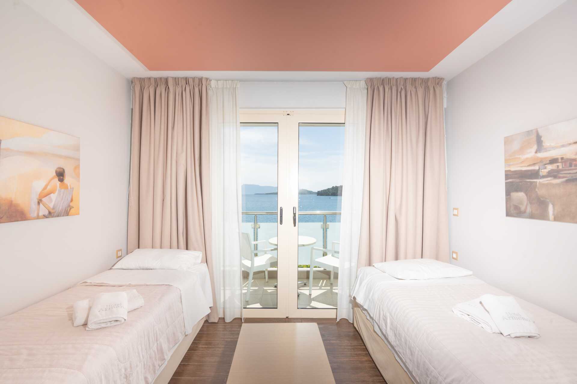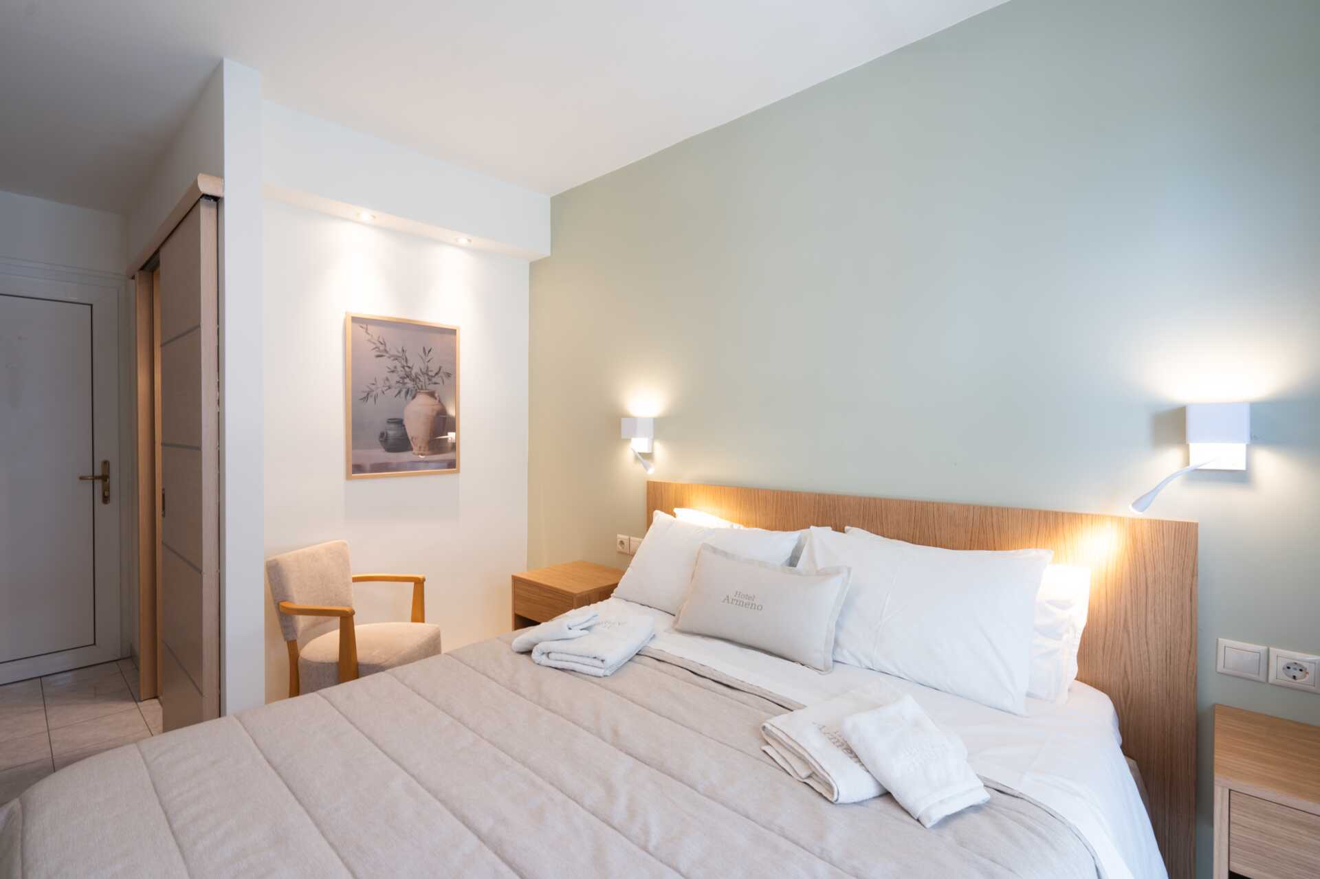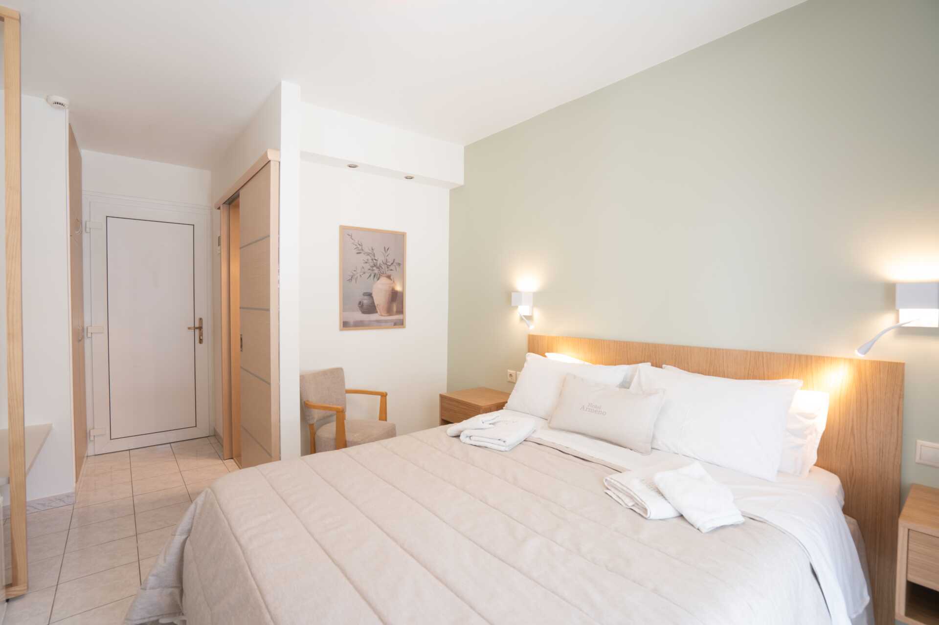 Dubbelrum med balkong eller markterrass, med begränsad havsutsikt eller med havsutsikt. En dubbelsäng eller två enkelsängar. Möjlighet till extrabäddar i enkelsängar. Wifi, luftkonditionering och deponering ingår. Kylskåp. Vattenkokare samt kaffe och te. Tv med internationella kanaler. Hårtork. Badrum med dusch och wc. Städning 7 ggr/vecka.