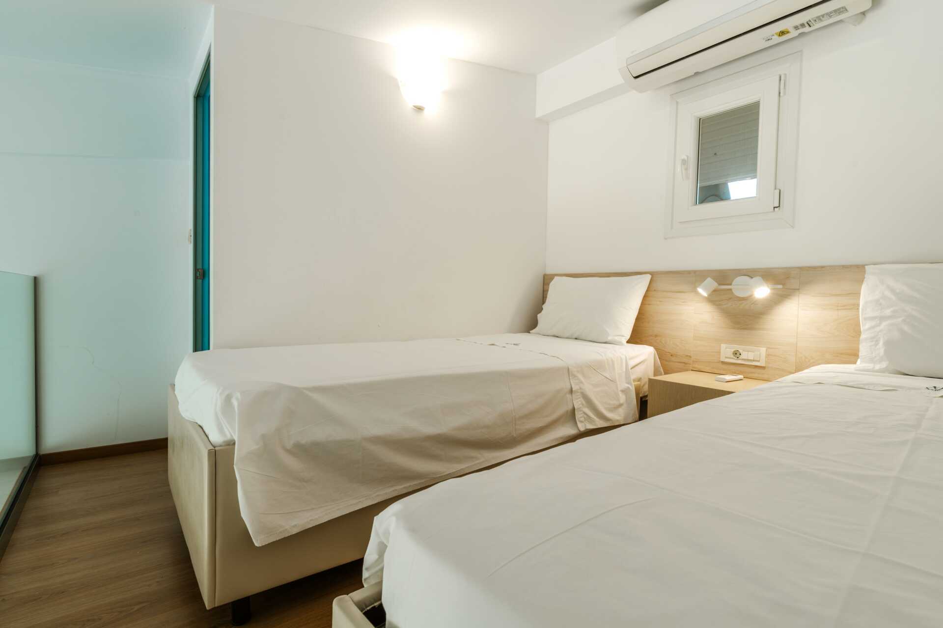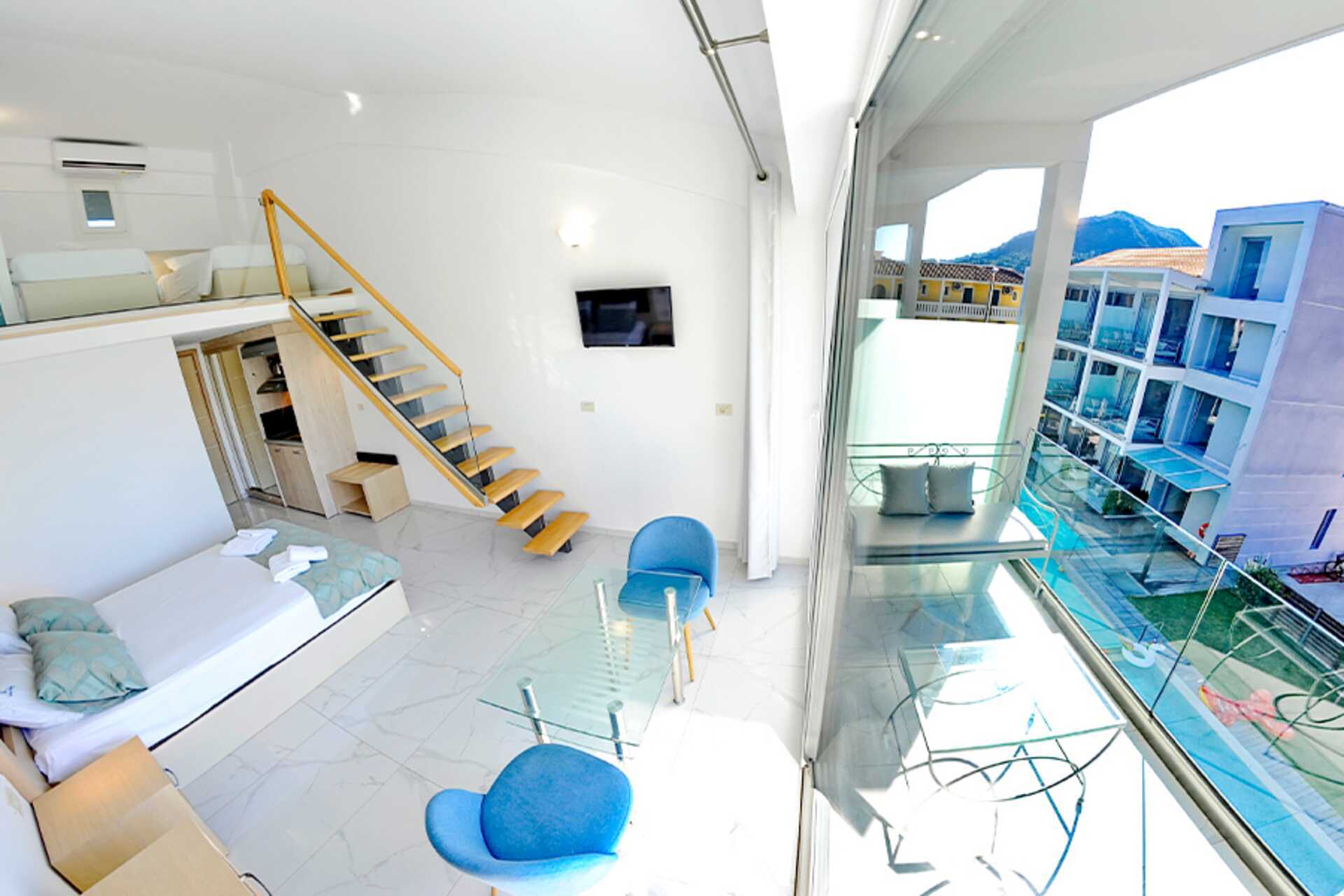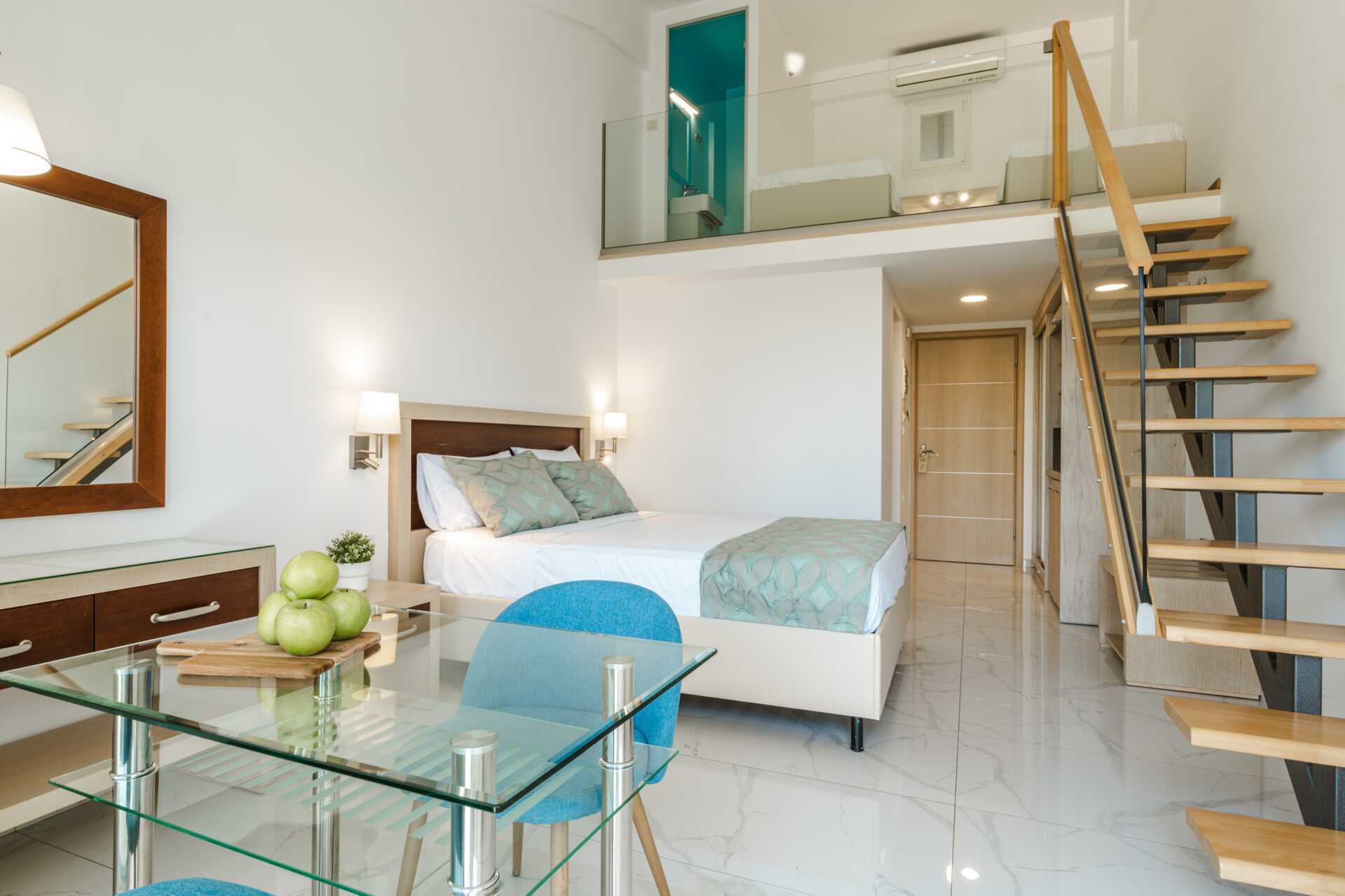 Enrumslägenhet i etage med balkong och poolutsikt. Lägenheten ligger i hotellets nya del. I entréplan finns en dubbelsäng, ett minikök och en separat wc. En trappa upp finns ett sovloft med två enkelsängar och ett badrum. Minikök med kokplattor, kylskåp, vattenkokare och enkel köksutrustning. Wifi, luftkonditionering och deponering ingår. Tv med lokala kanaler. Badrum med dusch och wc. Städning 6 ggr/vecka.