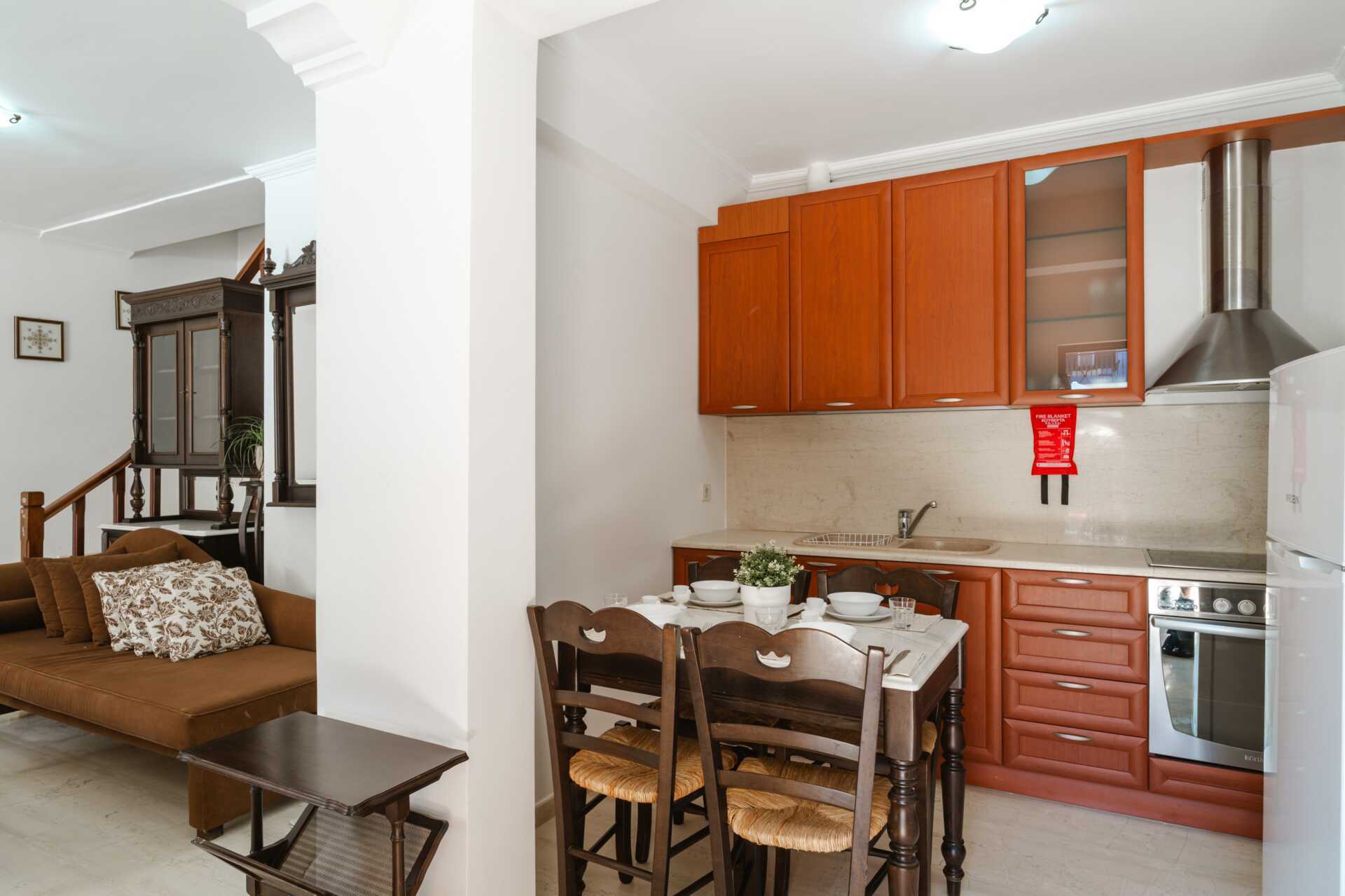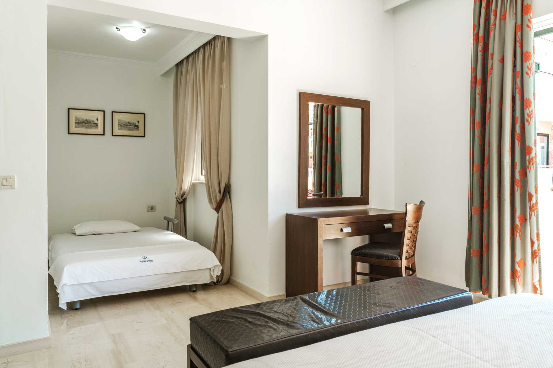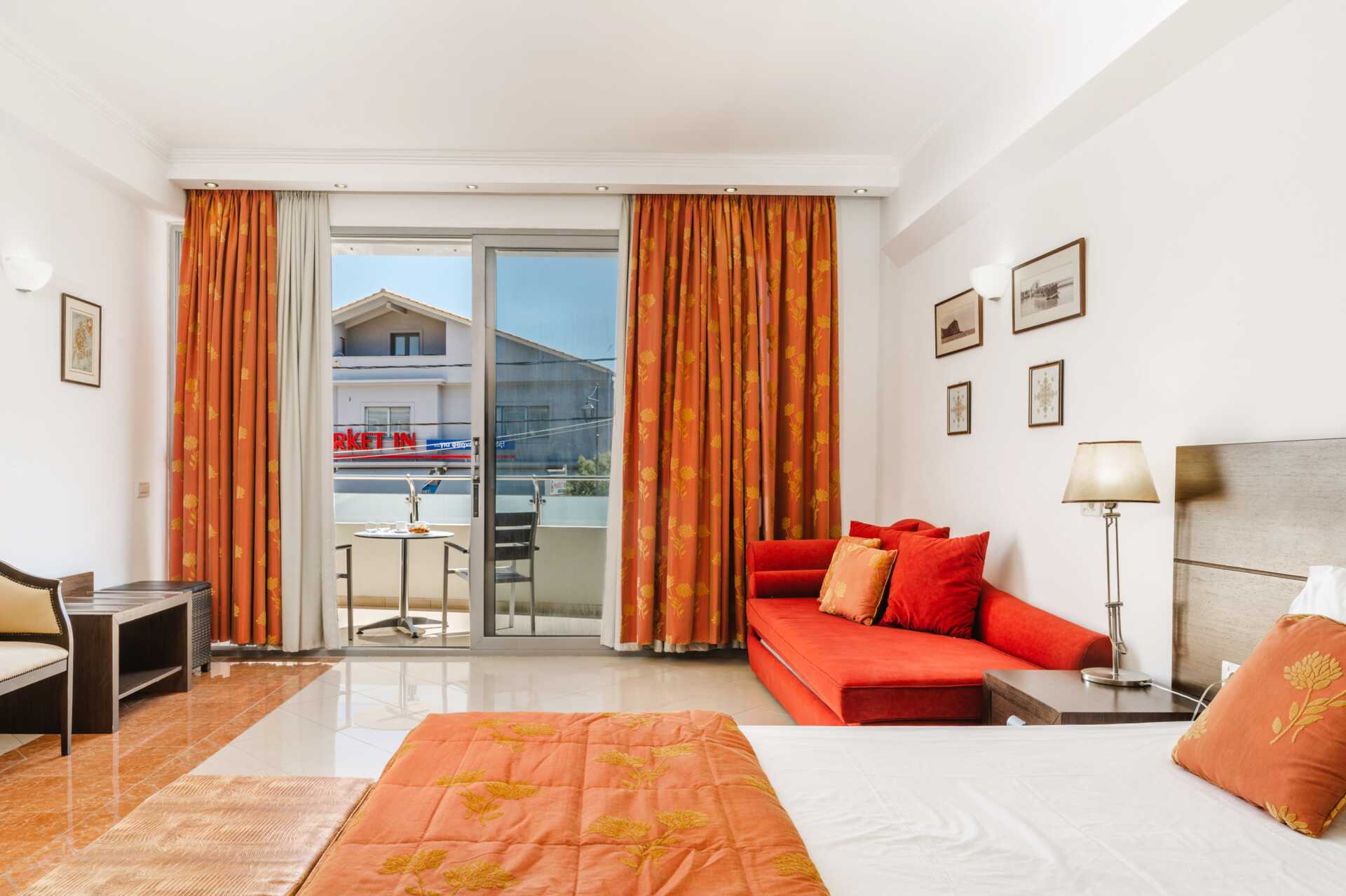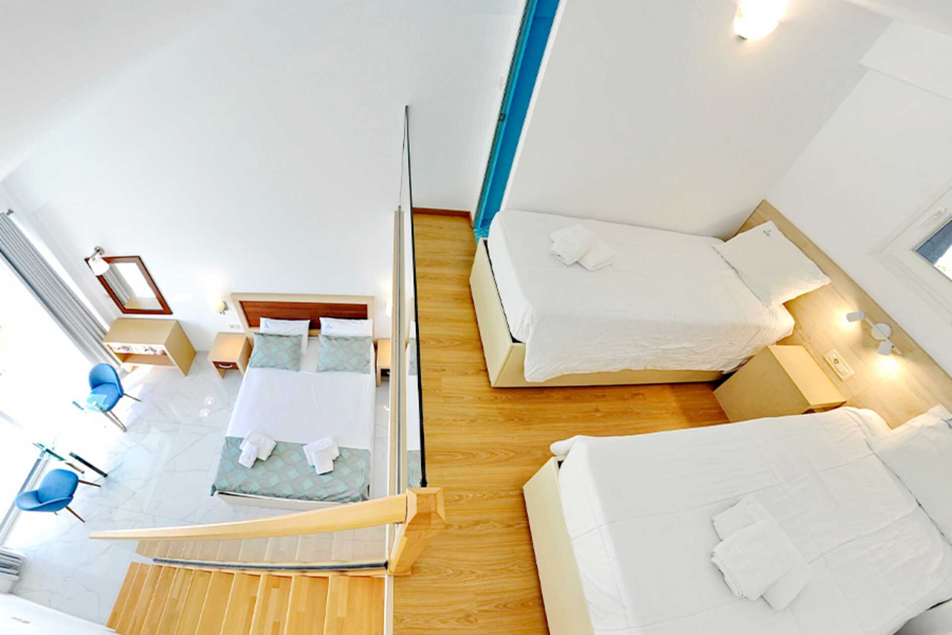 Enrumslägenhet i etage med balkong och poolutsikt. Lägenheten ligger i hotellets nya del. I entréplan finns en dubbelsäng, ett minikök och en separat wc. En trappa upp finns ett sovloft med två enkelsängar och ett badrum. Minikök med kokplattor, kylskåp, vattenkokare och enkel köksutrustning. Wifi, luftkonditionering och deponering ingår. Tv med lokala kanaler. Badrum med dusch och wc. Städning 6 ggr/vecka.