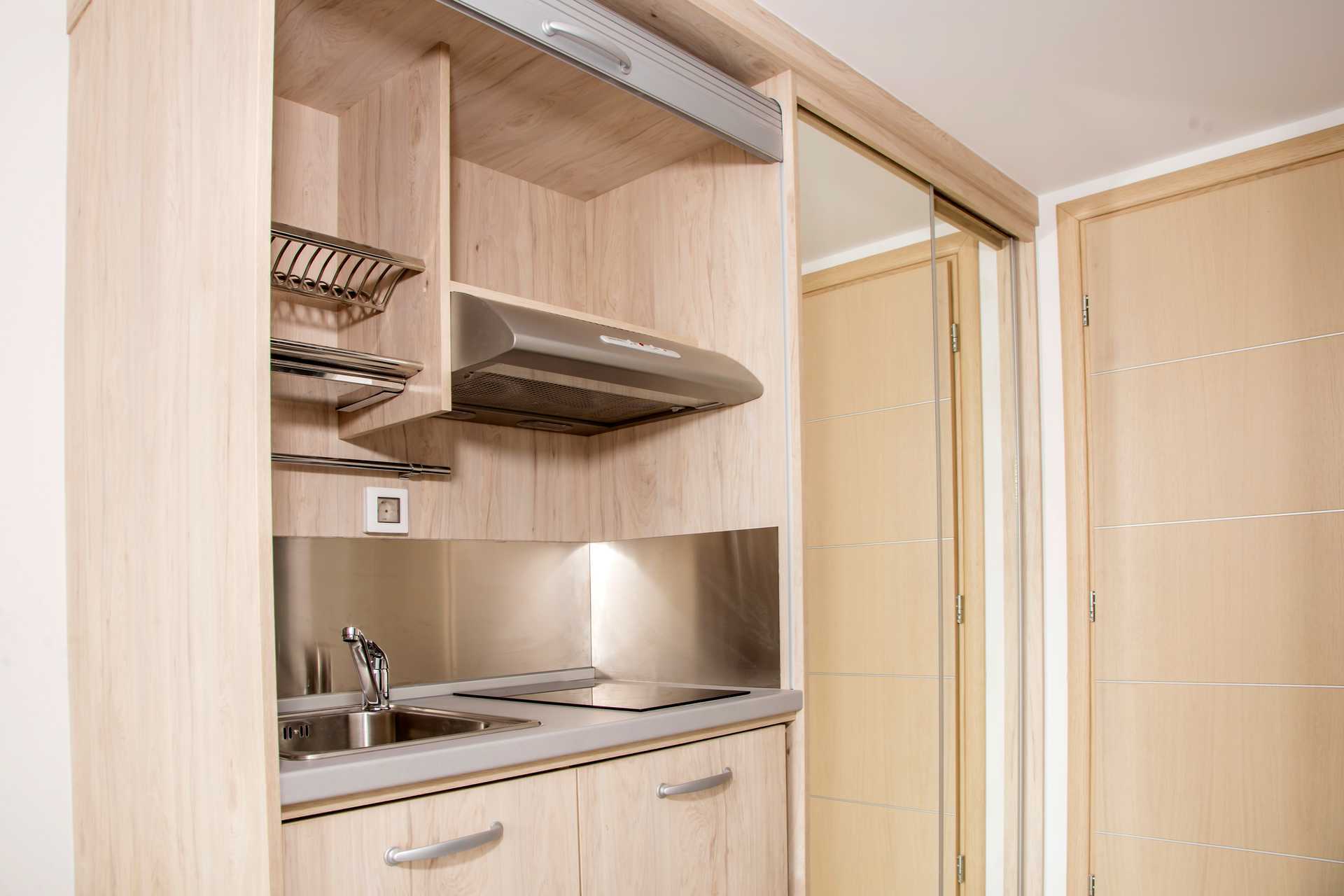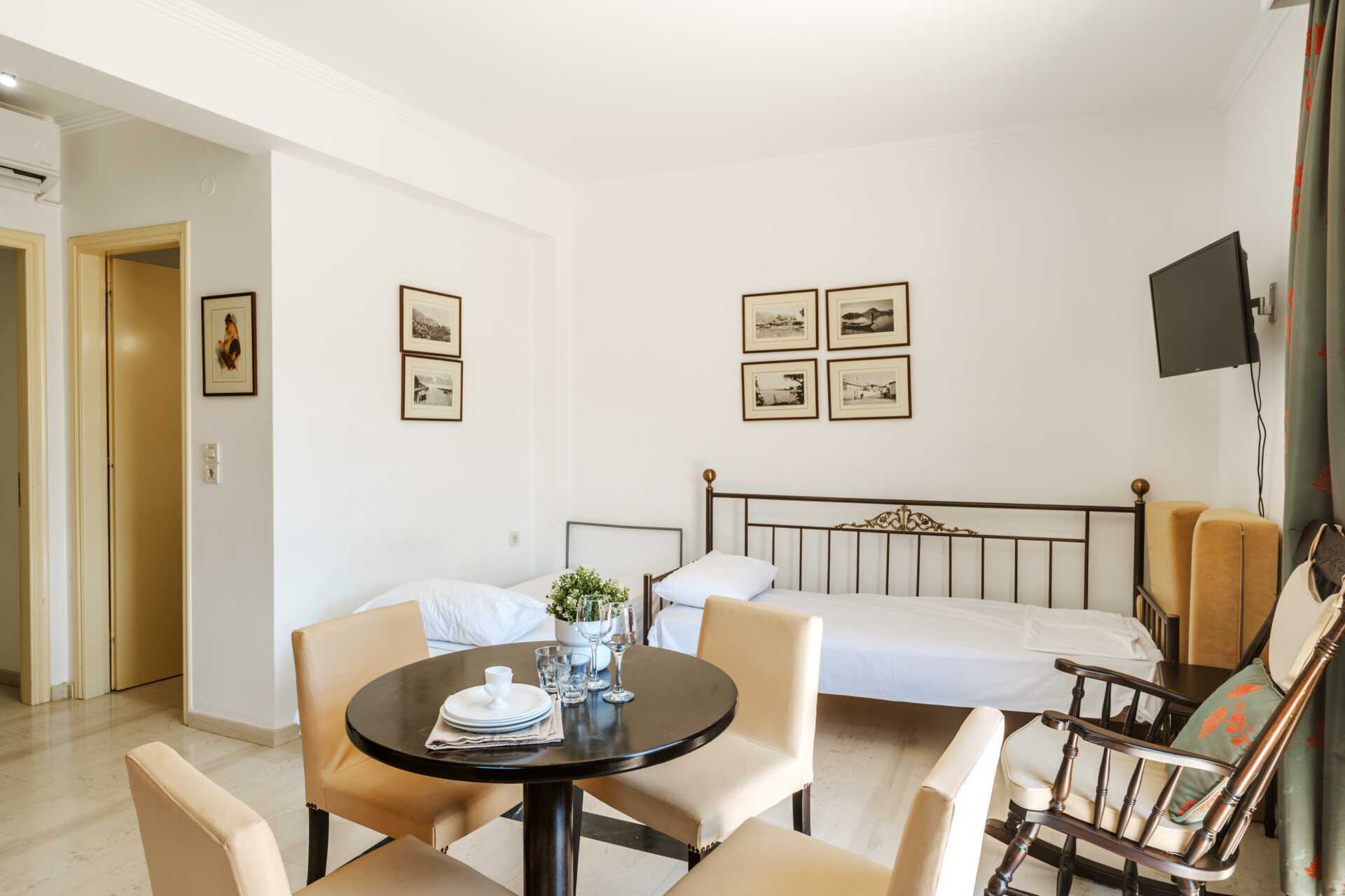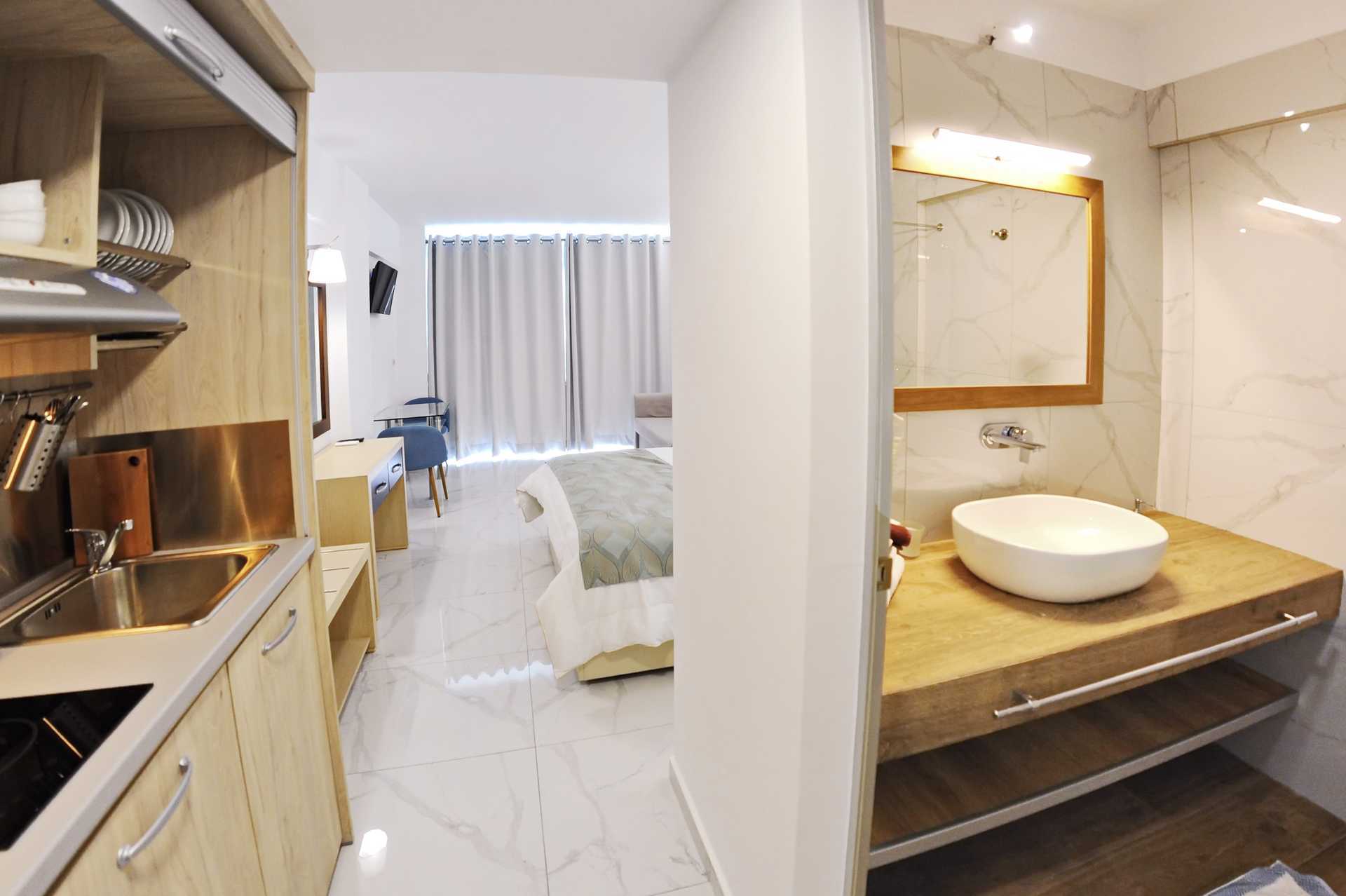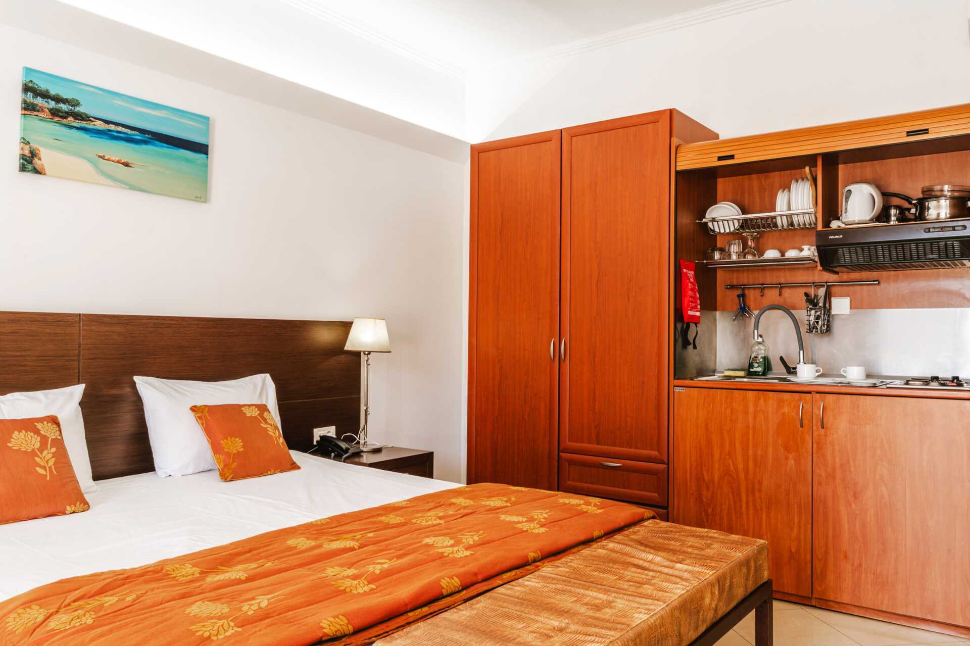 Enrumslägenhet med balkong eller markbalkong, vissa med poolutsikt. Alla enrumslägenheter är i den äldre delen. Sovrum kombinerat med minikök. En dubbelsäng eller två enkelsängar. Möjlighet till extrabäddar i bäddsoffa. Minikök med kylskåp, kokplattor, vattenkokare och enkel köksutrustning. Wifi, luftkonditionering och deponering ingår. Tv med lokala kanaler. Hårtork. Badrum med dusch och wc. Städning 6 ggr/vecka. Inredning kan variera mellan lägenheterna.