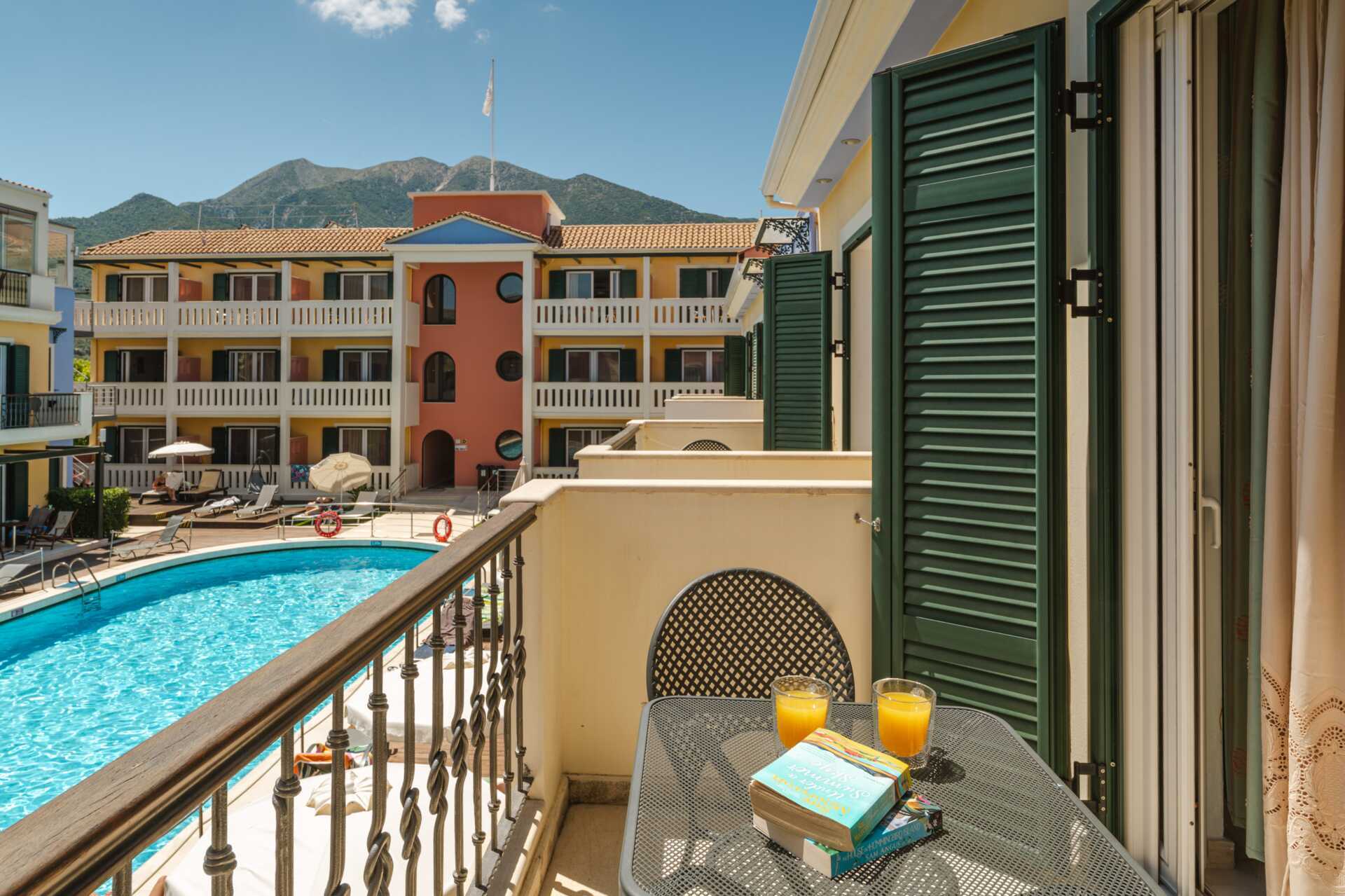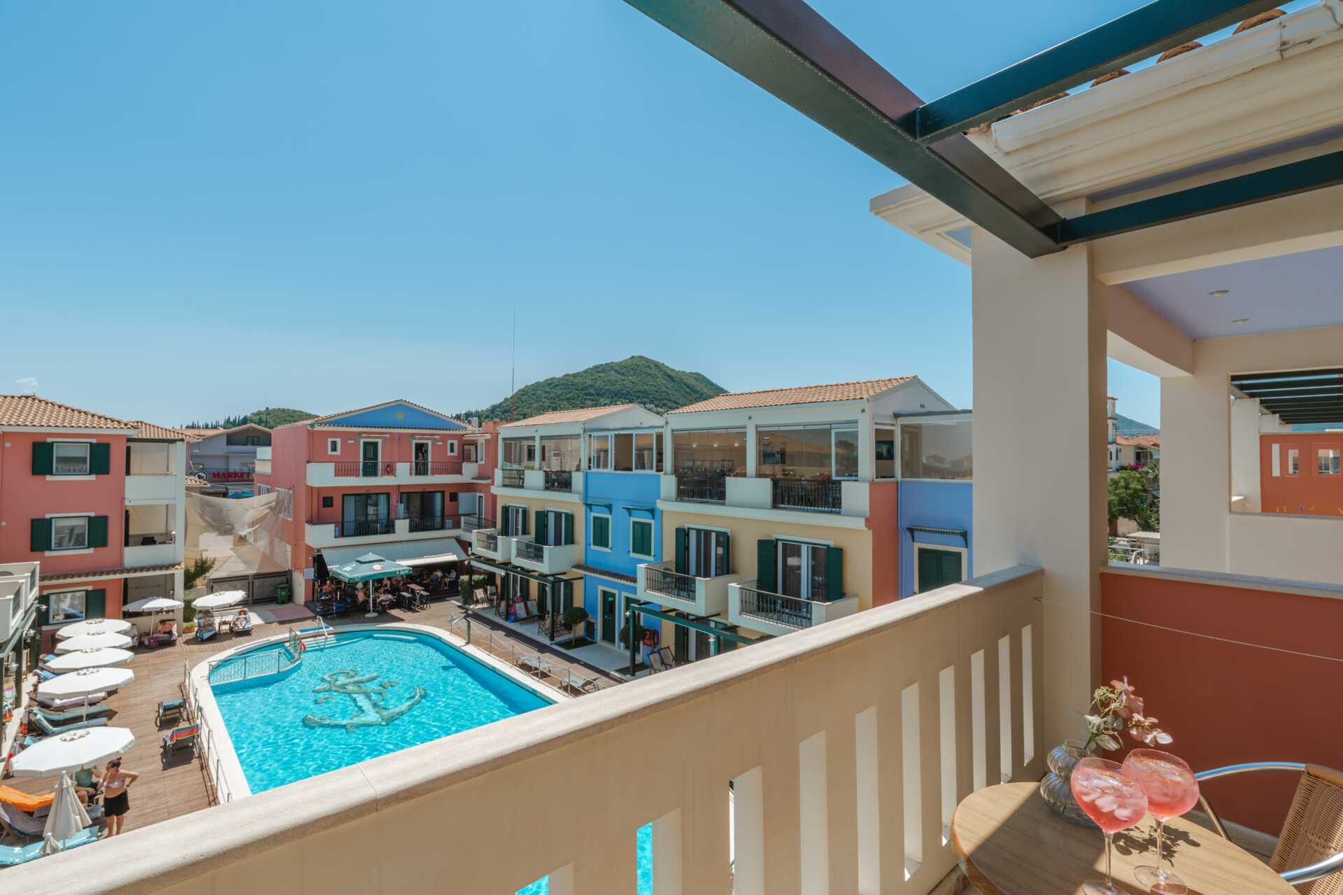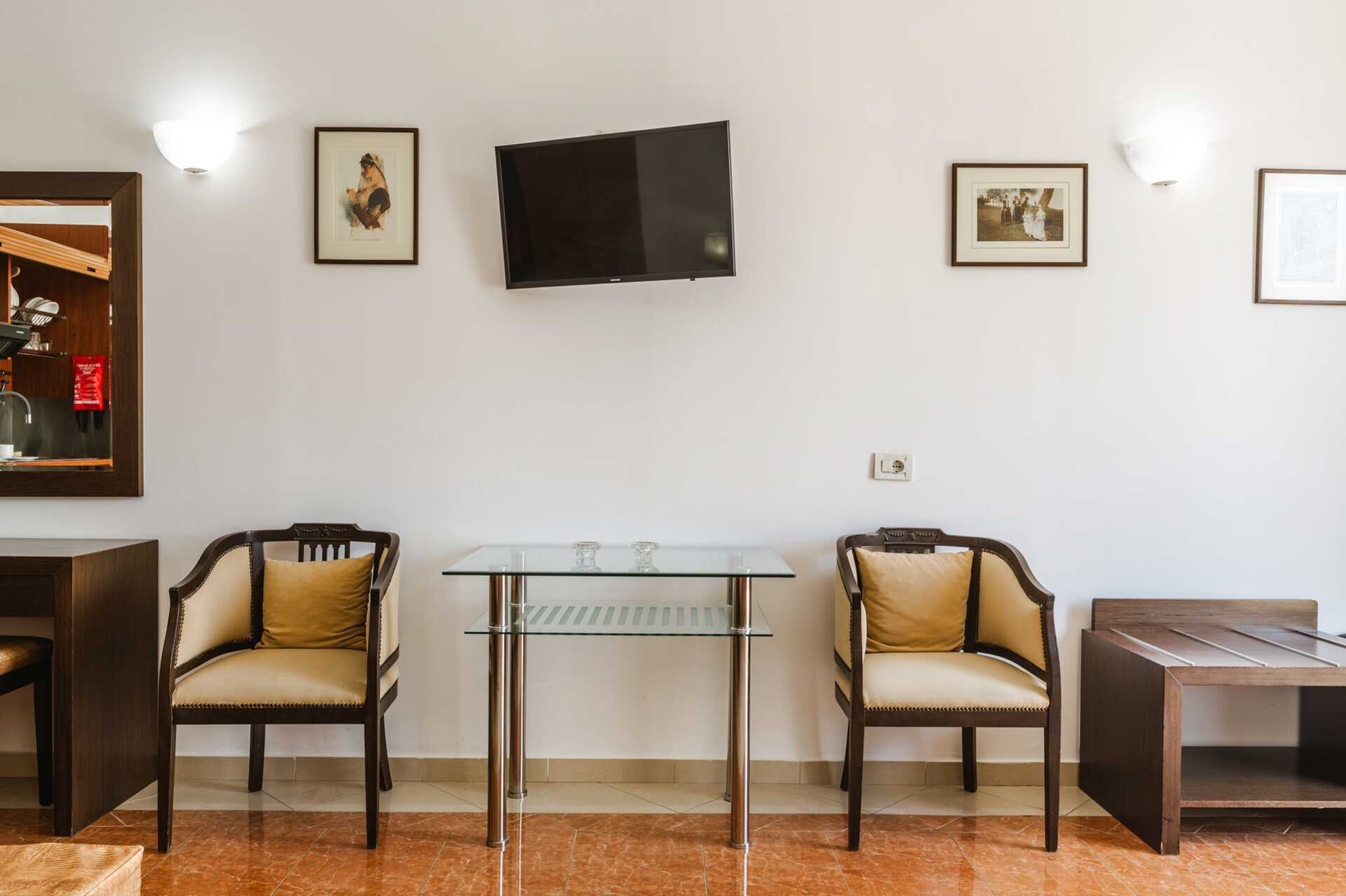 Tvårumslägenhet med balkong som har poolutsikt. Tvårumslägenheterna ligger i den äldre delen. Sovrum och kombinerat vardagsrum med minikök. En dubbelsäng eller två enkelsängar. Möjlighet till extrabädd i bäddsoffa. Minikök med kylskåp, kokplattor, vattenkokare och enkel köksutrustning. Wifi, luftkonditionering och deponering ingår. Tv med lokala kanaler. Badrum med dusch och wc. Städning 6 ggr/vecka.