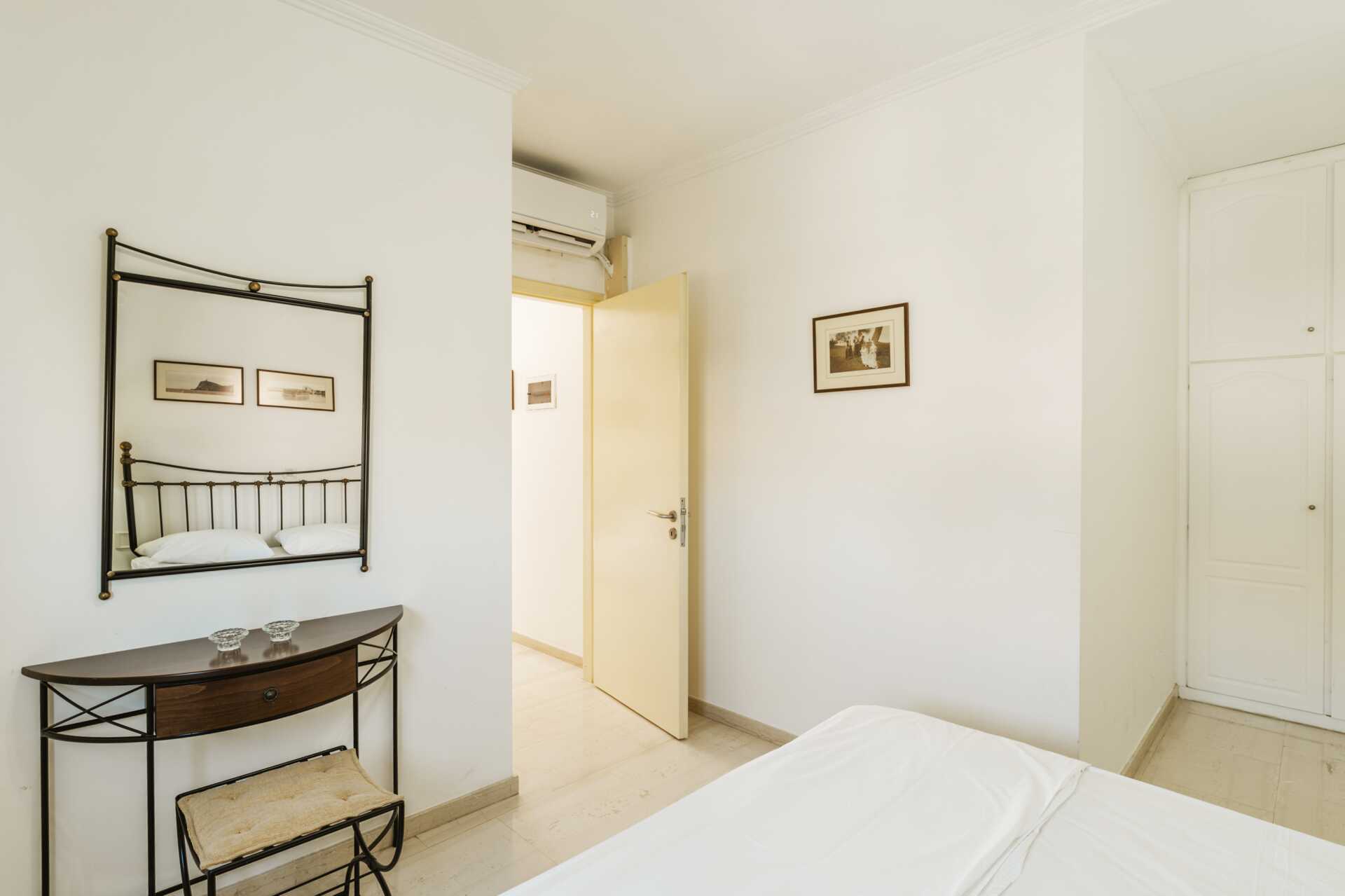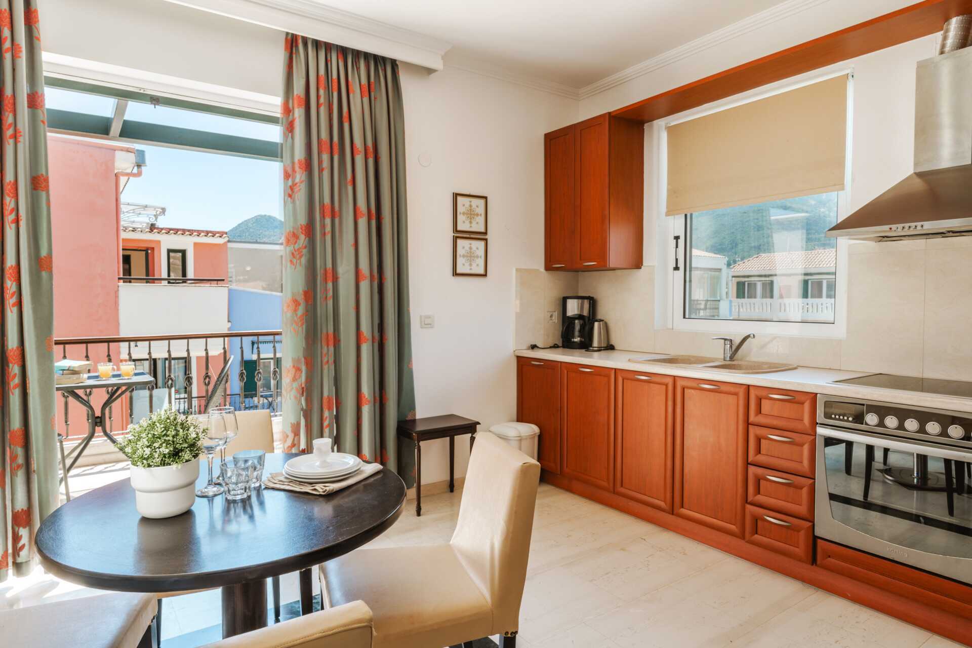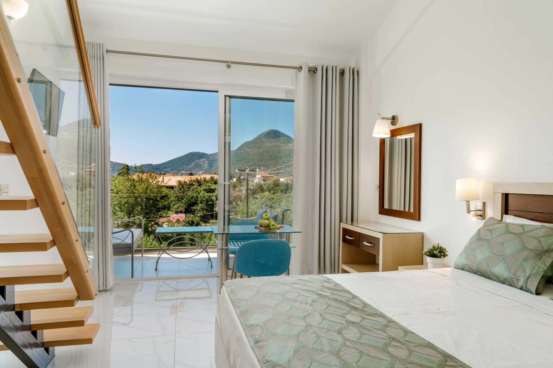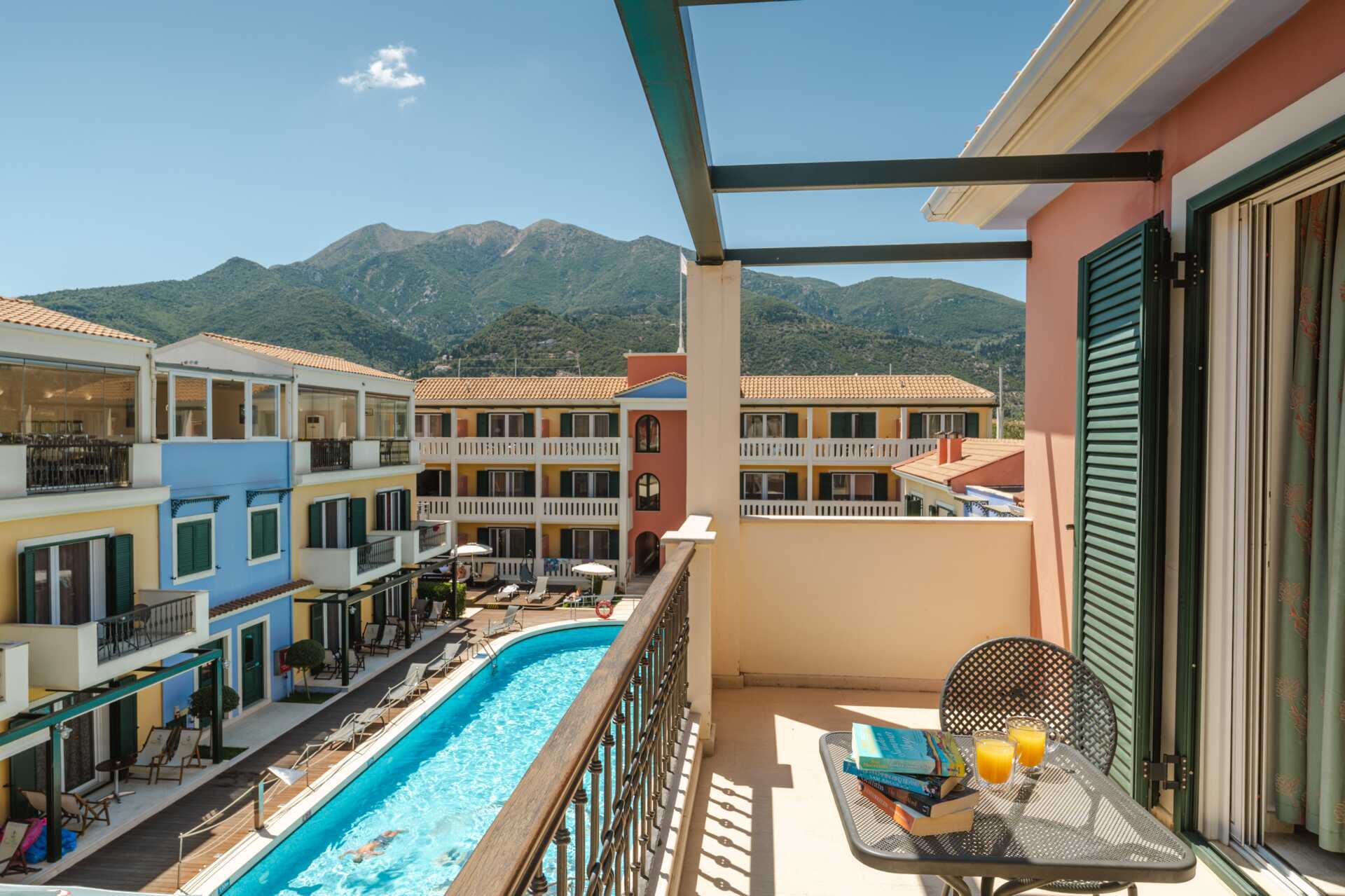 Tvårumslägenhet i etage med uteplats på nedre plan samt en balkong som ligger på det övre planet med utsikt mot poolen. Tvårumslägneheterna i etage ligger i den äldre delen. I entréplan finns ett kombinerat minikök med vardagsrum och ett litet badrum. En trappa upp finns ett sovrum och ett större badrum med dusch och wc. En dubbelsäng eller två enkelsängar. Möjlighet till extrabäddar i bäddsoffa. Wifi, luftkonditionering och deponering ingår. Tv med lokala kanaler. Hårtork. Städning 6 ggr/vecka.