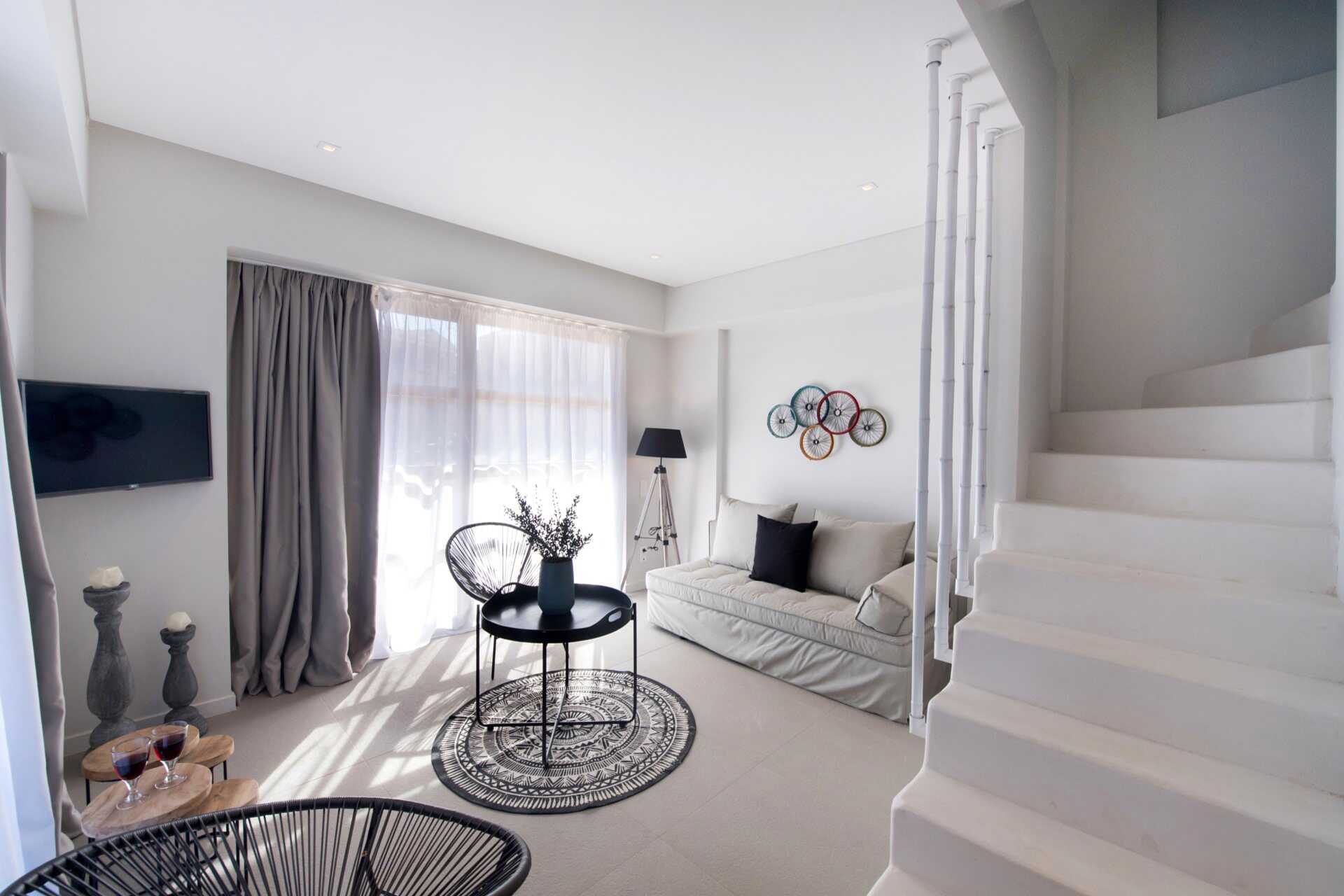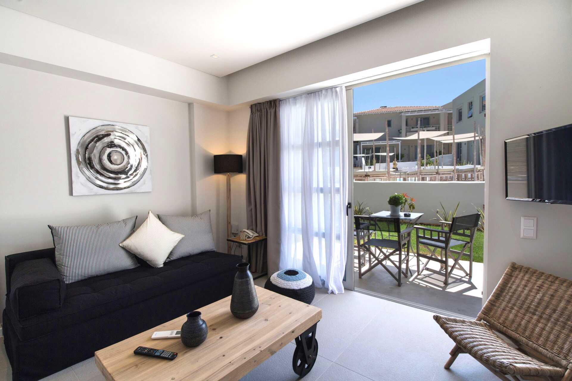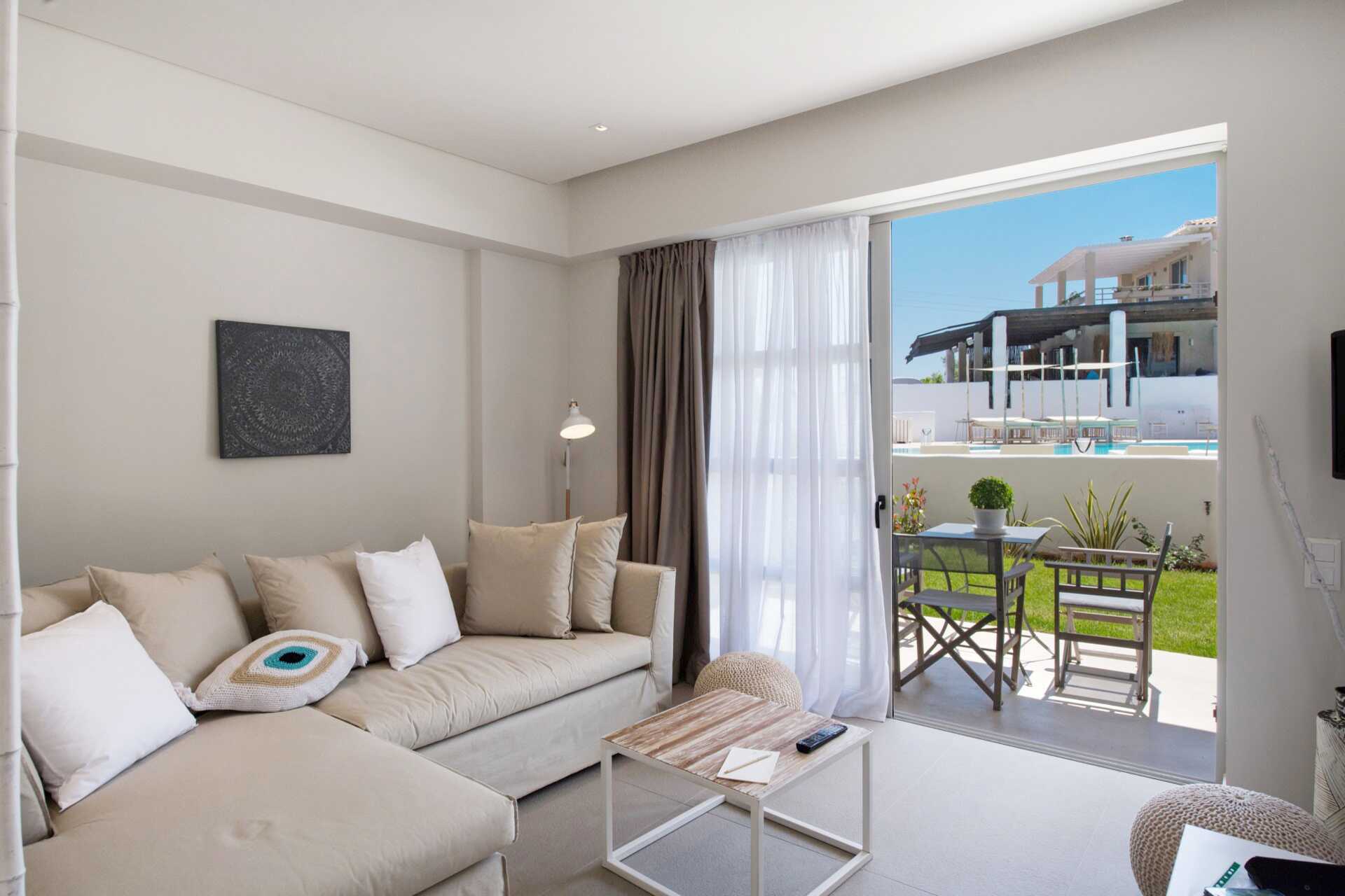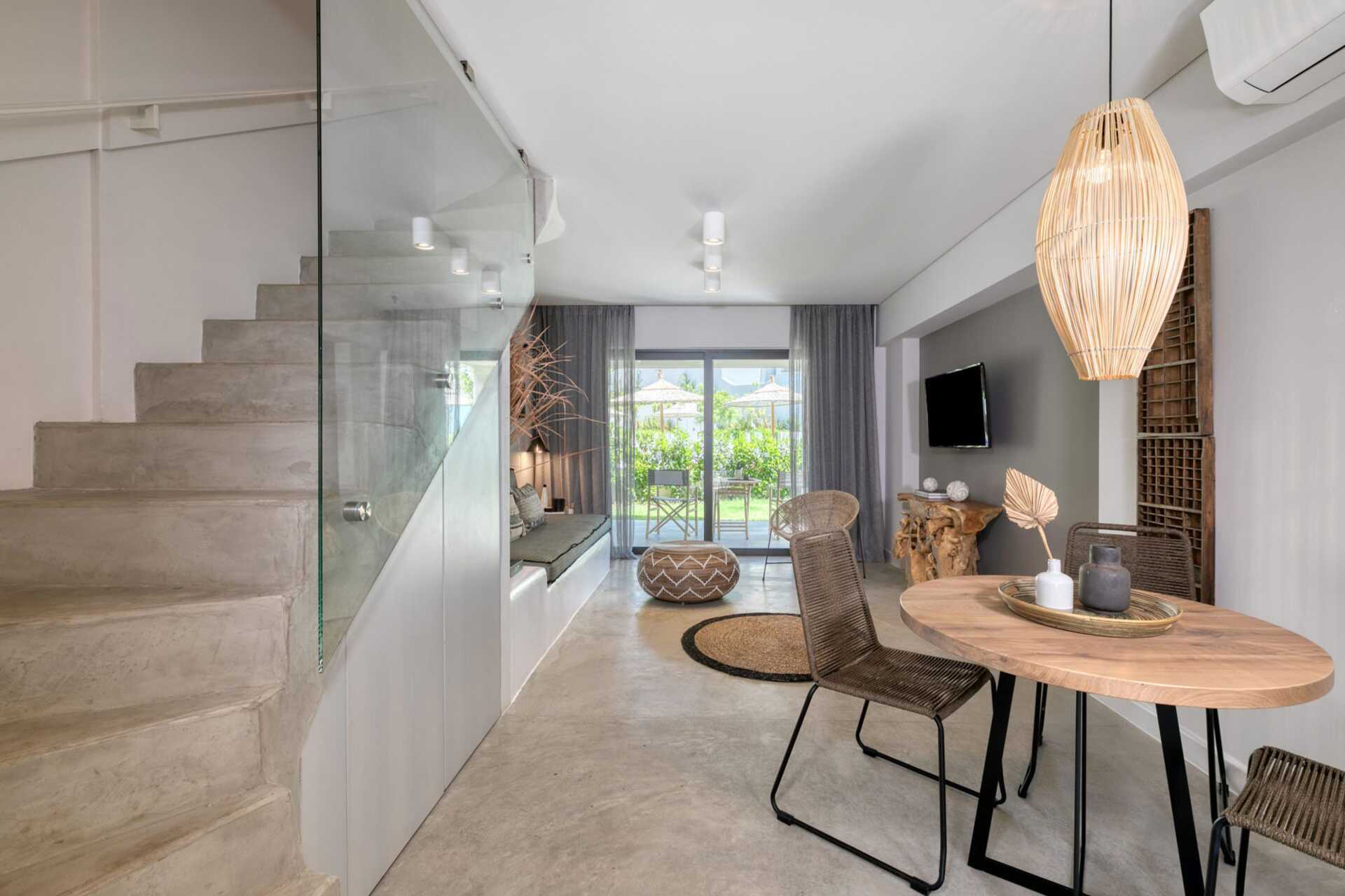 Tvårumssvit med markterrass. På entréplan finns ett vardagsrum med matplats - vissa vid bardisk, en eller två bäddsoffor, toalett och en uteplats. En trappa upp finns två sovrum, varav ett med balkong. Ett sovrum med en dubbelsäng och ett sovrum med två enkelsängar samt ett badrum med dusch och wc. Wifi, luftkonditionering och deponering ingår. Minibar. Vattenkokare samt kaffe och te. Tv med internationella kanaler. Hårtork. Städning 7 ggr/vecka.