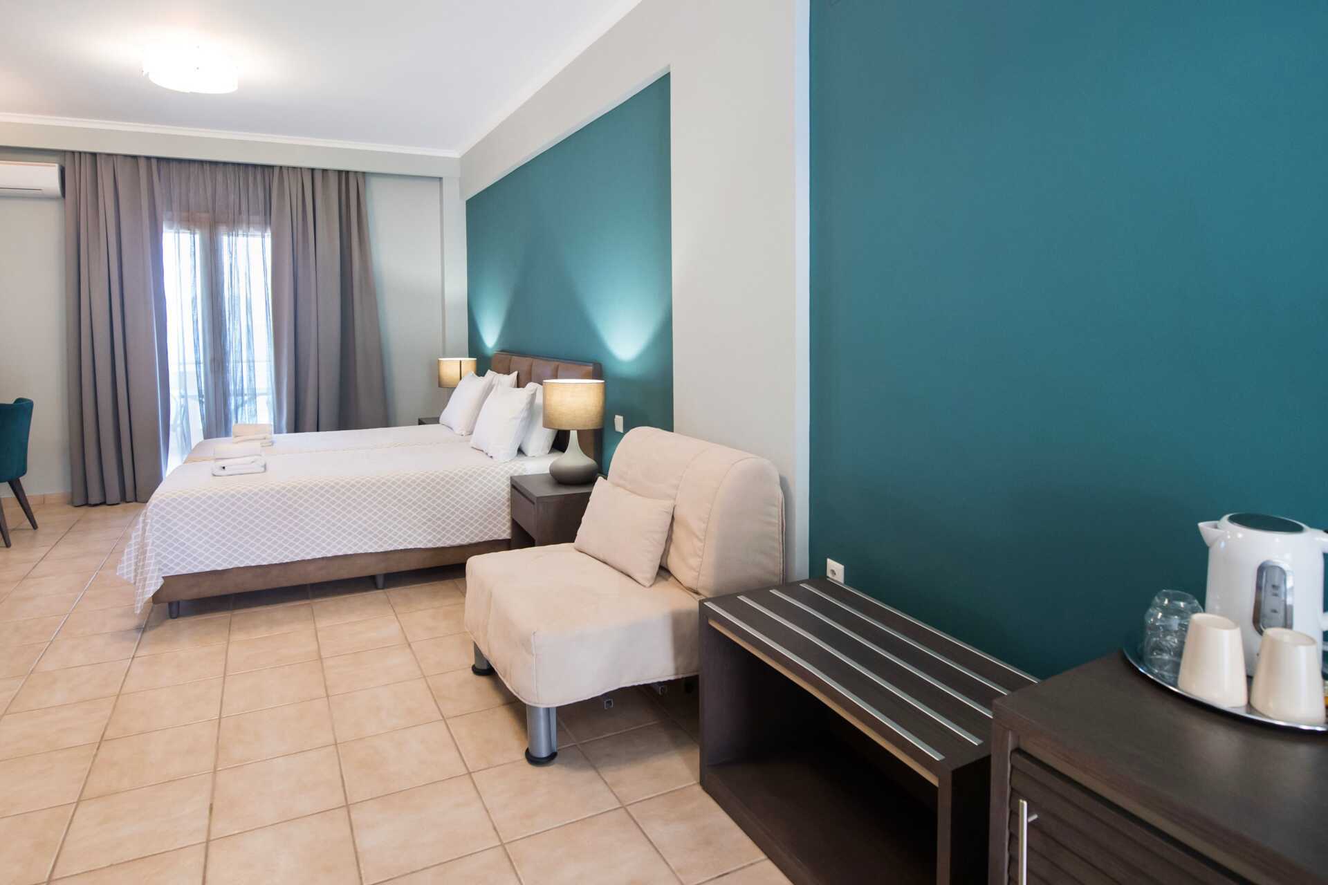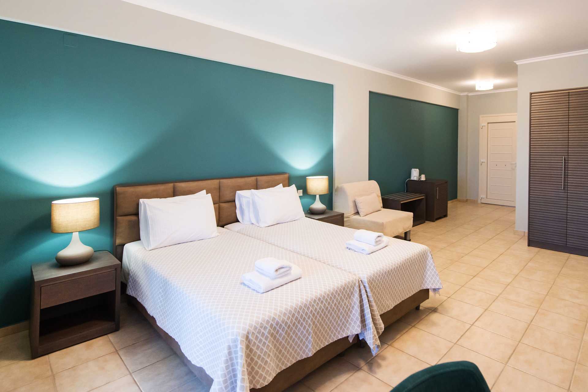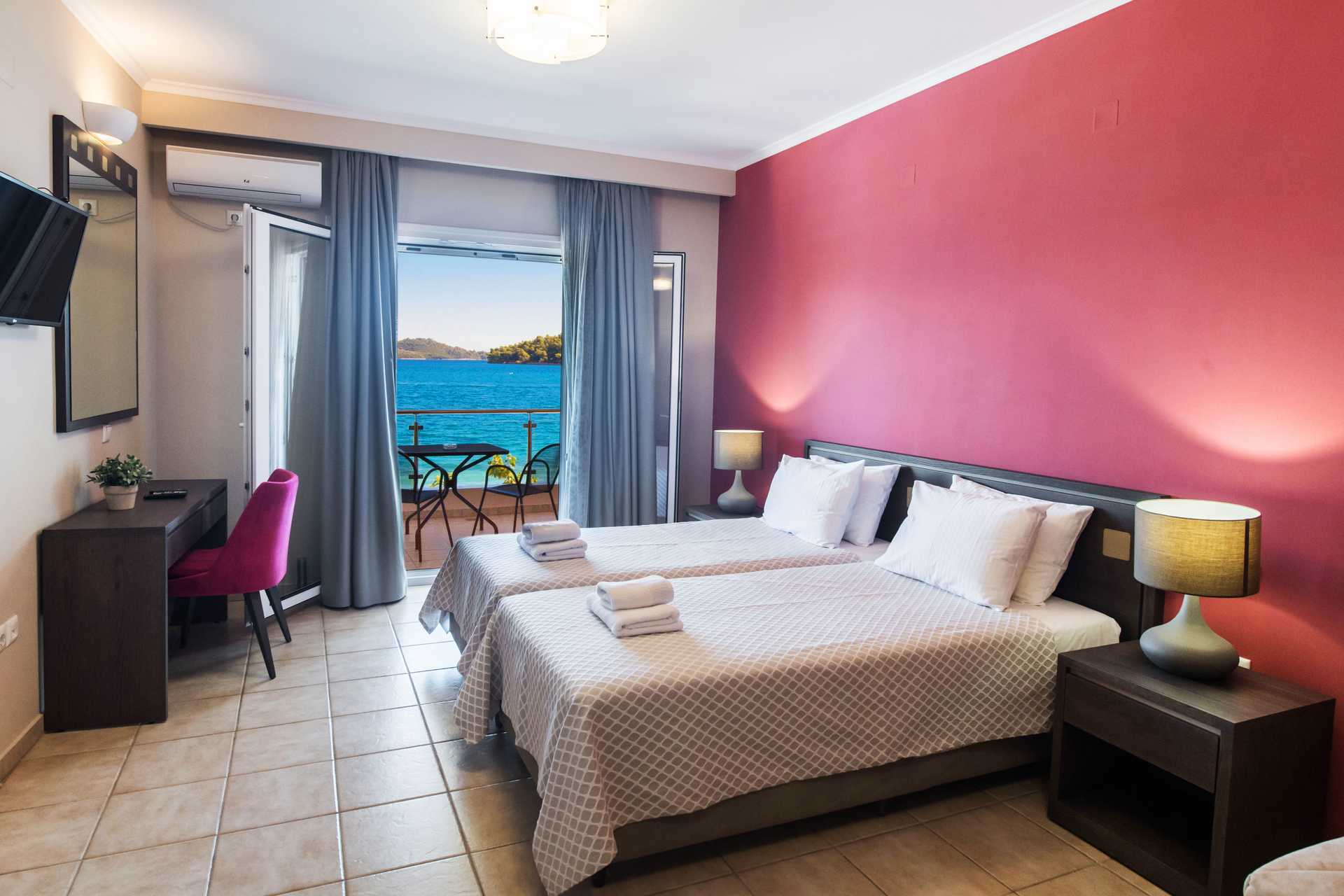 Dubbelrum med balkong eller markbalkong och havsutsikt. Två enkelsängar. Möjlighet till extrabädd i bäddbar fåtölj. Luftkonditionering, deponering och wifi ingår. Kylskåp och vattenkokare. Tv med satellitkanaler. Hårtork. Badrum med dusch och wc. Städning 6 ggr/vecka.