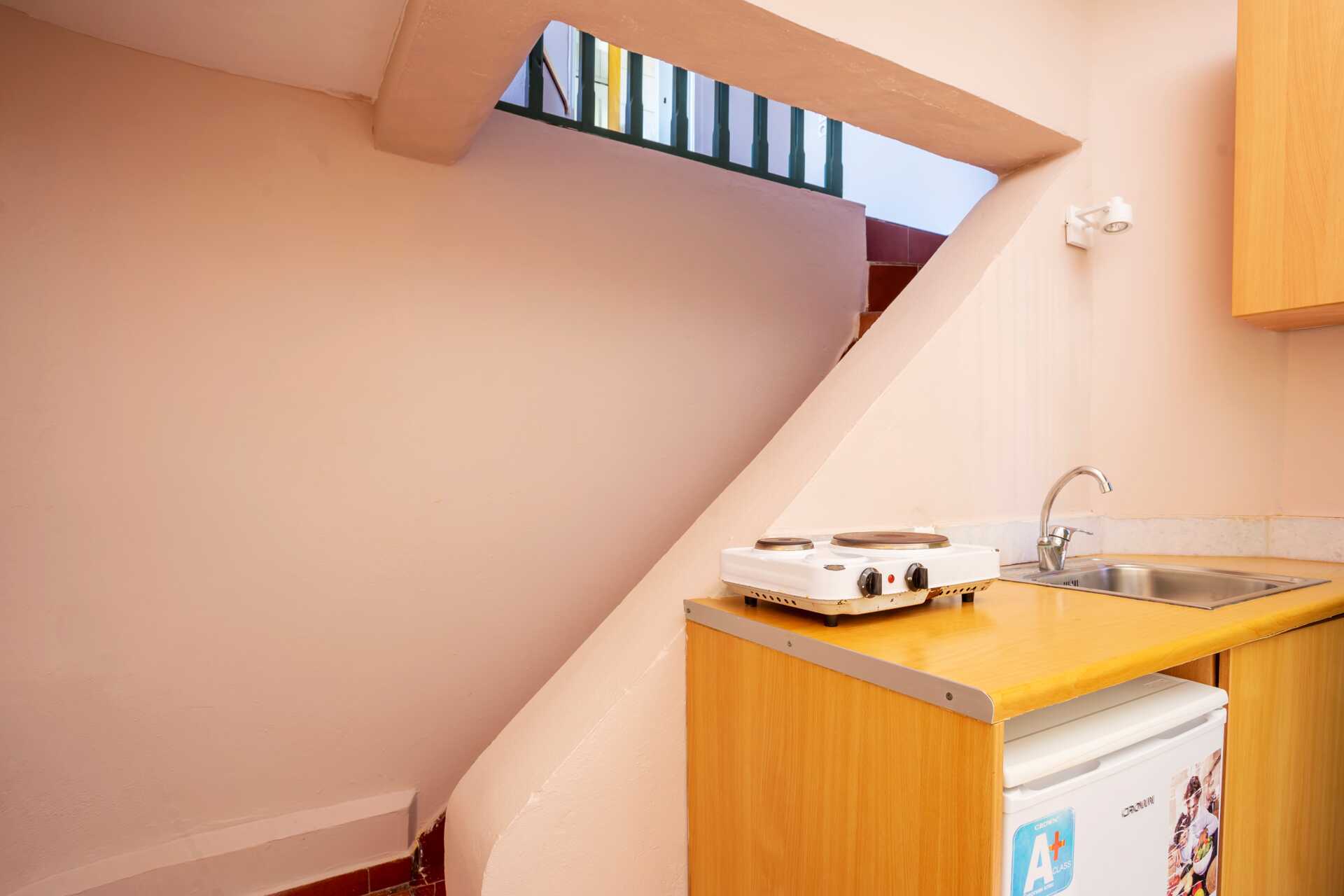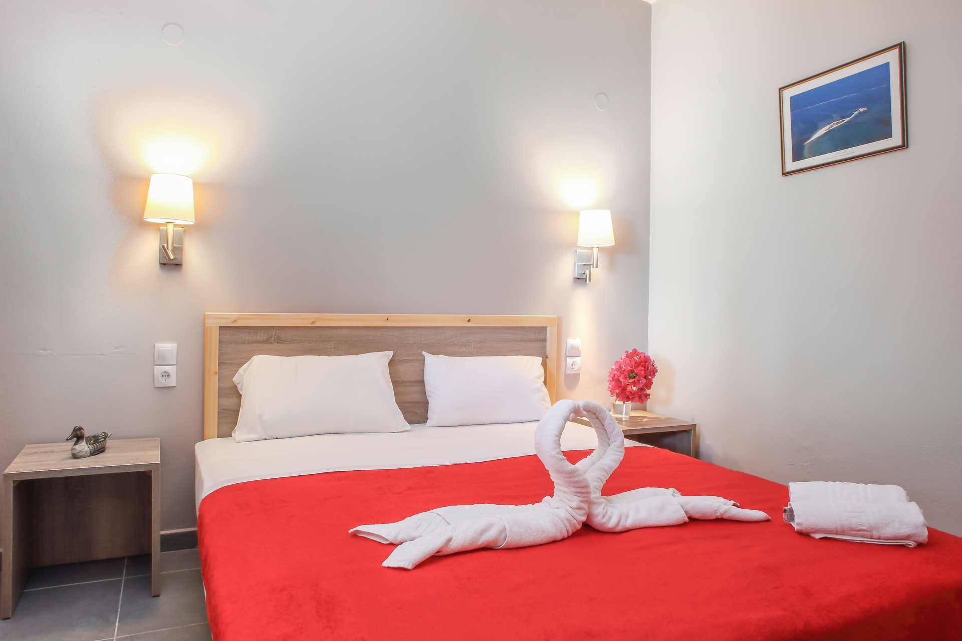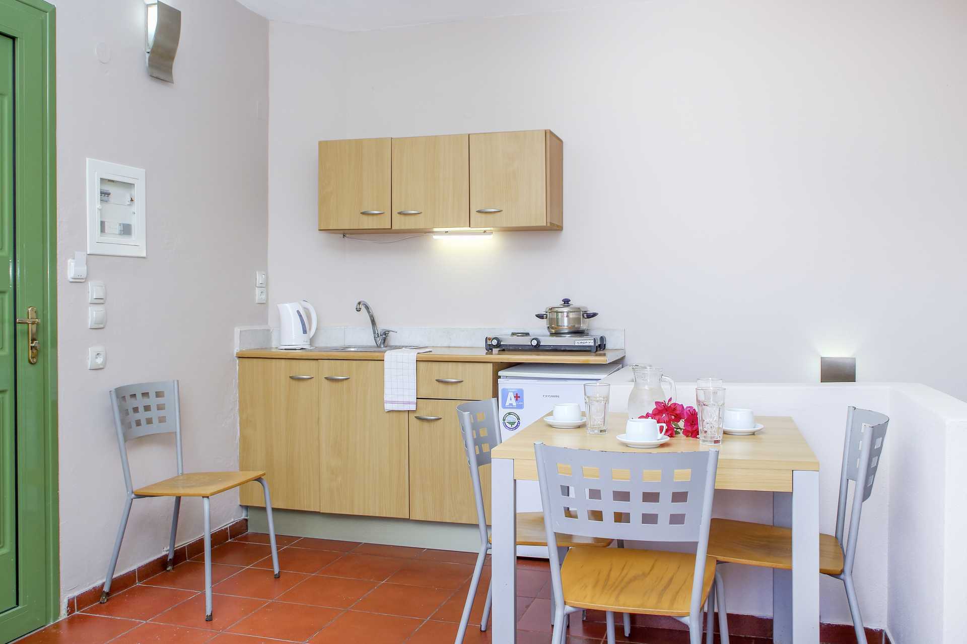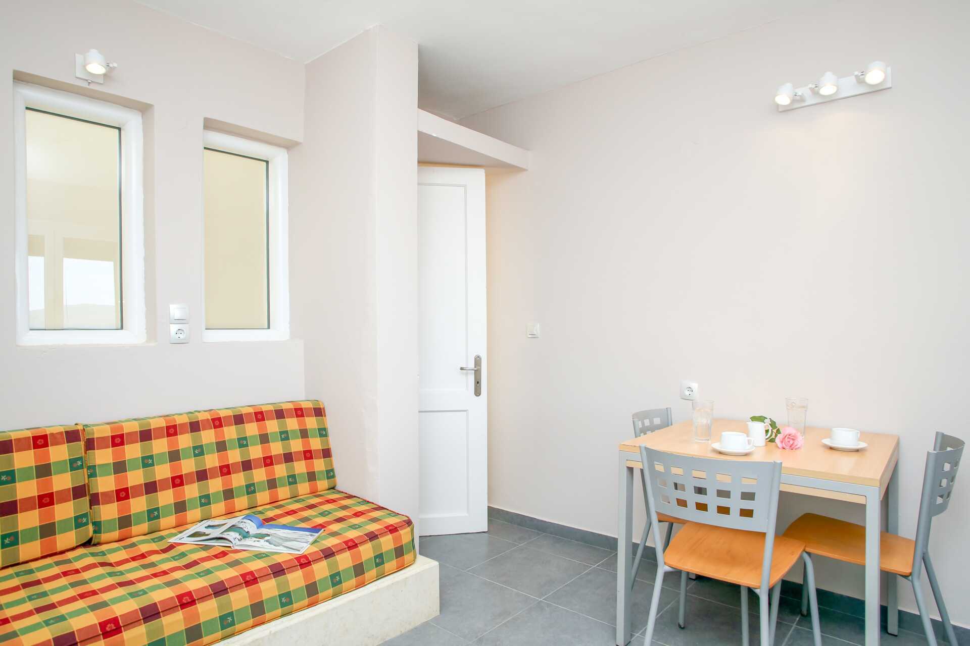 Ej renoverade tvårumslägenheter i etage och av varierande storlek och standard. Balkong med begränsad havsutsikt. En trappa upp finns sovrum och badrum. På entréplan finns ett kombinerat vardagsrum med ett minikök. Golvfasta sängar - en dubbelsäng eller två enkelsängar. Möjlighet till extrabäddar i bäddbar soffa. Minikök med kokplattor, vattenkokare, kylskåp och enkel köksutrustning. Wifi och luftkonditionering ingår. Tv med lokala kanaler i sovrummet. Hårtork. Badrum med badkar eller dusch samt wc. Städning 3 ggr/vecka.