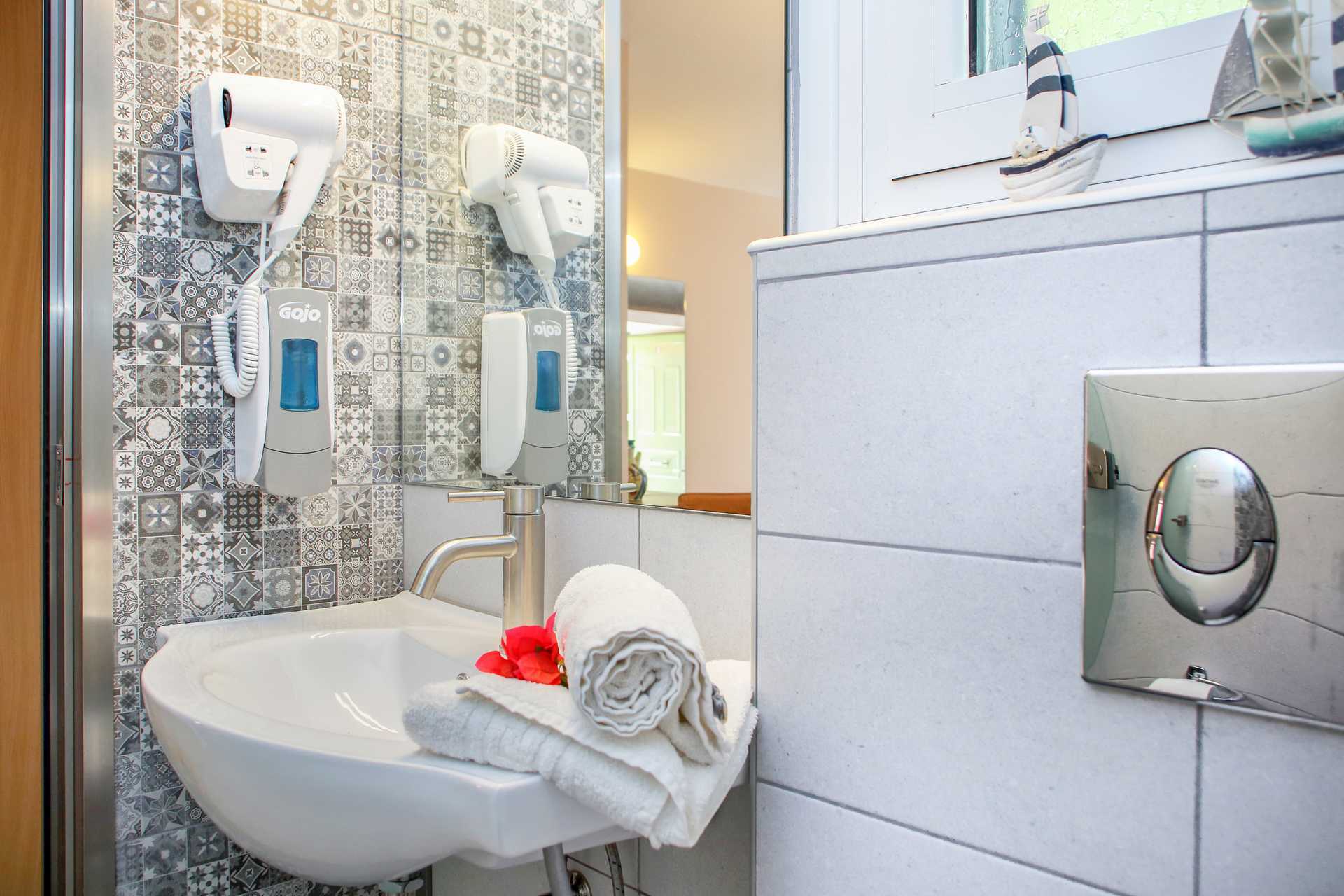 Tvårumslägenheter i etage av varierande storlek. Balkong med havsutsikt. En trappa upp finns ett sovrum och badrum. På entréplan finns ett kombinerat vardagsrum med minikök. Golvfasta sängar, en dubbelsäng eller två enkelsängar. Möjlighet till extrabäddar i bäddsoffa. Minikök med kokplattor, vattenkokare, kylskåp och enkel köksutrustning. Wifi och luftkonditionering ingår. Tv med lokala kanaler i sovrummet. Badrum med badkar eller dusch samt wc. Städning 3 ggr/vecka. När lägenheterna renoverades 2018 var det endast entréplan som renoverades.