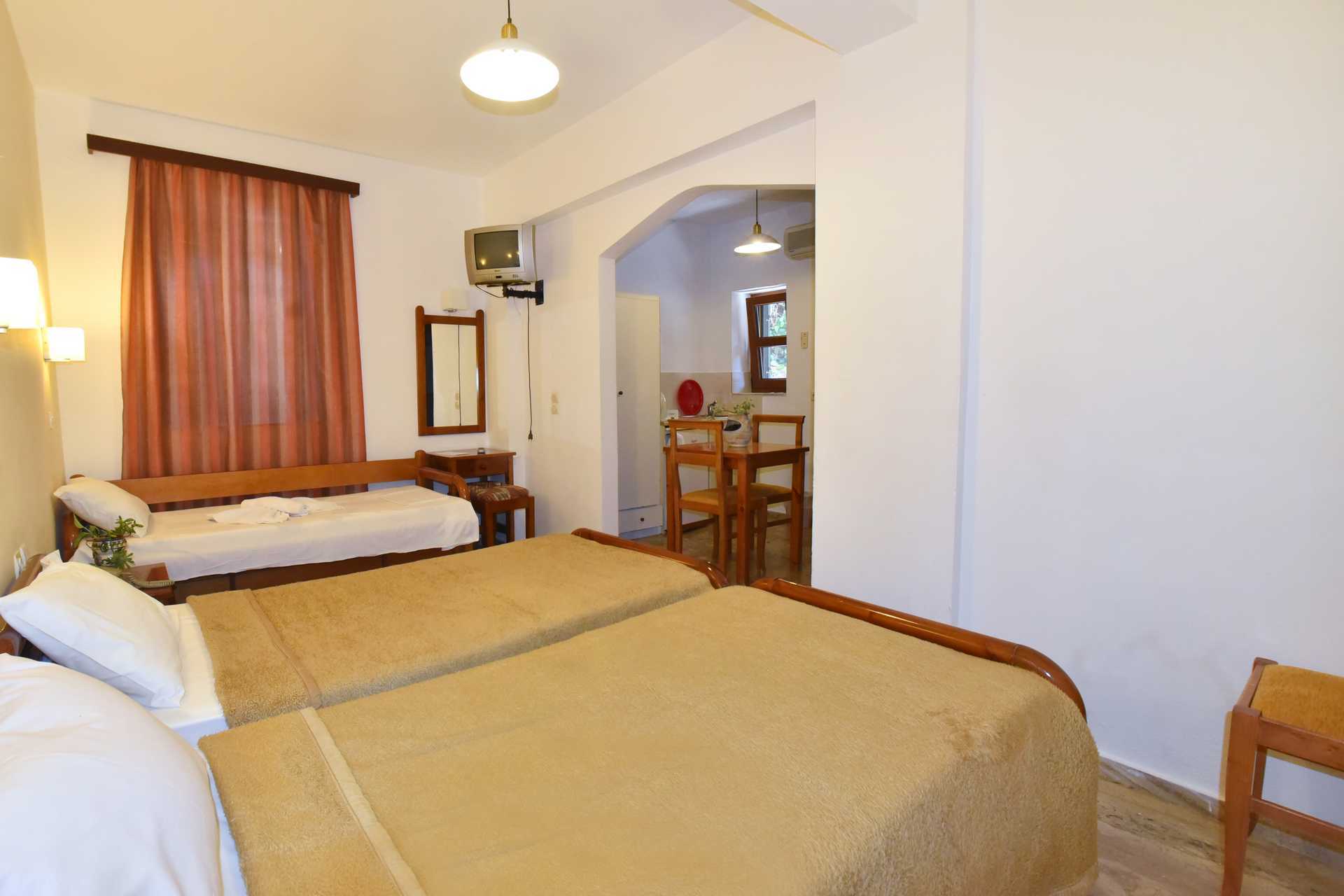 Dubbelrum med balkong eller terrass mot trädgården. Två enkelsängar. Möjlighet till extrabädd i bäddsoffa. Kylskåp. Wifi, luftkonditionering och deponering ingår. Tv med internationella kanaler. Hårtork. Badrum med dusch och wc. Städning 6 ggr/vecka.