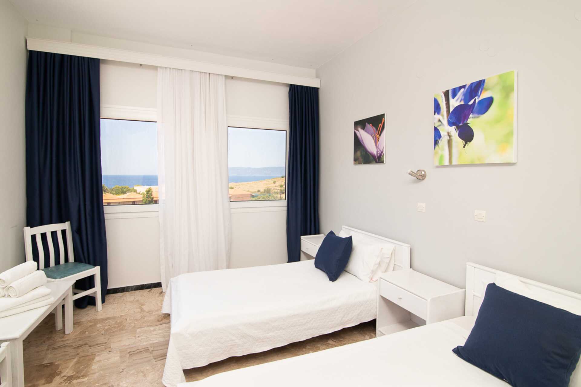 Superiorrum med markterrass. Sovrum och ett vardagsrum. Två enkelsängar. Möjlighet till extrabäddar i en bäddsoffa. Kylskåp. Vattenkokare. Wifi, luftkonditionering och deponering ingår. Tv med internationella kanaler. Hårtork. Badrum med dusch och wc. Städning 7 ggr/vecka.