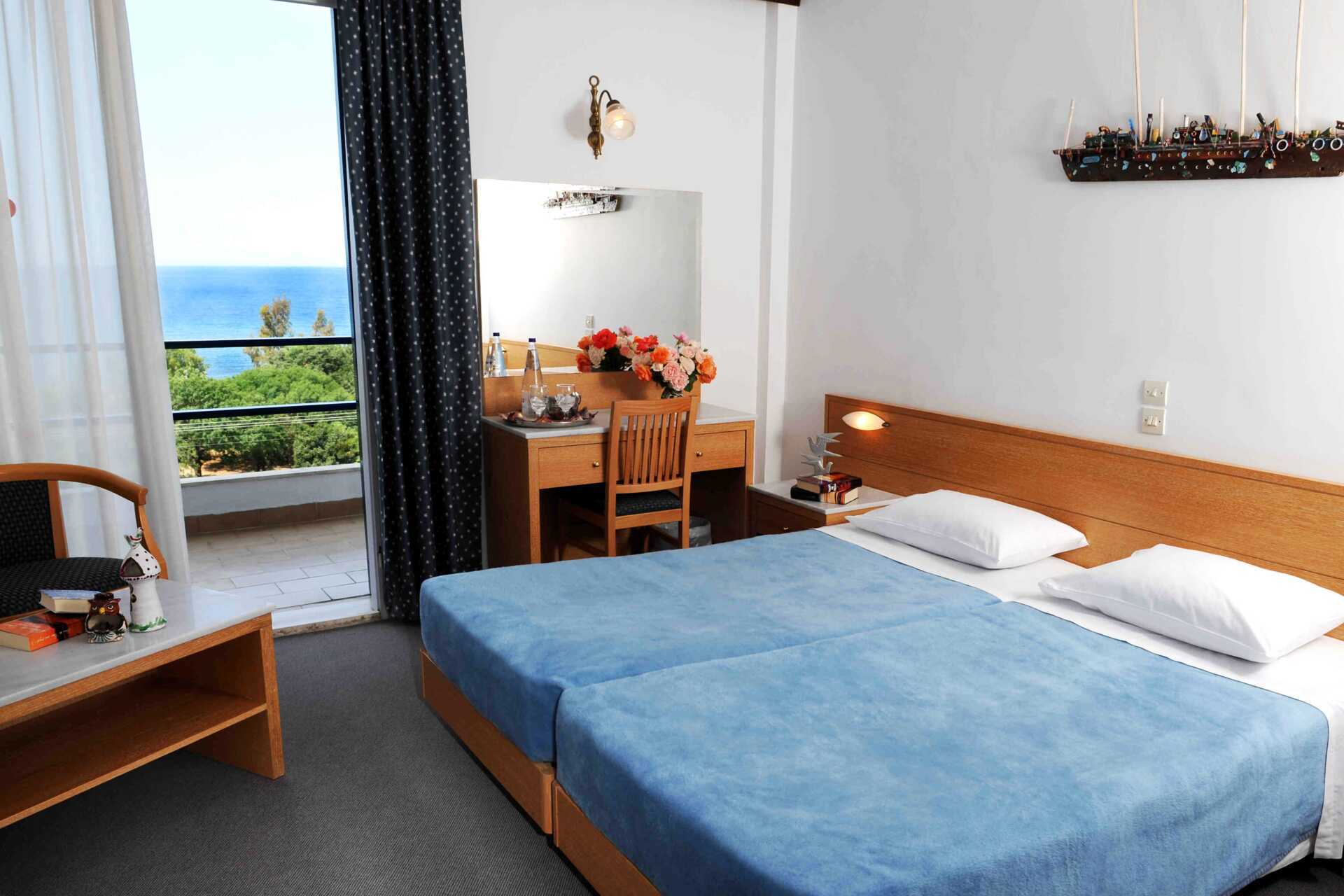 Dubbelrum med balkong och havsutsikt. En dubbelsäng eller två enkelsängar. Möjlighet till en extrabädd för ett barn. Wifi, luftkonditionering och deponering ingår. Minibar. Tv med internationella kanaler. Hårtork. Badrum med dusch och wc. Städning 6 ggr/vecka.