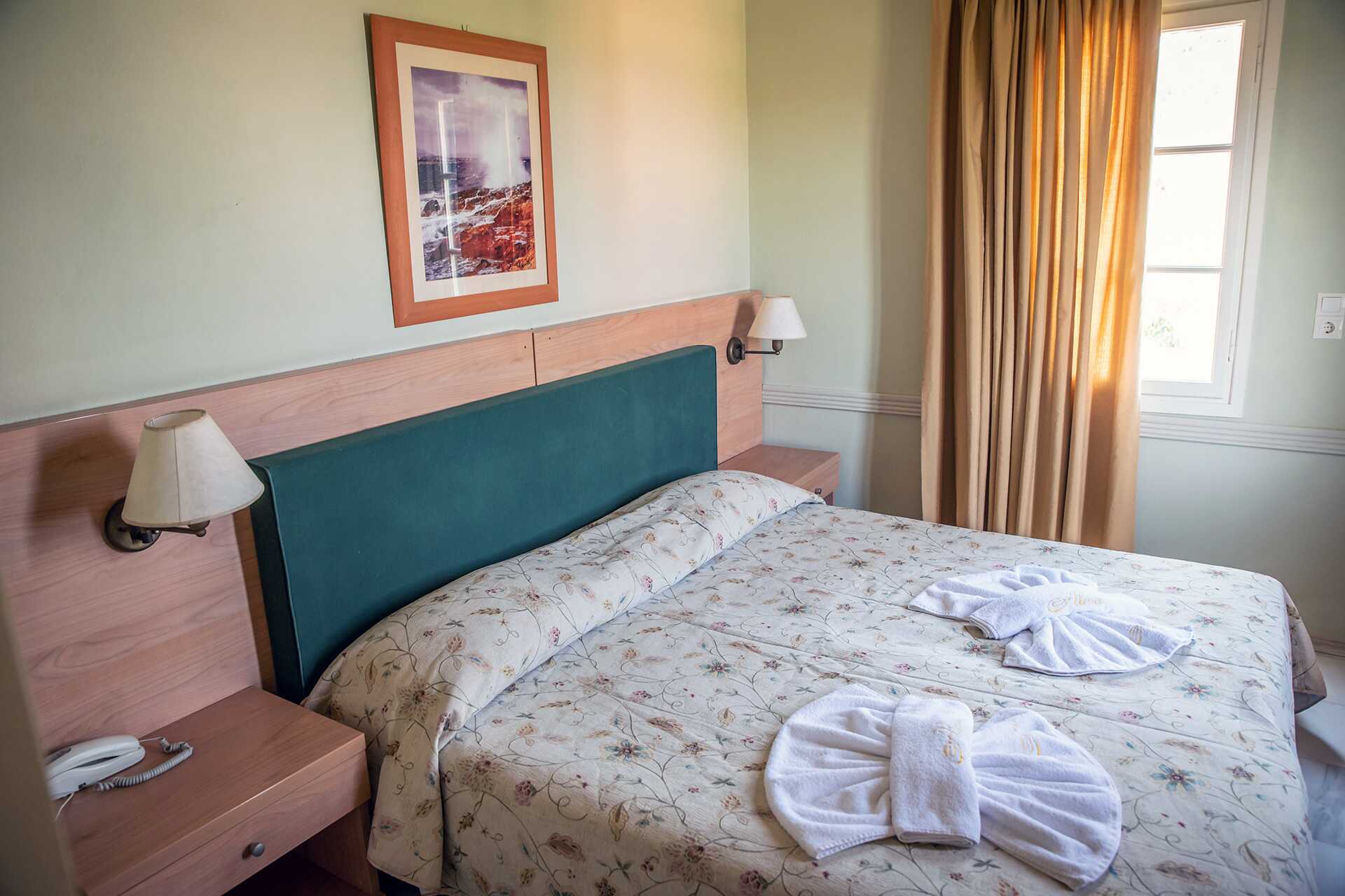 Dubbelrum med balkong eller terrass. En dubbelsäng eller två enkelsängar. Möjlighet till extrabädd i enkelsäng. Luftkonditionering ingår. Deponering mot avgift. Kylskåp. Tv med internationella kanaler. Hårtork. Badrum med dusch och wc. Städning 7 ggr/vecka. Barn under två år räknas in i maxantalet personer i rummet.