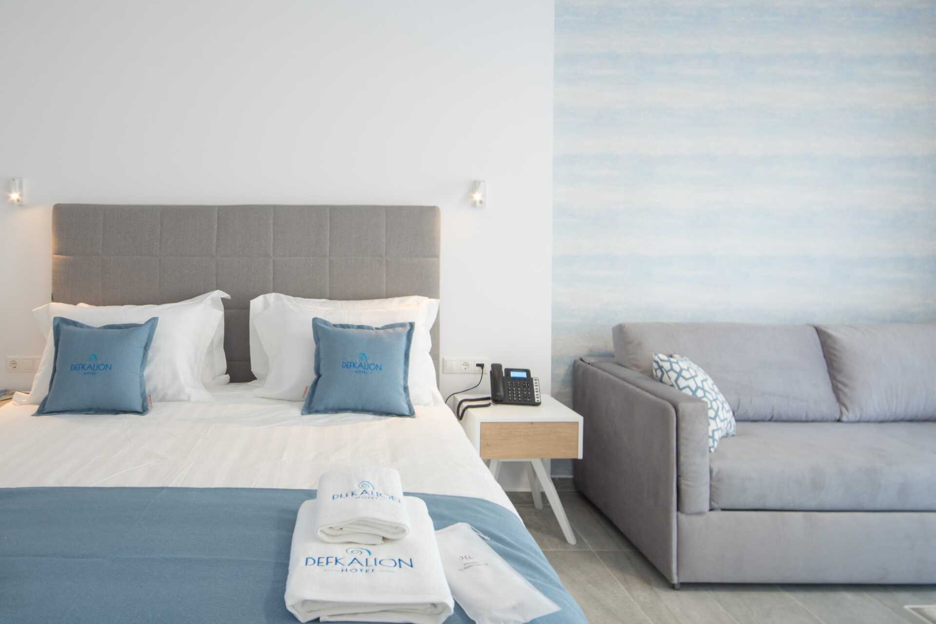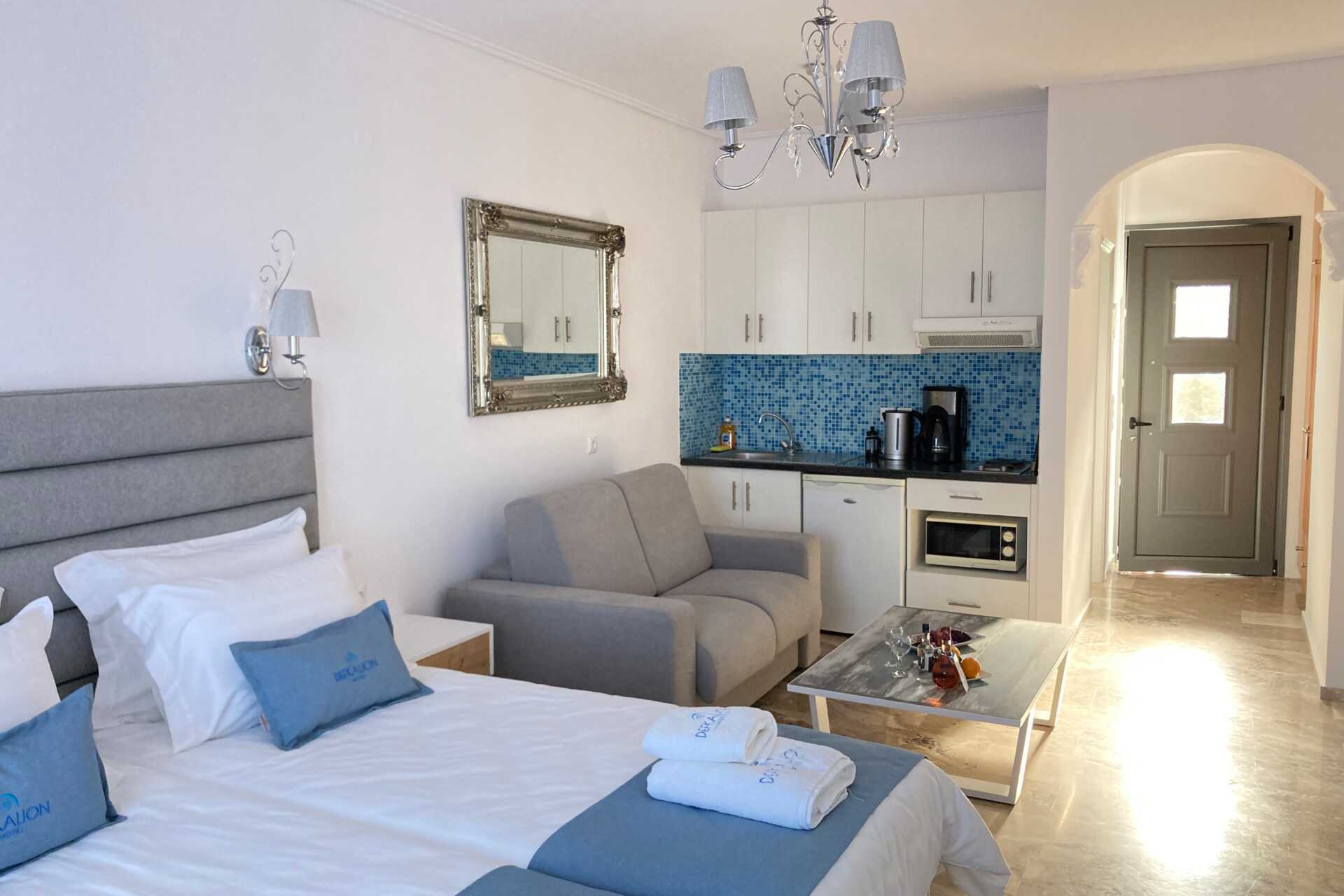Enrumslägenhet deluxe med balkong eller terrass. Sovrum kombinerat med minikök. En dubbelsäng eller två enkelsängar. Möjlighet till extrabädd i en bäddsoffa. Minikök med kokplattor, ugn, vattenkokare, kaffebryggare, mikrovågsugn, brödrost, Nespresso-maskin - kapslar ingår vid ankomst samt enkel köksutrustning. Matplats vid bardisk. Wifi, luftkonditionering och deponering ingår. Tv med internationella kanaler. Strykjärn. Badrockar och tofflor. Hårtork. Badrum med dusch och wc. Städning 6 ggr/vecka.