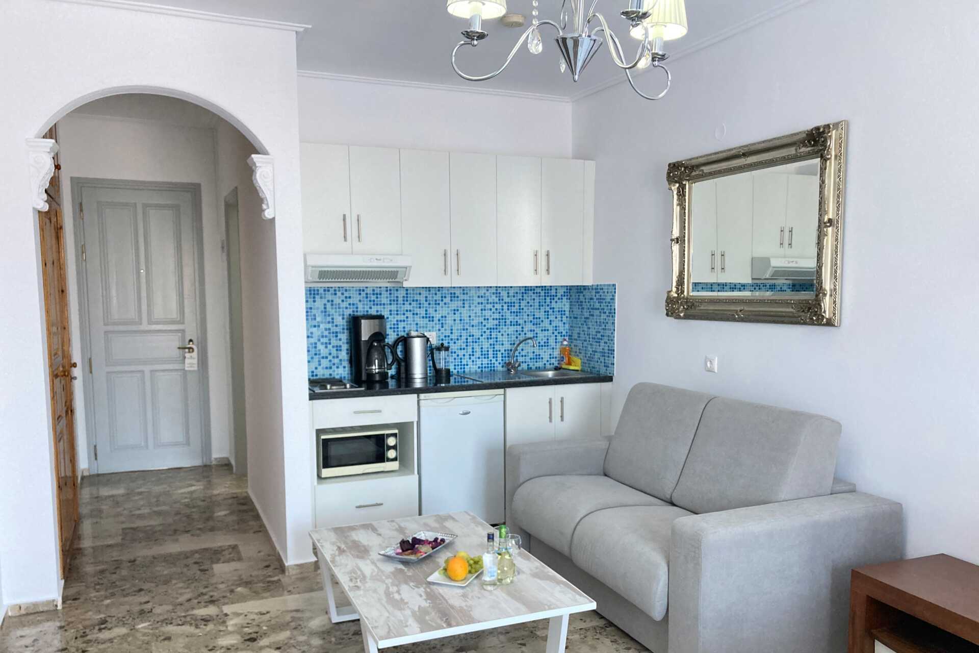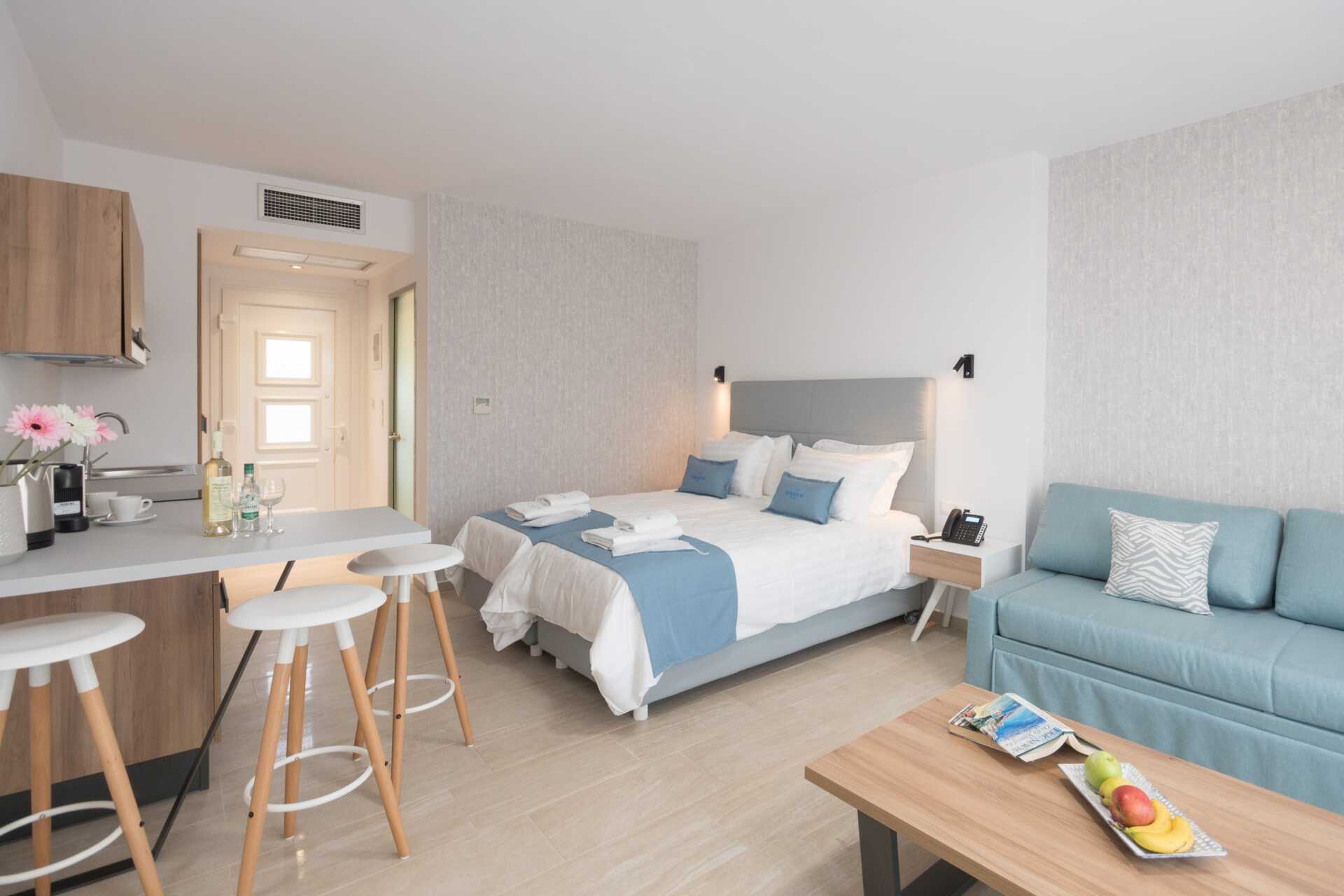 Enrumslägenhet med balkong eller terrass. Sovrum kombinerat med minikök. En dubbelsäng eller två enkelsängar. Möjlighet till extrabädd i en bäddsoffa. Minikök med kokplattor, vattenkokare, kaffebryggare, mikrovågsugn, brödrost och enkel köksutrustning. Wifi, luftkonditionering och deponering ingår. Tv med internationella kanaler. Badrockar och tofflor. Hårtork. Badrum med dusch och wc. Städning 6 ggr/vecka.