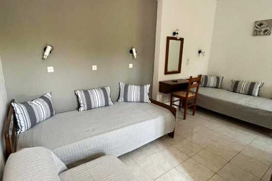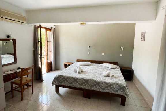 Tvårumslägenhet med markterrass. Två rum med, ett med två enkelsängar, ett med möjlighet till extrabädd i enkelsäng. Minikök med kokplattor, kylskåp och enkel köksutrustning. Wifi, luftkonditionering och deponering ingår. Badrum med dusch och wc. Städning 6 ggr/vecka.