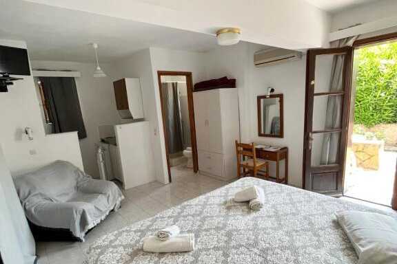 Enrumslägenhet med markterrass. Kombinerat sovrum med minikök. En dubbelsäng eller två enkelsängar. Minikök med kokplattor, kylskåp och enkel köksutrustning. Wifi, luftkonditionering och deponering ingår. Badrum med dusch och wc. Städning 6 ggr/vecka.