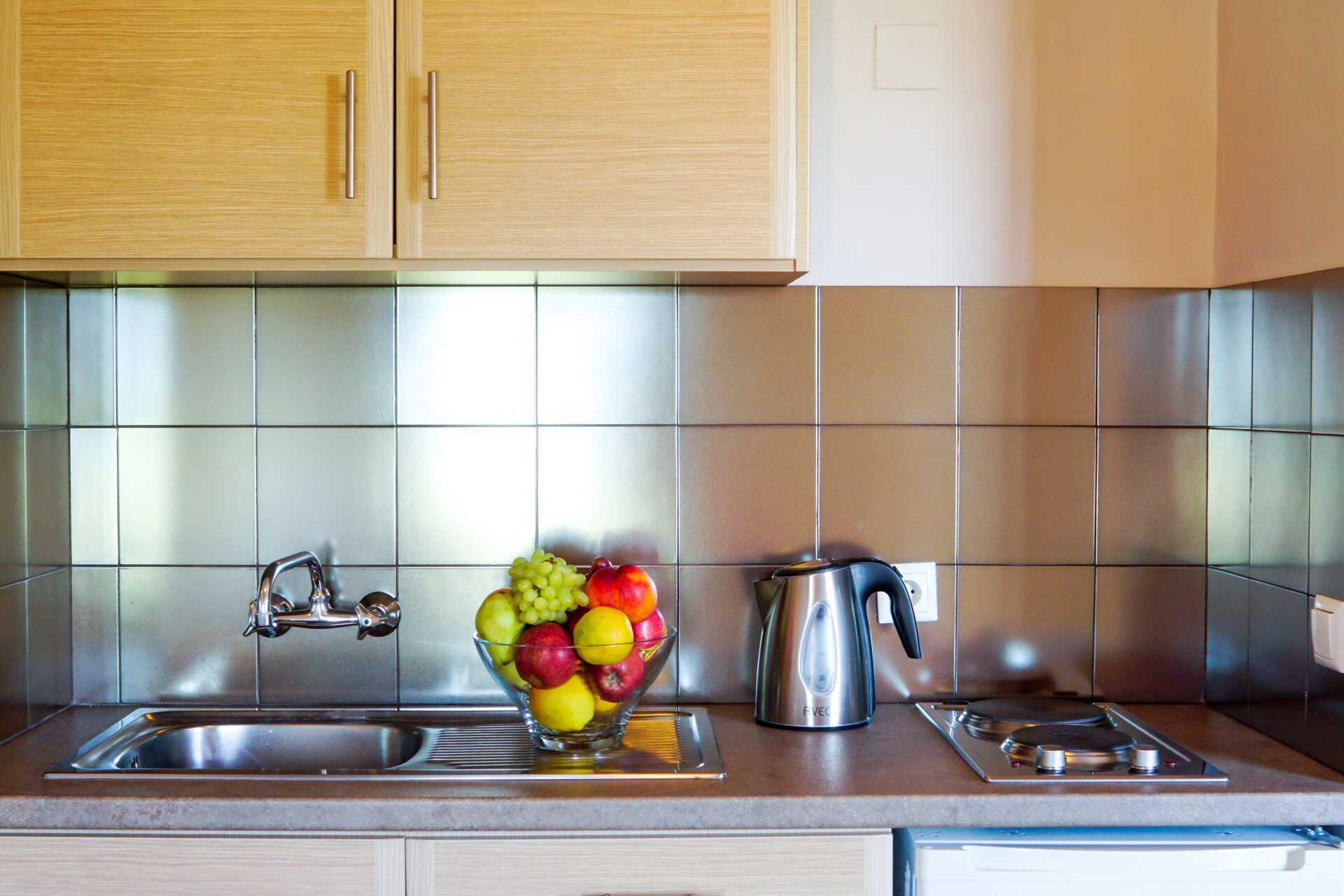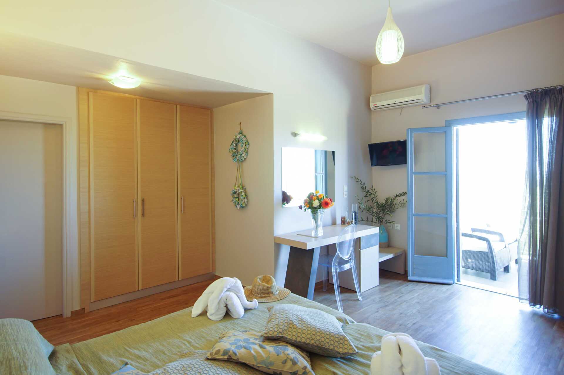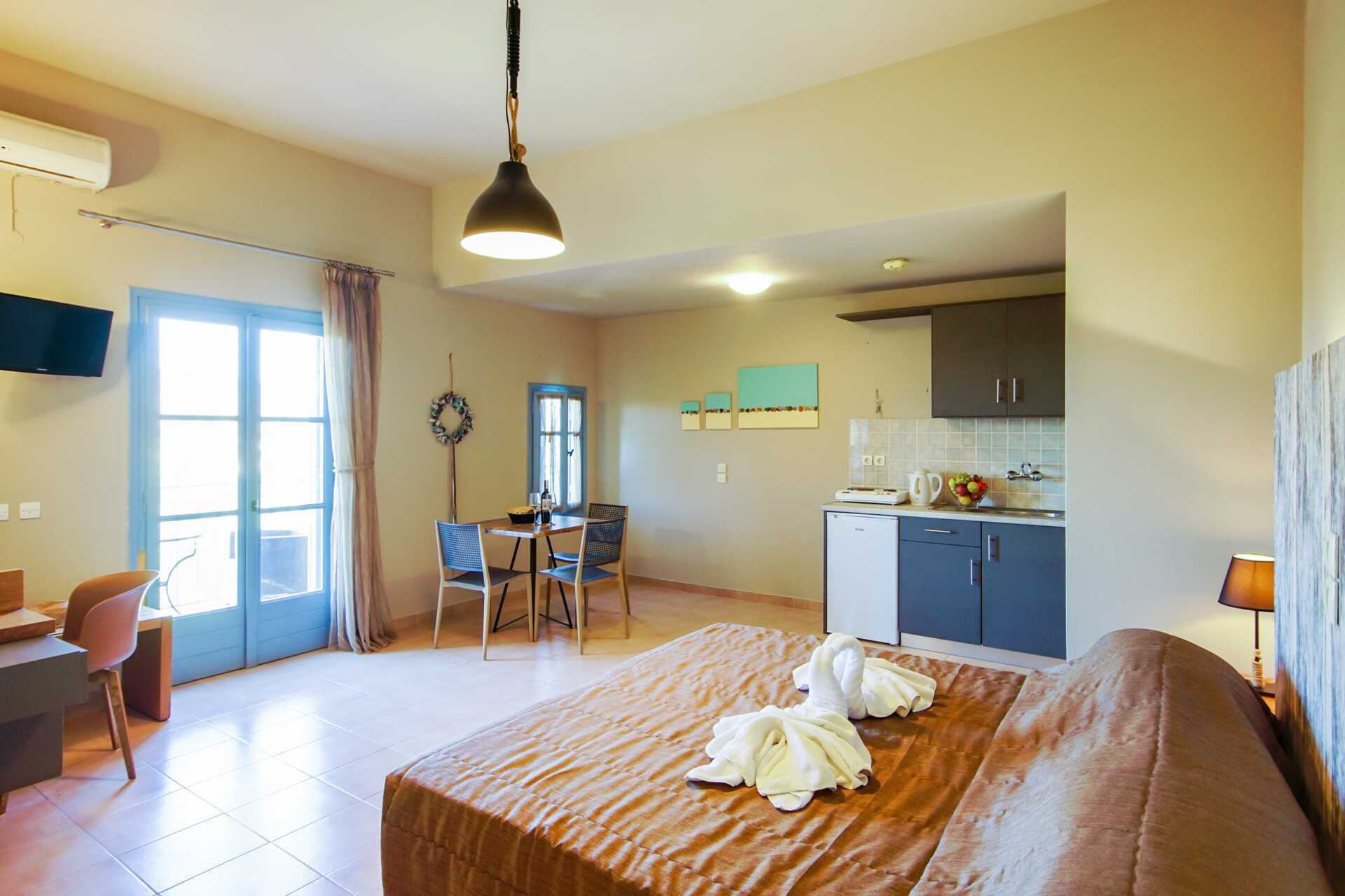 Renoverad enrumslägenhet med balkong eller terrass, vissa med begränsad havsutsikt. Kombinerat sovrum med minikök. En dubbelsäng eller två enkelsängar. Möjlighet till extrabädd i bäddsoffa. Wifi och luftkonditionering ingår. Minikök med kokplattor, kylskåp, vattenkokare samt enkel köksutrustning. Tv med internationella kanaler. Badrum med dusch och wc. Städning 6 ggr/vecka.