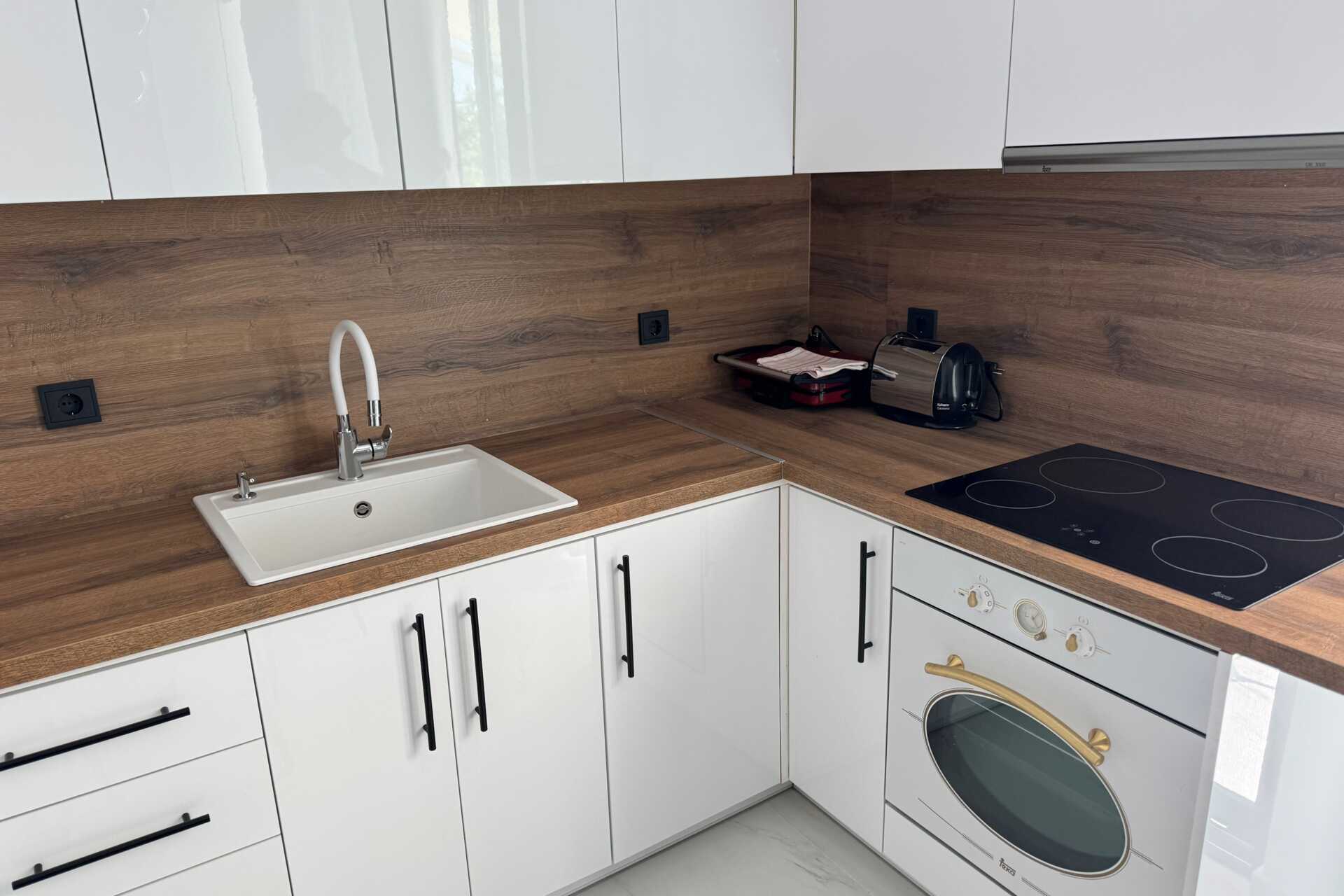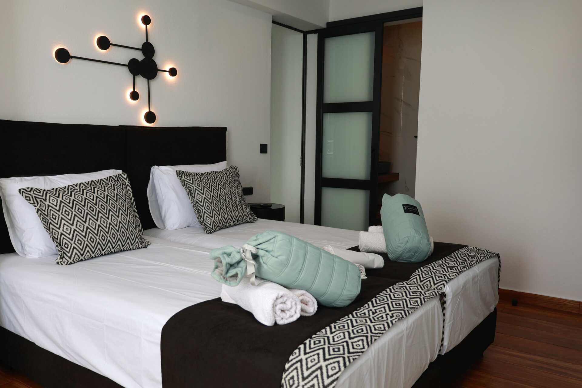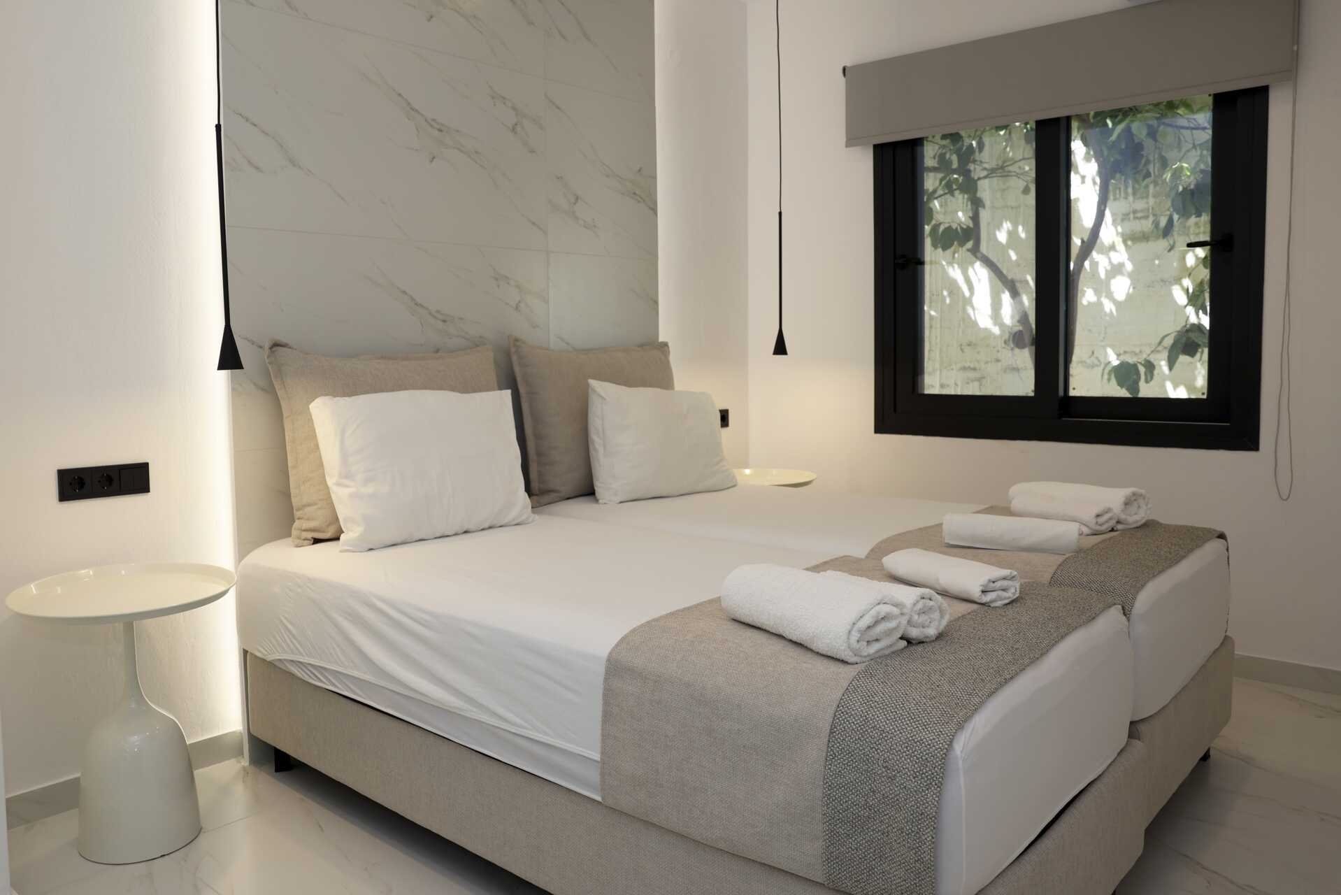 Trerumslägenhet med balkong och havsutsikt. Två sovrum och ett kombinerat vardagsrum med minikök. Nivåskillnader med några trappsteg inne i lägenheten. Två enkelsängar i varje sovrum. Möjlighet till extrabäddar i våningssäng. Minikök med kokplattor, ugn, kylskåp, mikrovågsugn, kaffebryggare, vattenkokare, brödrost, smörgåsgrill och enkel köksutrustning. Wifi, luftkonditionering och deponering ingår. Tv med lokala kanaler. Strykjärn och strykbräda. Hårtork. Badrum med badkar eller dusch samt wc. Städning 5 ggr/vecka.