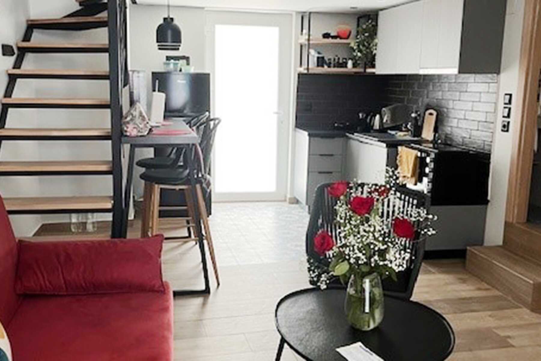 Enrumslägenhet i etage med markterrass. Två enkelsängar eller en dubbelsäng. Möjlighet till extrabädd i bäddsoffa. Minikök med kokplattor, kylskåp, mikrovågsugn, vattenkokare, kaffemaskin och enkel köksutrustning. Wifi, luftkonditionering och deponering ingår. Tv med internationella kanaler. Tvättmaskin. Badrockar. Hårtork. Badrum med dusch och wc. Städning 6 ggr/vecka.