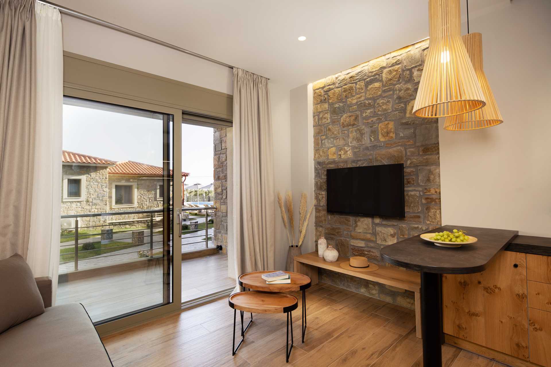 Tvårumslägenhet med balkong, markbalkong eller markterrass. Alla lägenheter med balkong och markbalkong har havsutsikt. Alla lägenheter har individuell inredning. Ett sovrum och ett kombinerat vardagsrum med minikök. En dubbelsäng. Möjlighet till extrabäddar i två bäddsoffor. Minikök med kylskåp, kokplattor, frys, kaffebryggare och enkel köksutrustning. Wifi, luftkonditionering och deponering ingår. Smart-tv. Hårtork. Badrum med badkar samt wc. Städning 6 ggr/vecka.