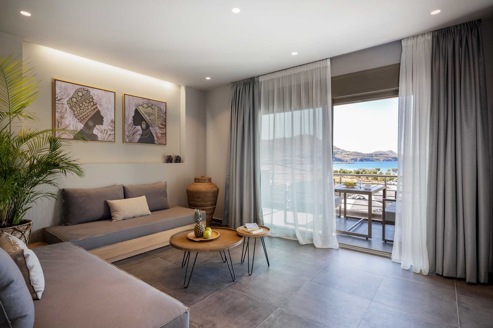 Enrumslägenhet i etage med balkong och havsutsikt. Alla lägenheter har individuell inredning. Ett sovloft med en dubbelsäng en trappa upp och ett kombinerat vardagsrum med minikök med möjlighet till extrabäddar i två bäddsoffor i entréplan. Minikök med kylskåp, kokplattor, frys, kaffebryggare och enkel köksutrustning. Wifi, luftkonditionering och deponering ingår. Smart-tv. Hårtork. Badrum med badkar samt wc. Städning 6 ggr/vecka.
