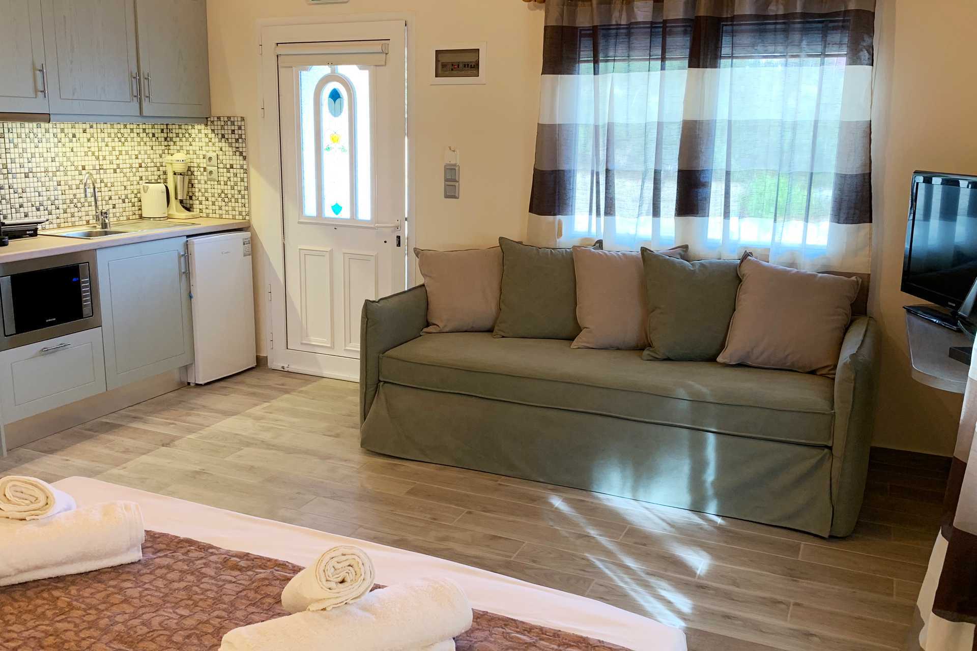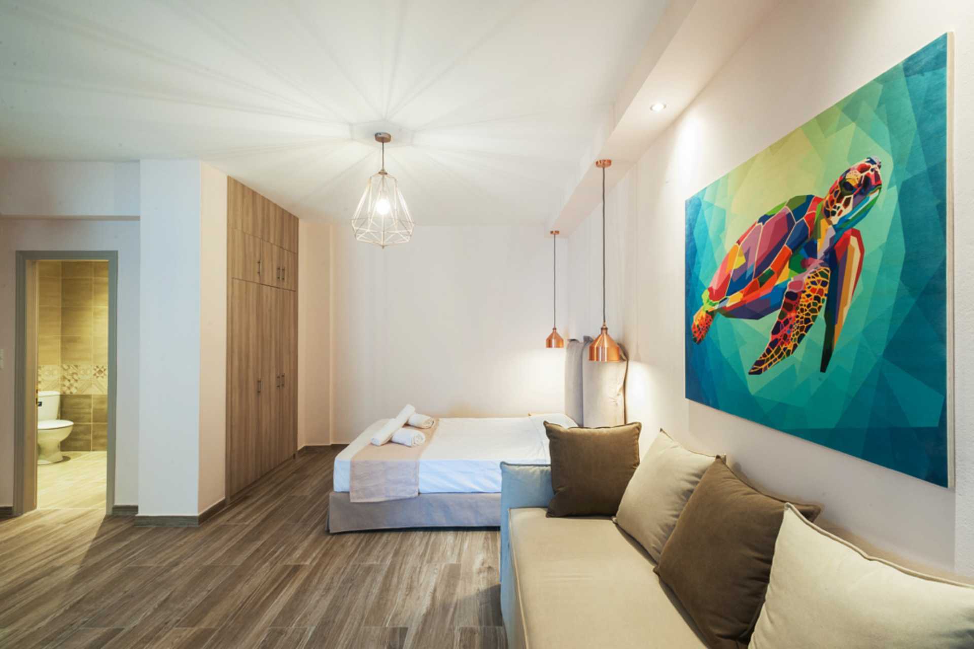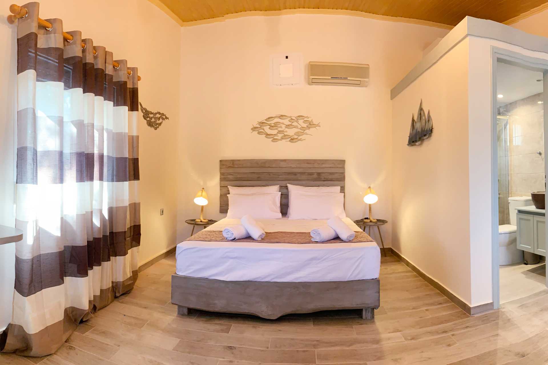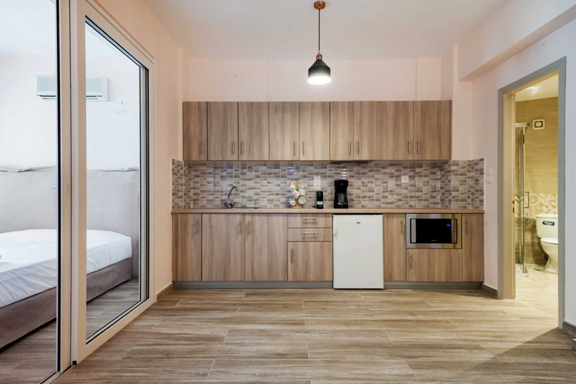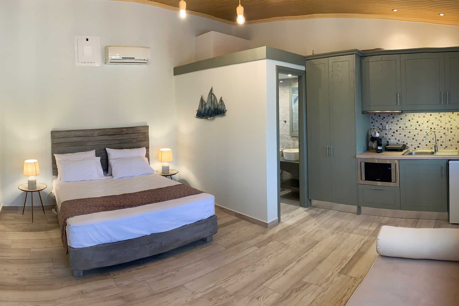 Tvårumslägenhet med balkong eller terrass. Sovrum och kombinerat vardagsrum med minikök. En dubbelsäng som separeras från det kombinerade vardagsrummet/miniköket med en glasvägg. Ytterligare en dubbelsäng i vardagsrummet samt en soffa. Minikök med kylskåp, kokplattor, kaffebryggare, espressomaskin, vattenkokare, mikrovågsugn och enkel köksutrustning. Luftkonditionering och wifi ingår. Tv med internationella kanaler. Hårtork. Badrum med dusch och wc. Städning 6 ggr/vecka.