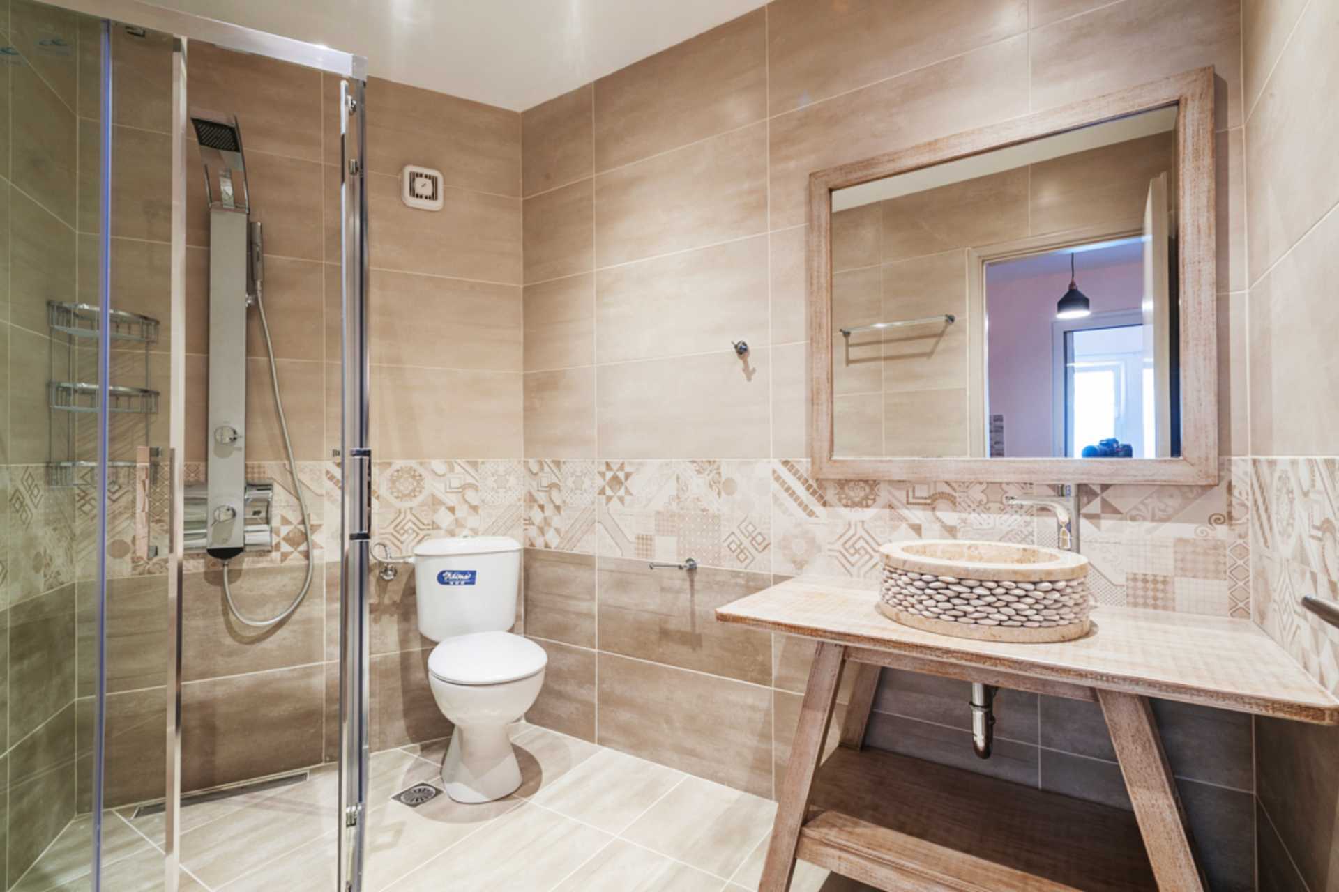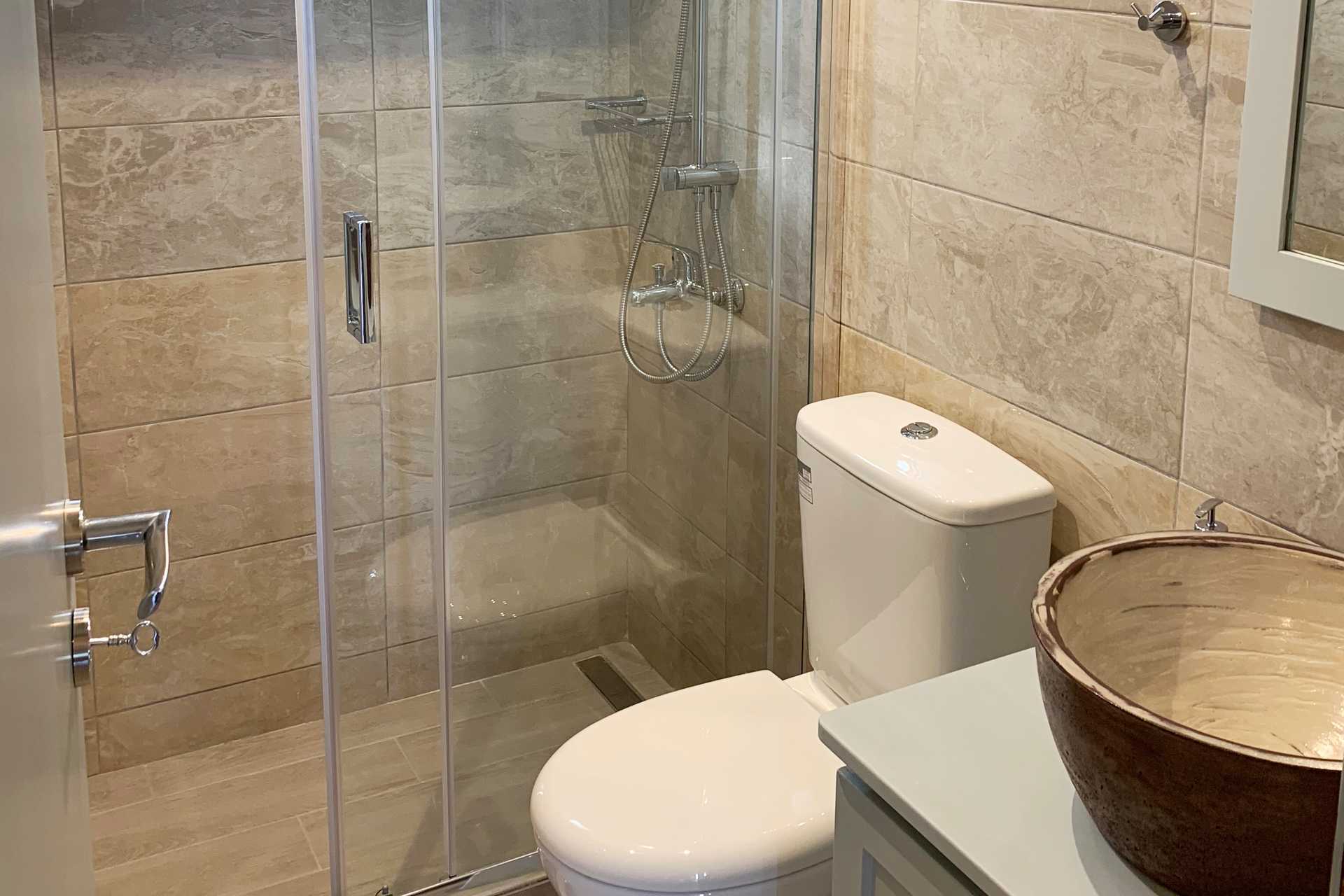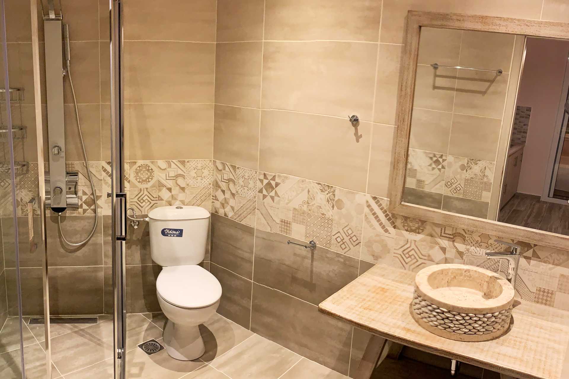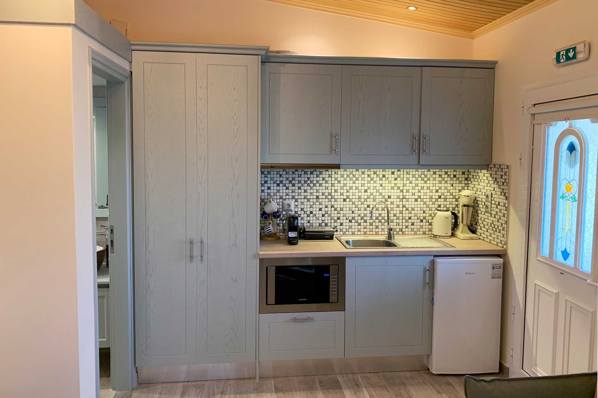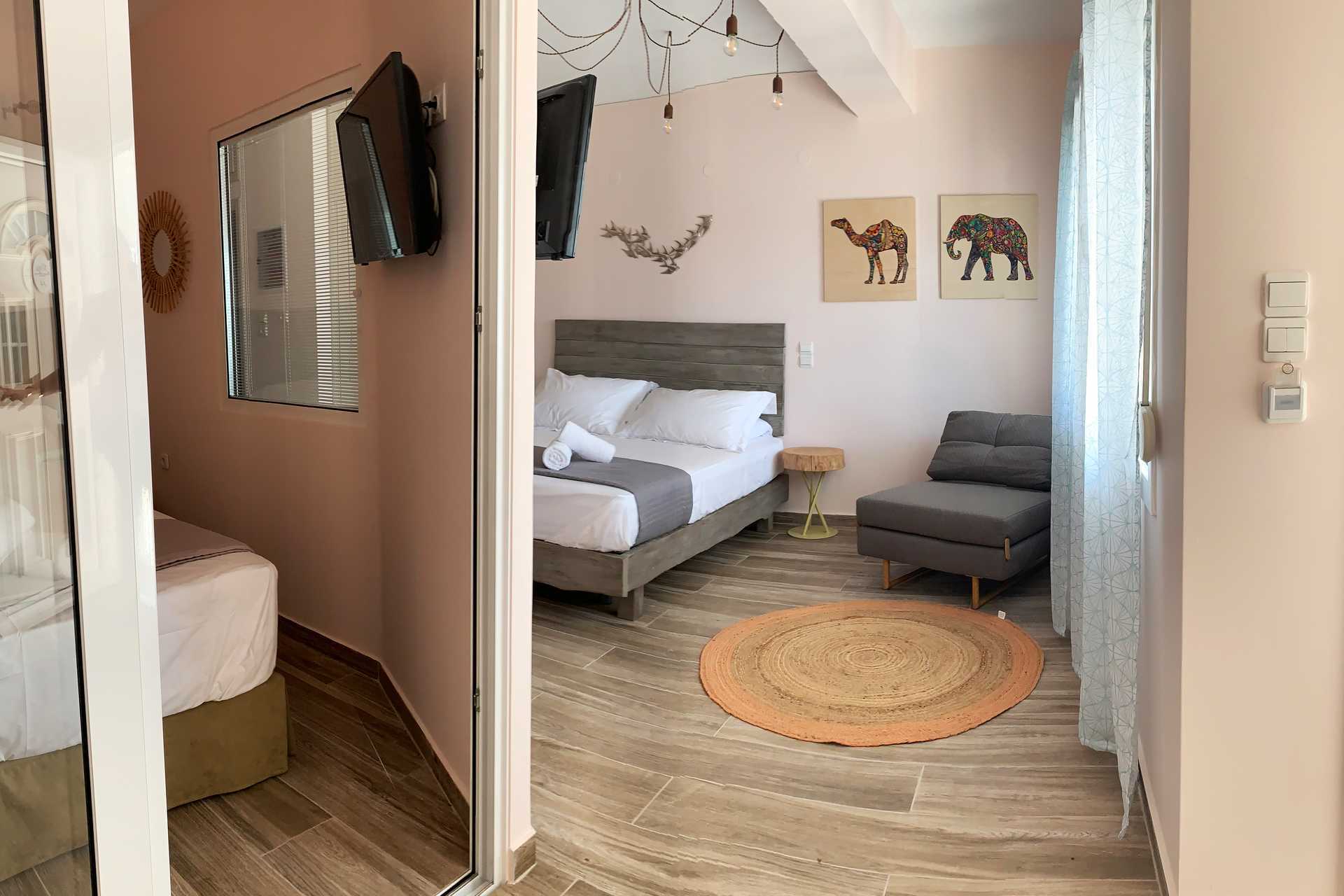 Tvårumslägenhet med balkong eller terrass. Sovrum och kombinerat vardagsrum med minikök. En dubbelsäng som separeras från det kombinerade vardagsrummet/miniköket med en glasvägg. Ytterligare en dubbelsäng i vardagsrummet samt en soffa. Minikök med kylskåp, kokplattor, kaffebryggare, espressomaskin, vattenkokare, mikrovågsugn och enkel köksutrustning. Luftkonditionering och wifi ingår. Tv med internationella kanaler. Hårtork. Badrum med dusch och wc. Städning 6 ggr/vecka.