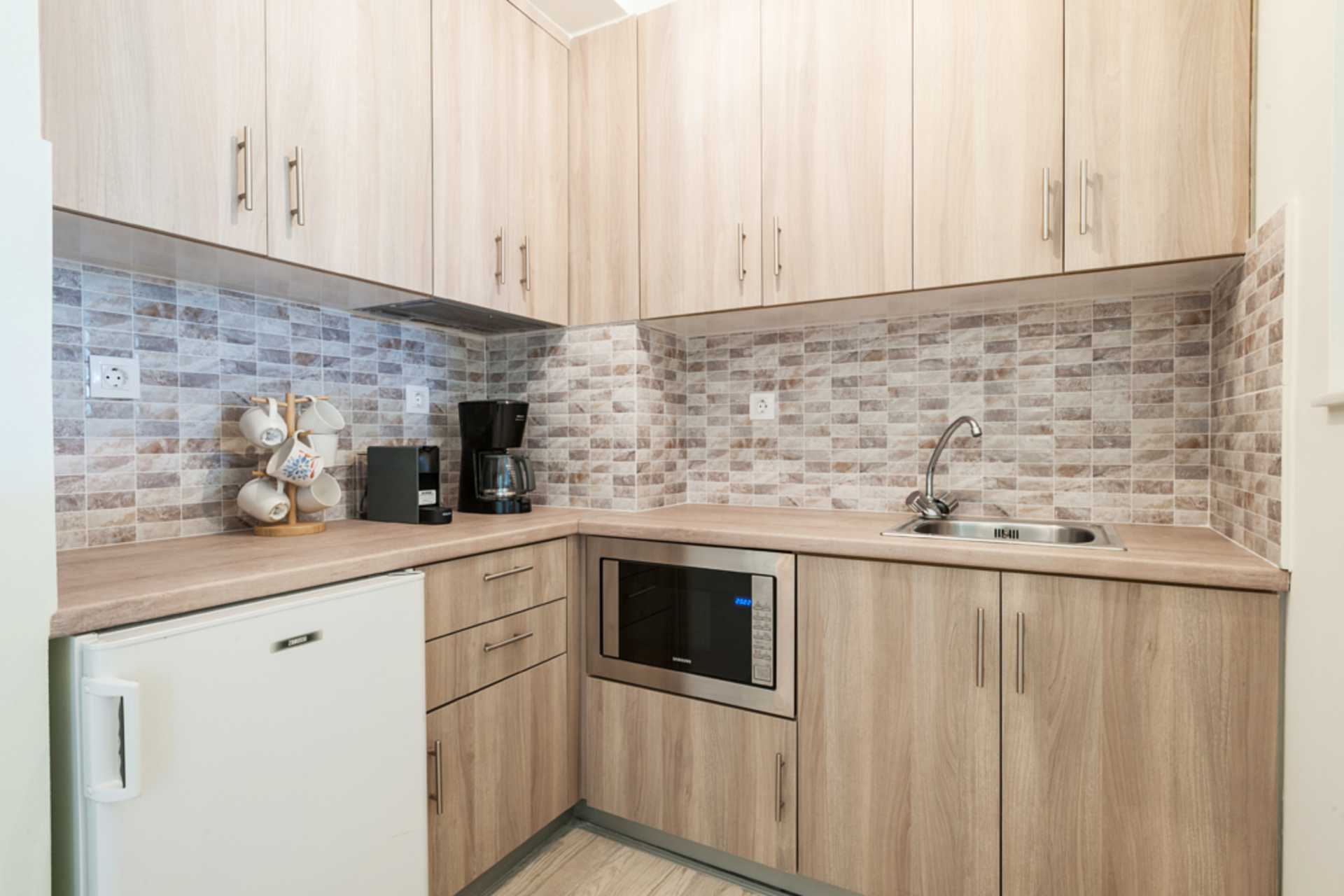 Enrumslägenhet med balkong eller med balkong eller terrass. Kombinerat sovrum och minikök. En dubbelsäng. Möjlighet till extrabädd i bäddsoffa. Minikök med kylskåp, kokplattor, kaffebryggare, espressomaskin, vattenkokare, mikrovågsugn och enkel köksutrustning. Luftkonditionering och wifi ingår. Tv med internationella kanaler. Hårtork. Badrum med dusch och wc. Städning 6 ggr/vecka.