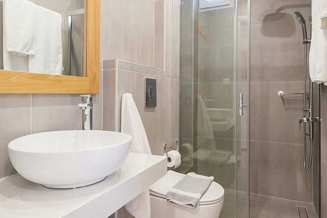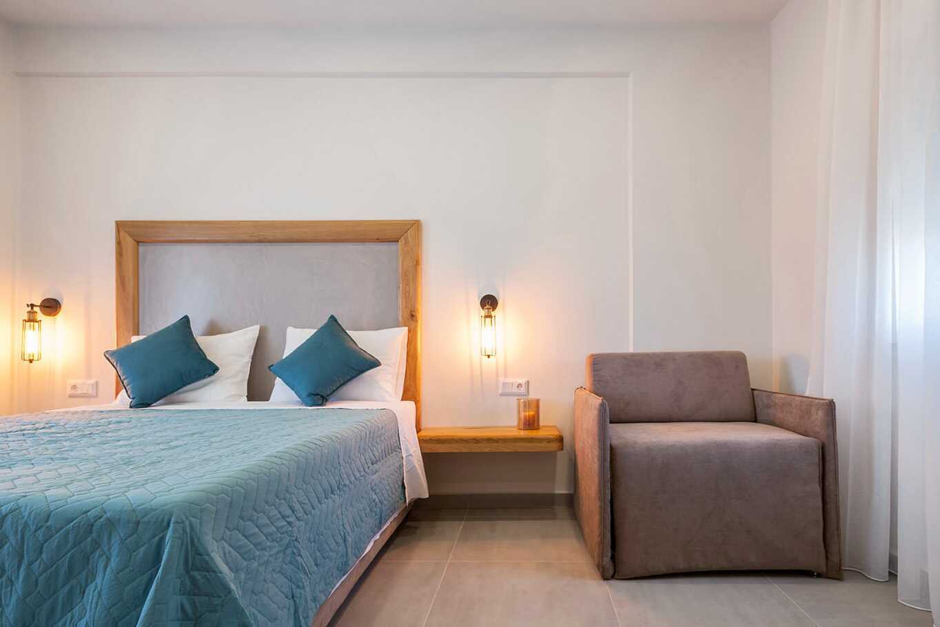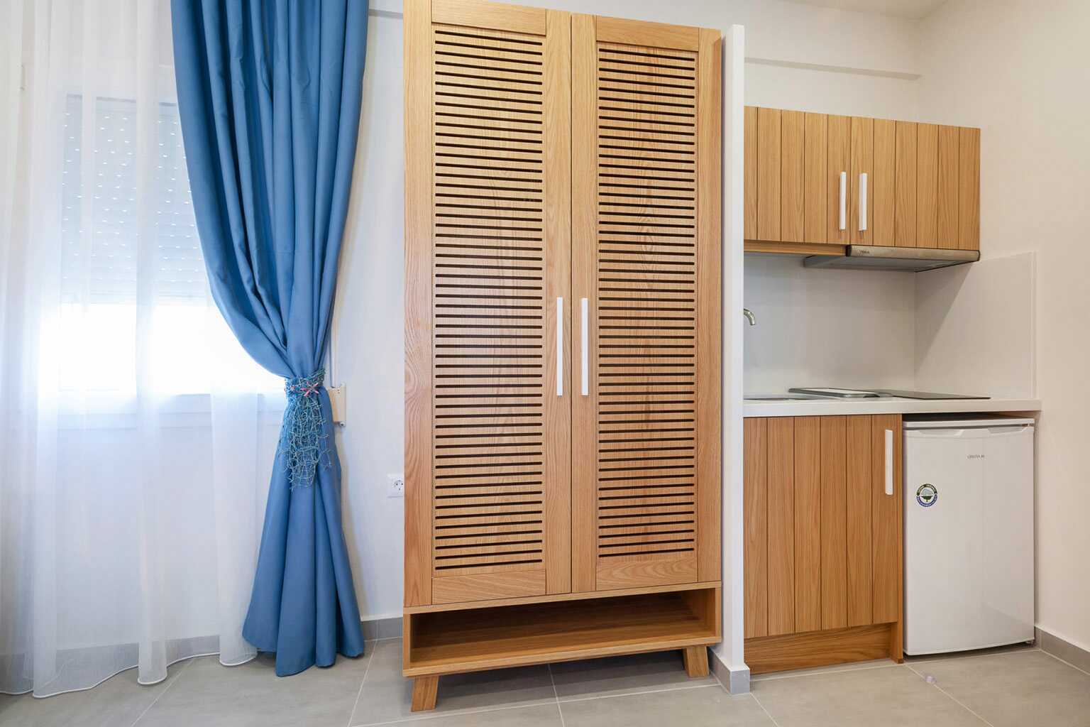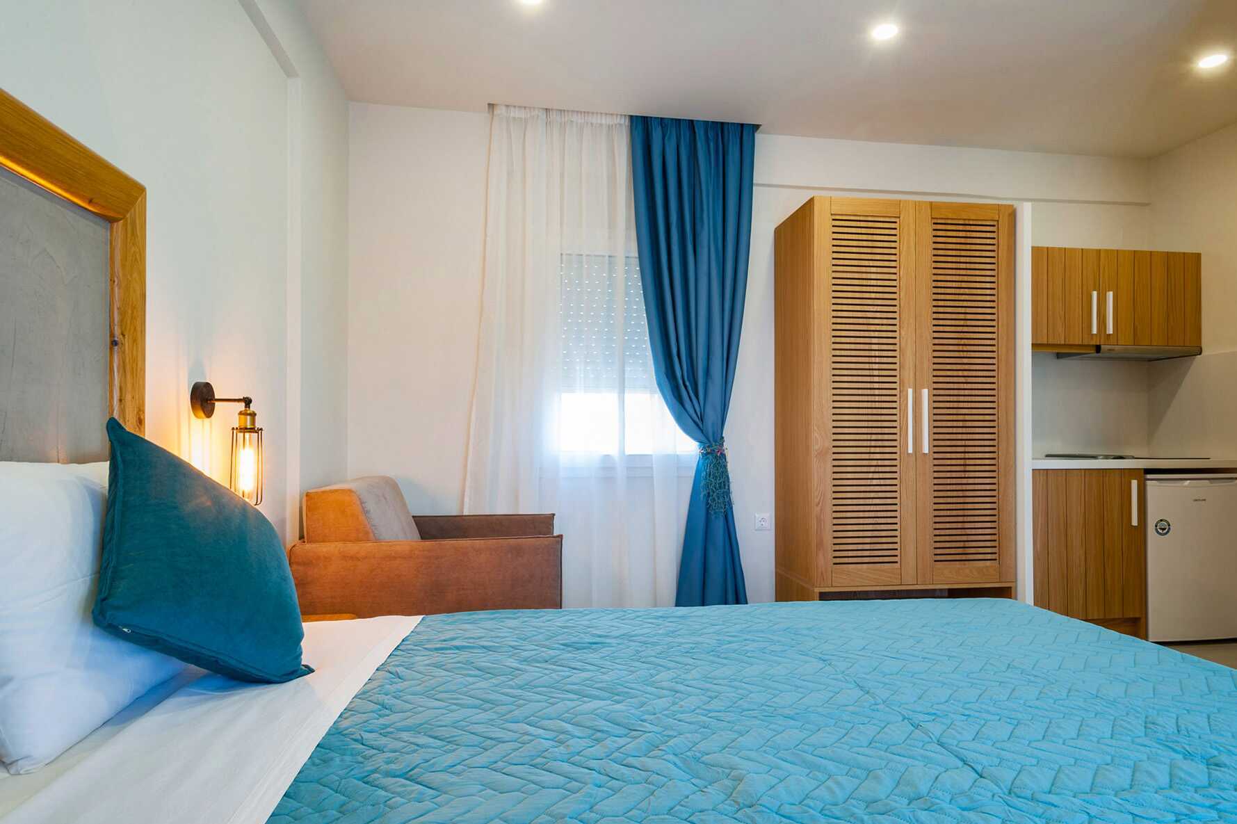 Rymliga enrumslägenheter med balkong och havsutsikt eller markterrass. En dubbelsäng eller två separata sängar. Minikök med kokplattor, kyl och frys samt enkel köksutrustning. Tv. Luftkonditionering och wifi ingår. Hårtork. Bad/dusch och wc. Städning 6 ggr/vecka.