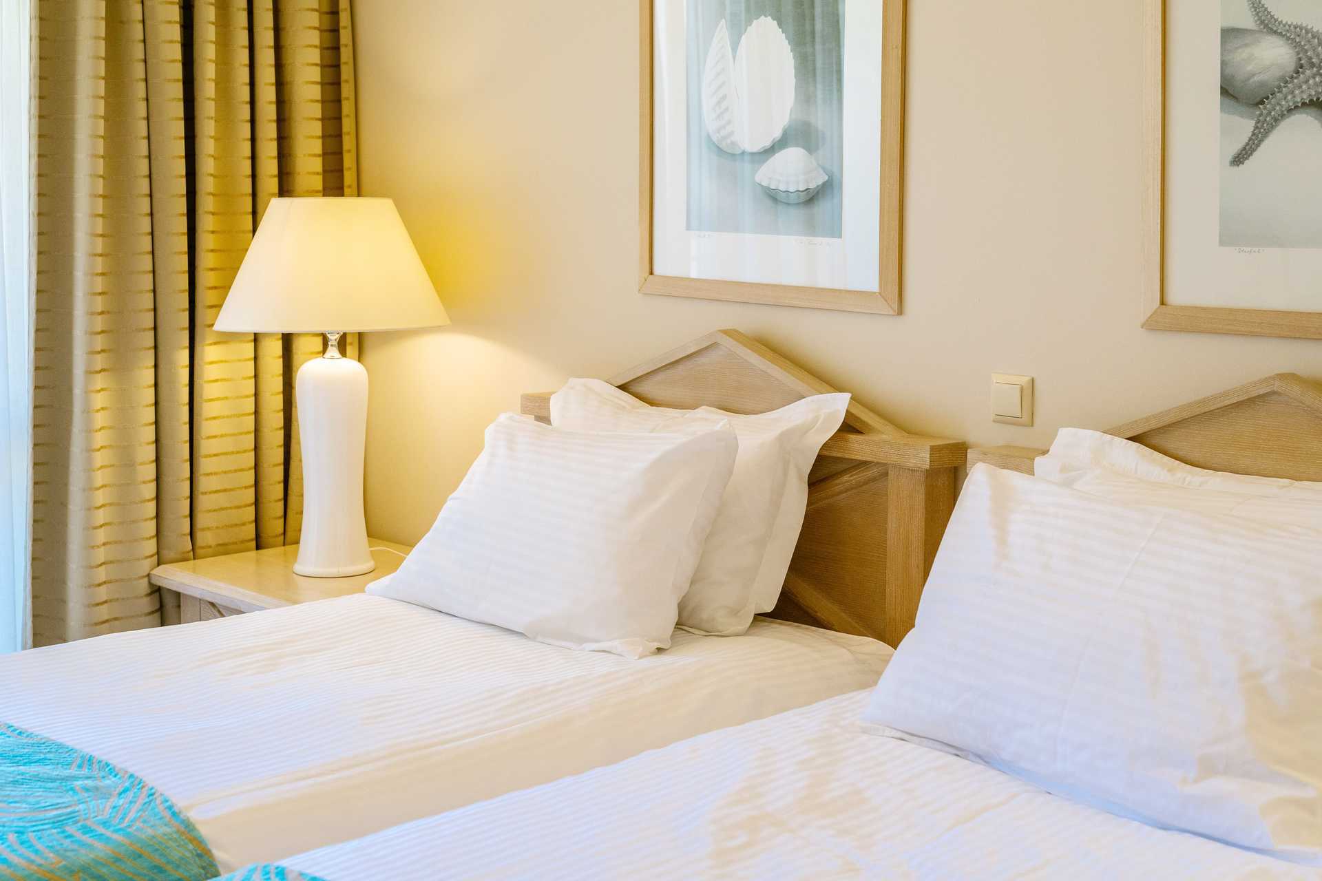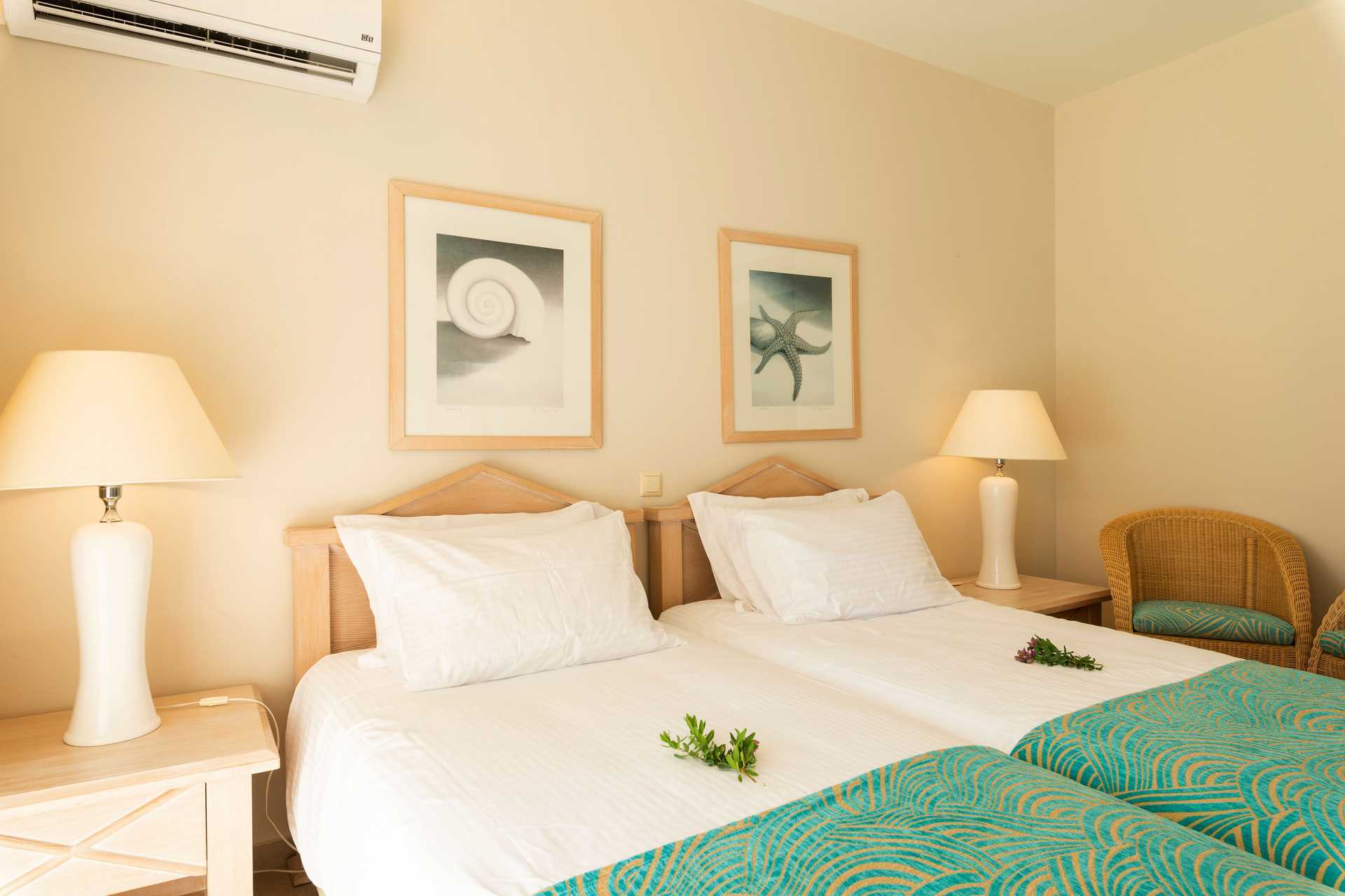 Familjerum med balkong, vissa med havsutsikt. Familjerummet består av två dubbelrum med en förbindelsedörr, ett rum har en balkong med havsutsikt och ett rum har en balkong och ingen specifik utsikt. En dubbelsäng eller två enkelsängar per rum. Wifi, luftkonditionering och deponering ingår. Kylskåp. Vattenkokare samt kaffe och te. Tv med internationella kanaler. Hårtork. Två badrum med badkar eller dusch samt wc. Städning 7 ggr/vecka.