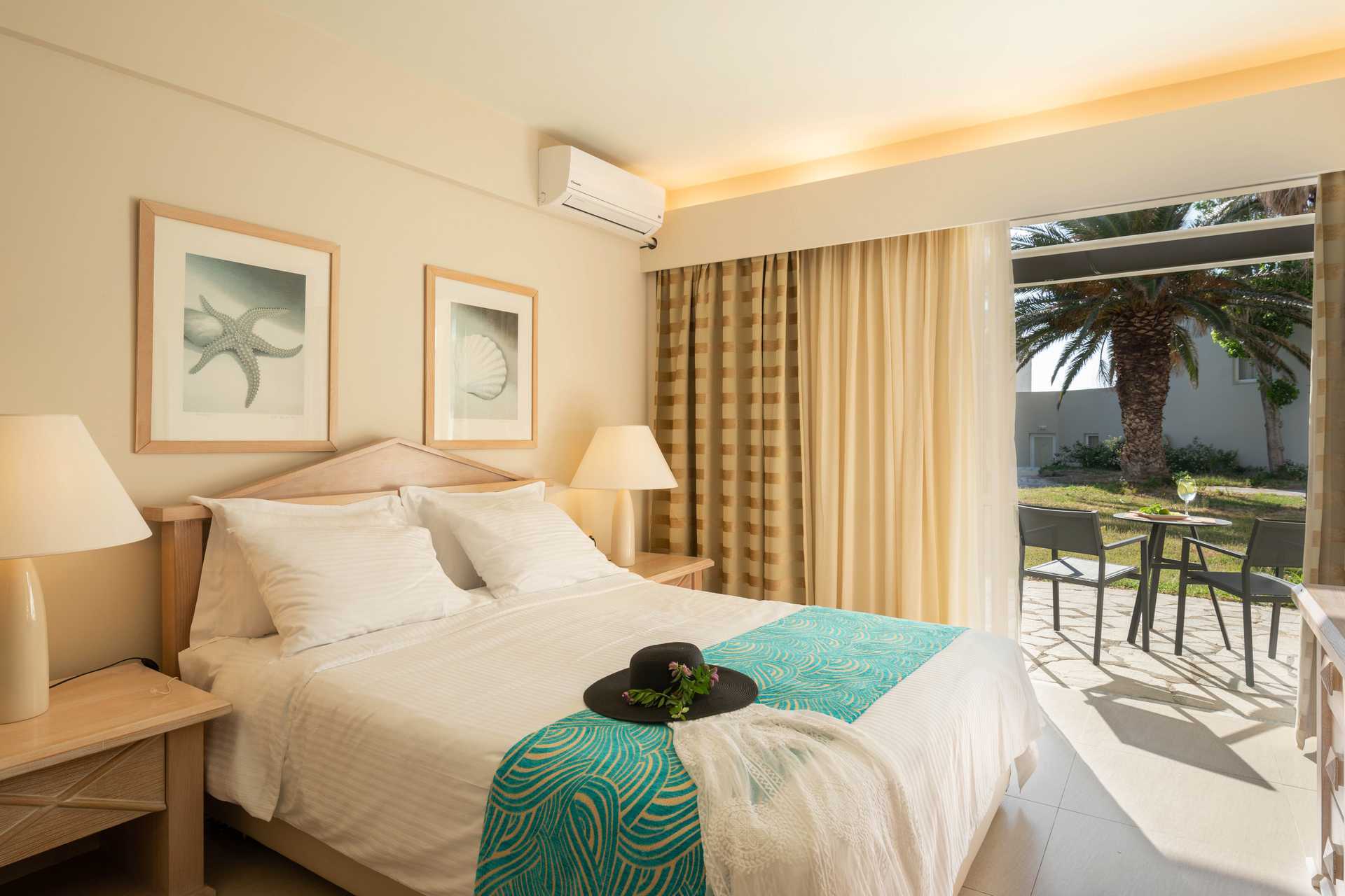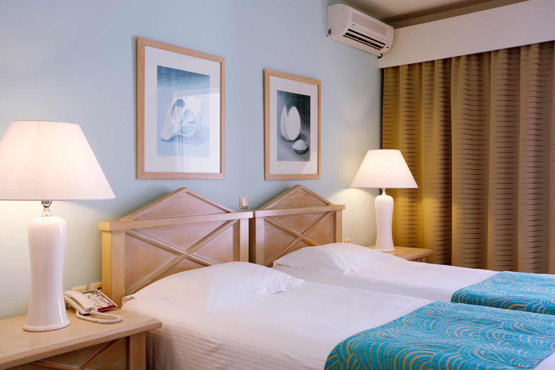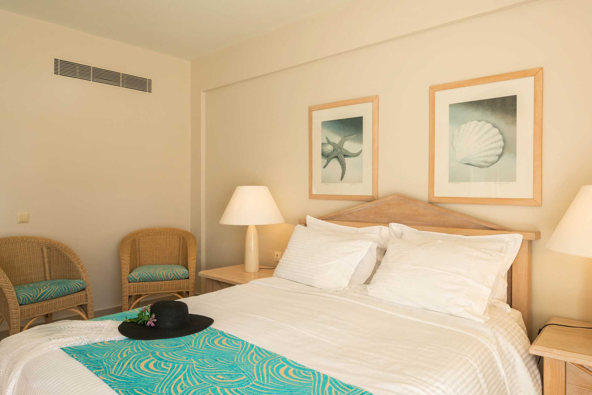 Dubbelrum med balkong, vissa med havsutsikt eller begränsad havsutsikt eller med stor balkong. En dubbelsäng eller två enkelsängar. Möjlighet till extrabädd i hopfällbar säng. Wifi, luftkonditionering och deponering ingår. Kylskåp. Vattenkokare samt kaffe och te. Tv med internationella kanaler. Hårtork. Badrum med badkar eller dusch samt wc. Städning 7 ggr/vecka.