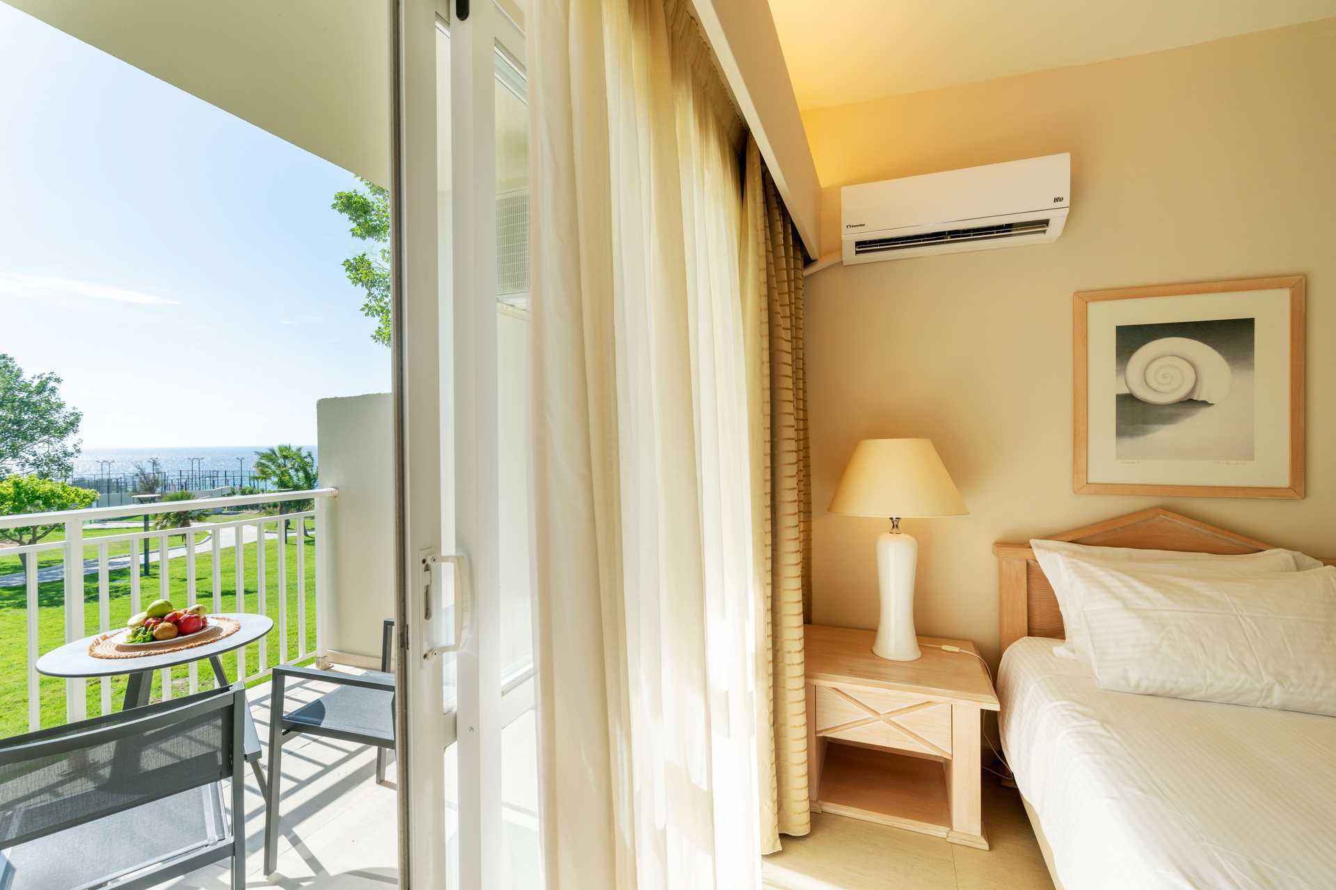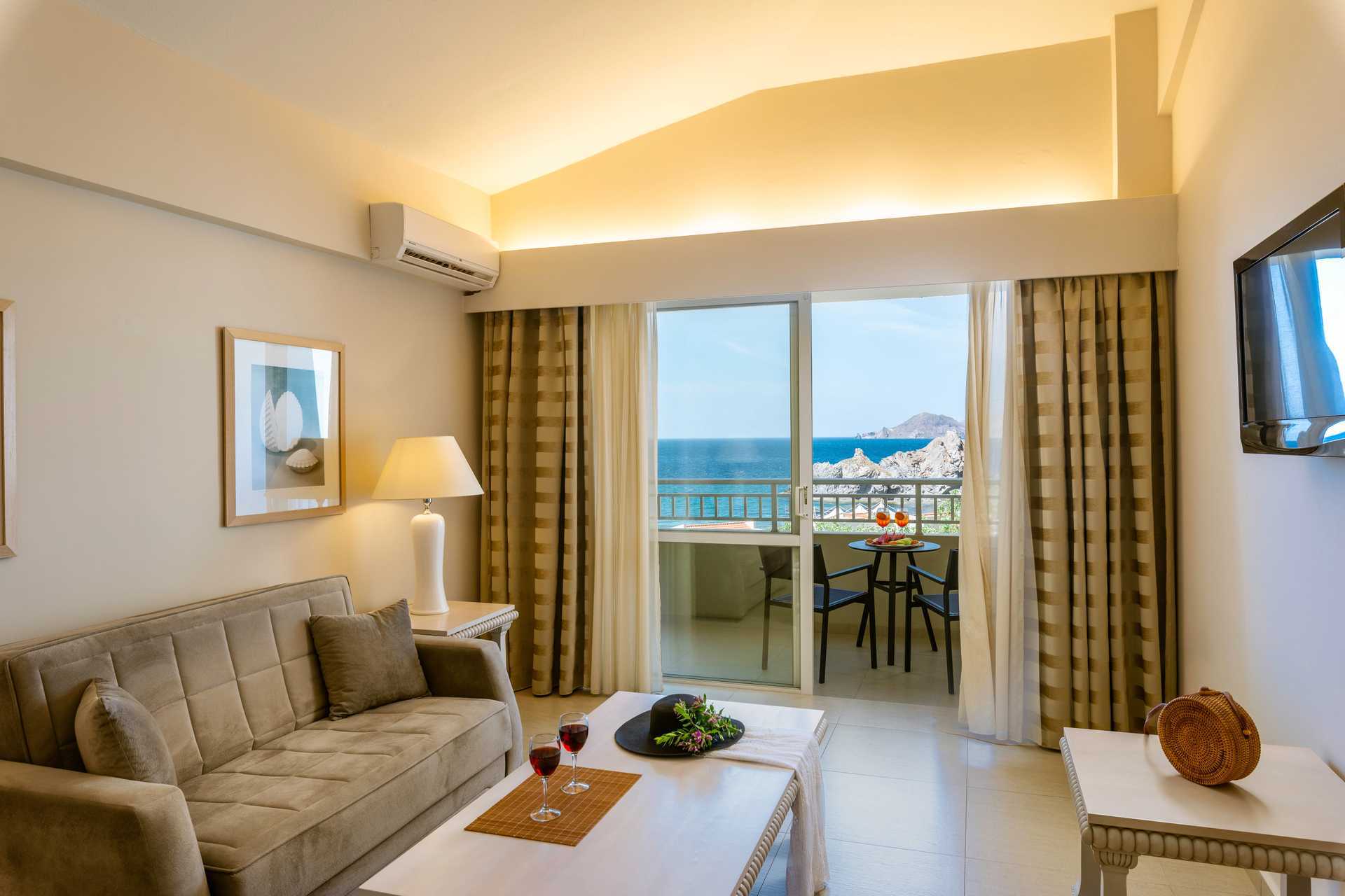 Juniorsvit med balkong och havsutsikt. Ett sovrum och en lounge/vardagsrum. En dubbelsäng. Möjlighet till extrabädd i bäddsoffa. Wifi, luftkonditionering och deponering ingår. Kylskåp. Vattenkokare samt kaffe och te. Tv med internationella kanaler. Hårtork. Badrum med badkar eller dusch samt wc. Städning 7 ggr/vecka.